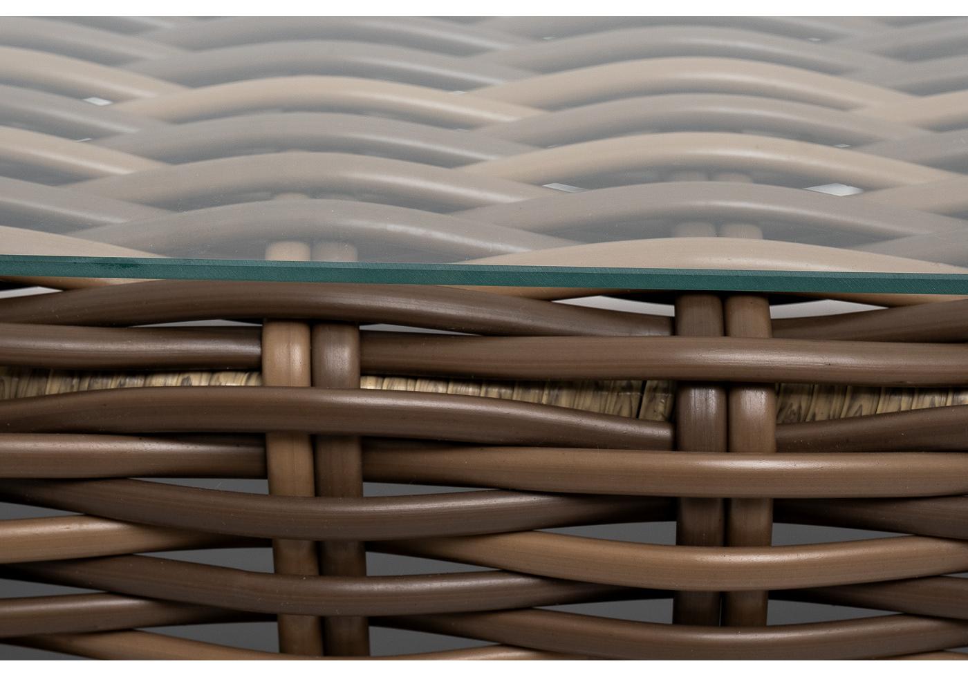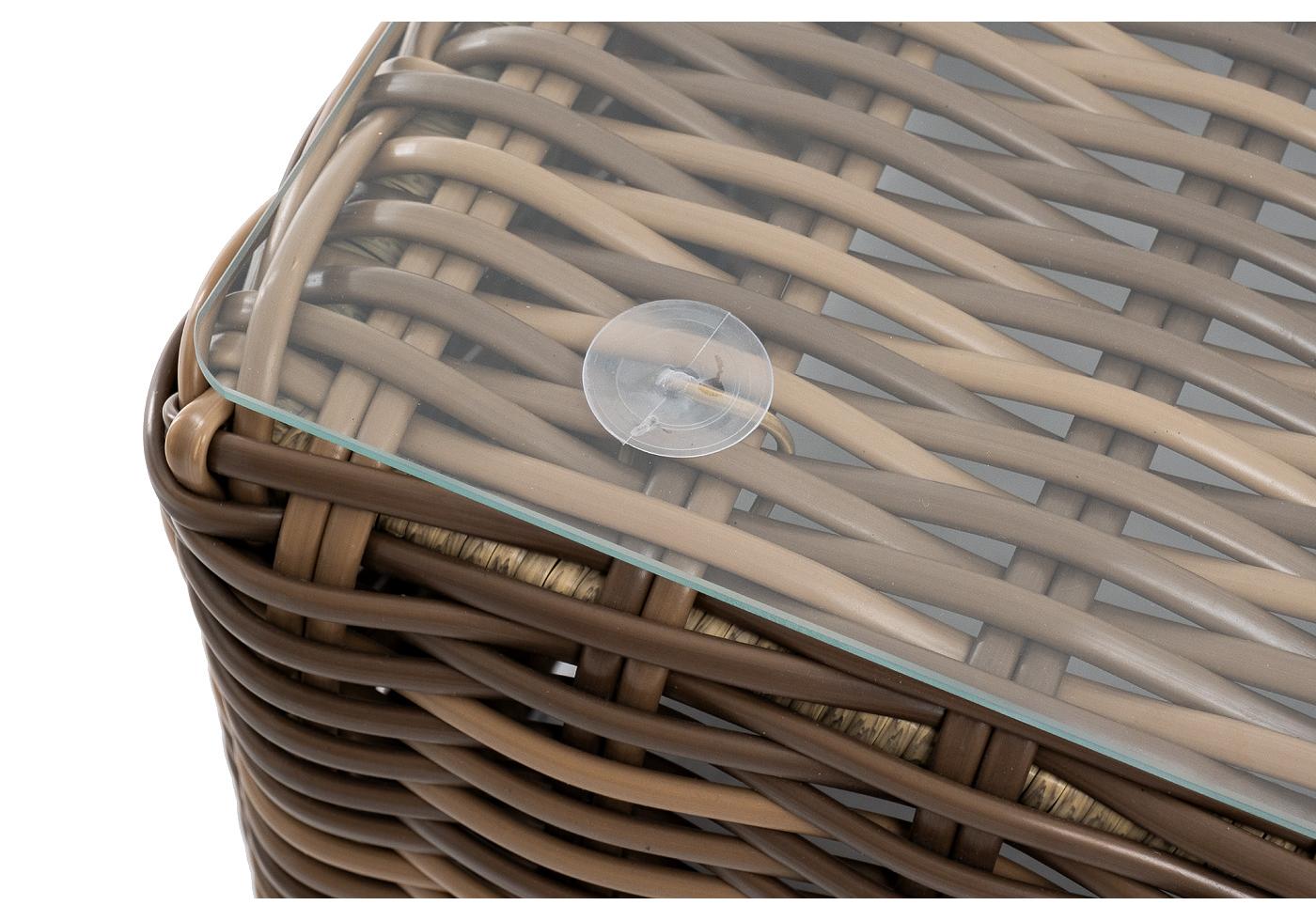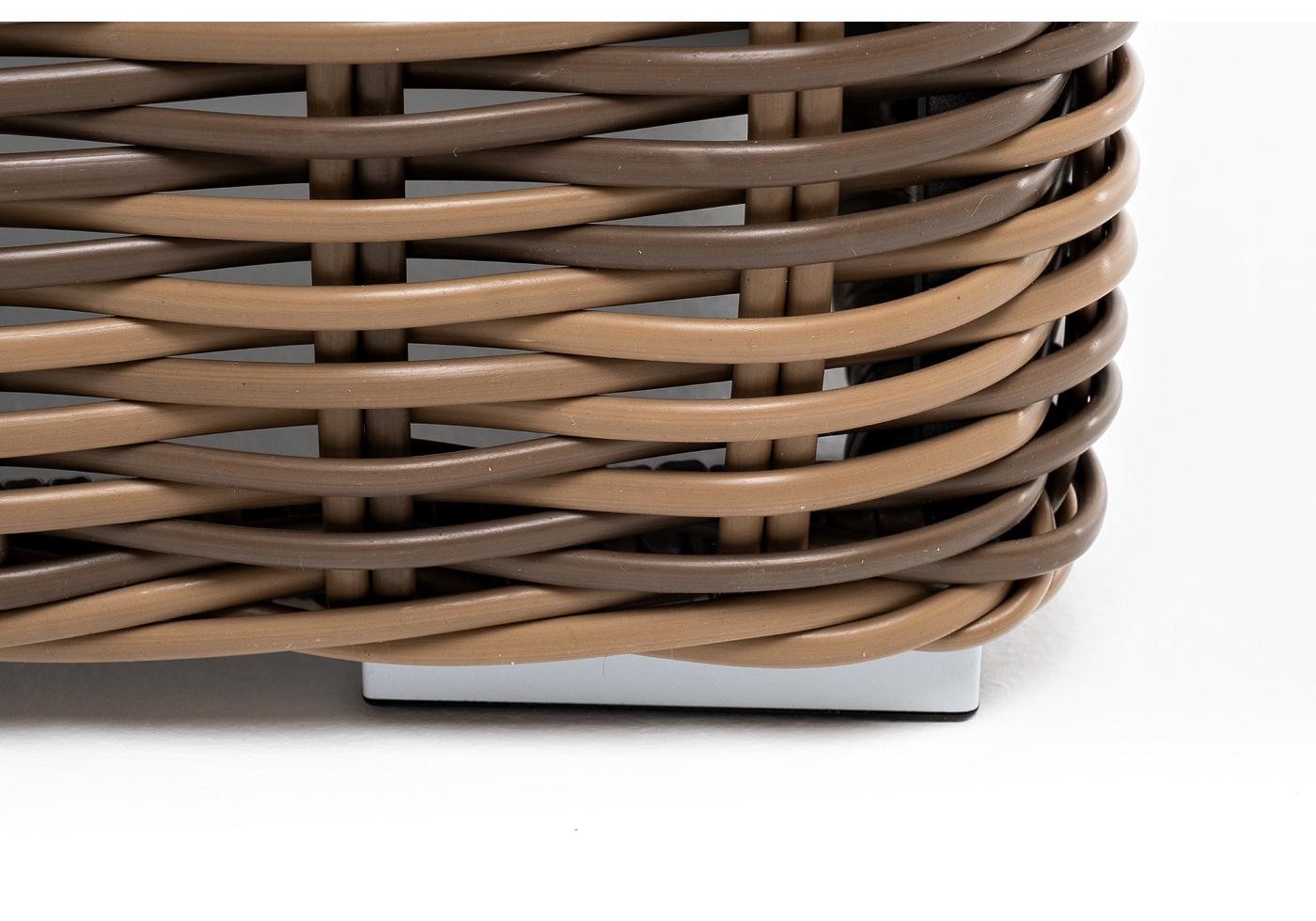 Каркас столика изготовлен из алюминия, вручную оплетенного круглым искусственным ротангом.