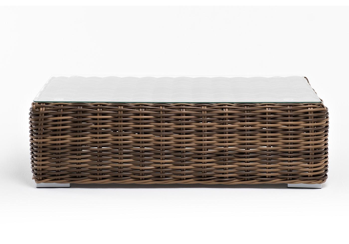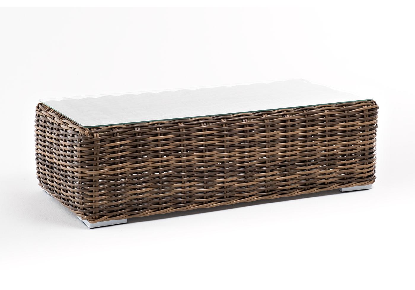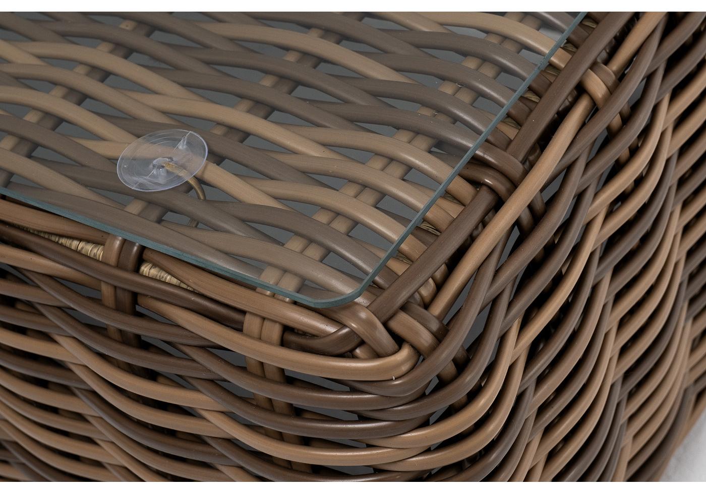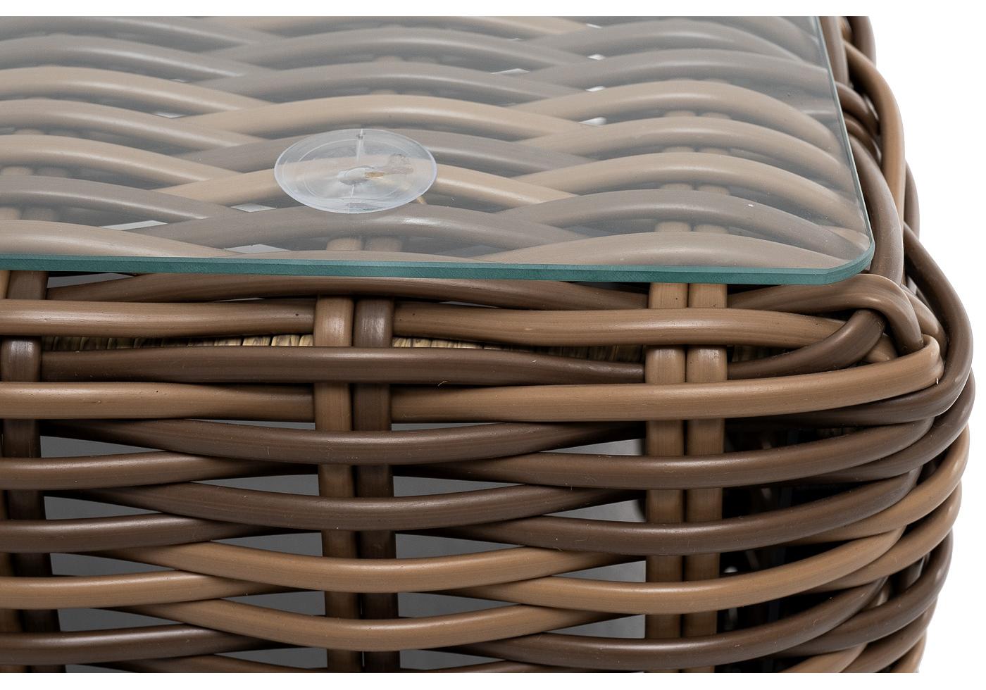 Каркас столика изготовлен из алюминия, вручную оплетенного круглым искусственным ротангом.