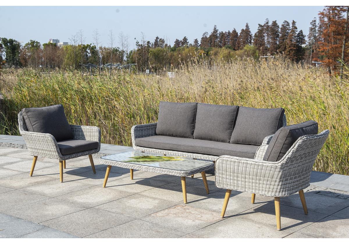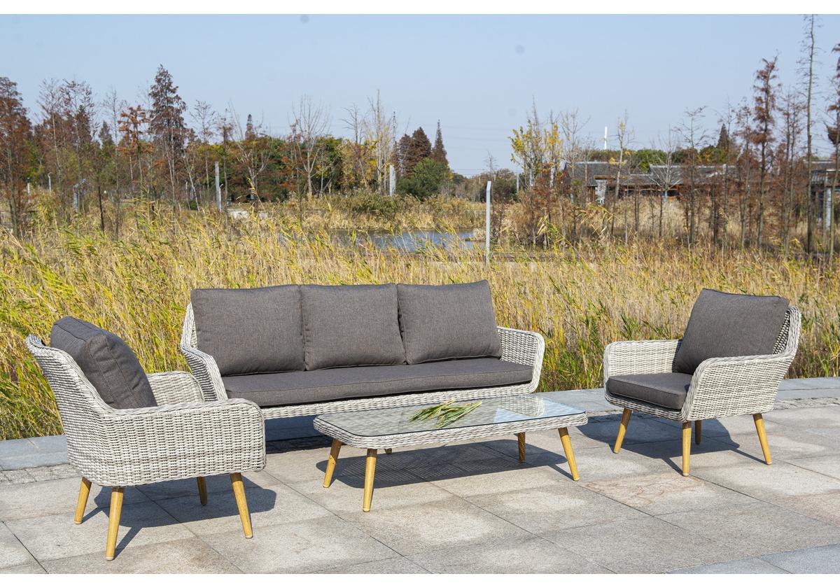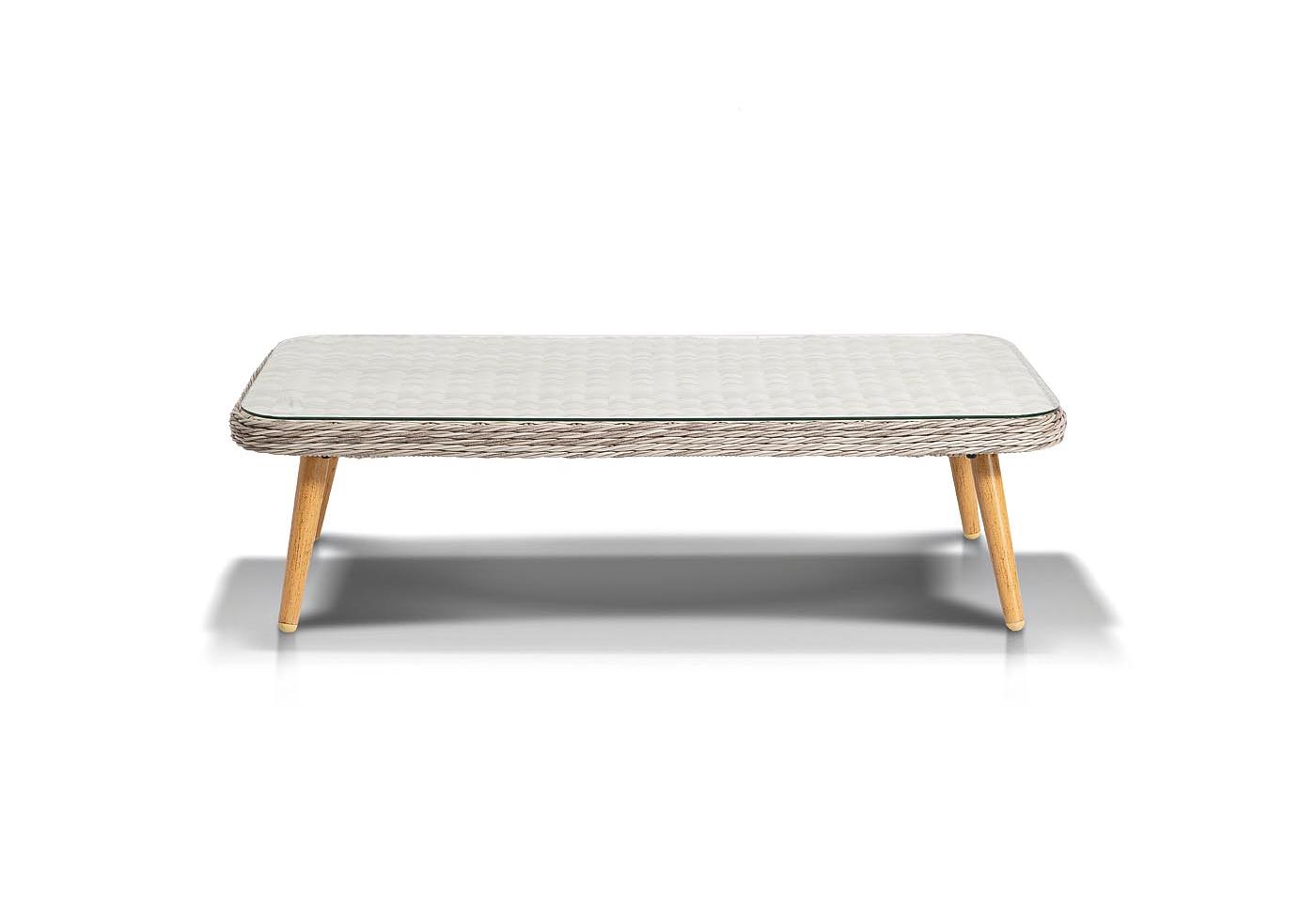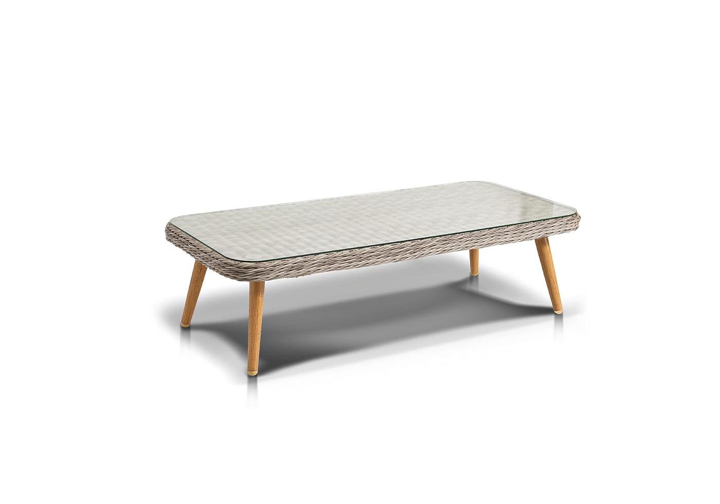 Алюминиевый каркас имеет цвет натурального дерева. Столик дополняет декоративная оплетка, при изготовлении которой используется круглый искусственный ротанг. Она представлена в бежевом оттенке.