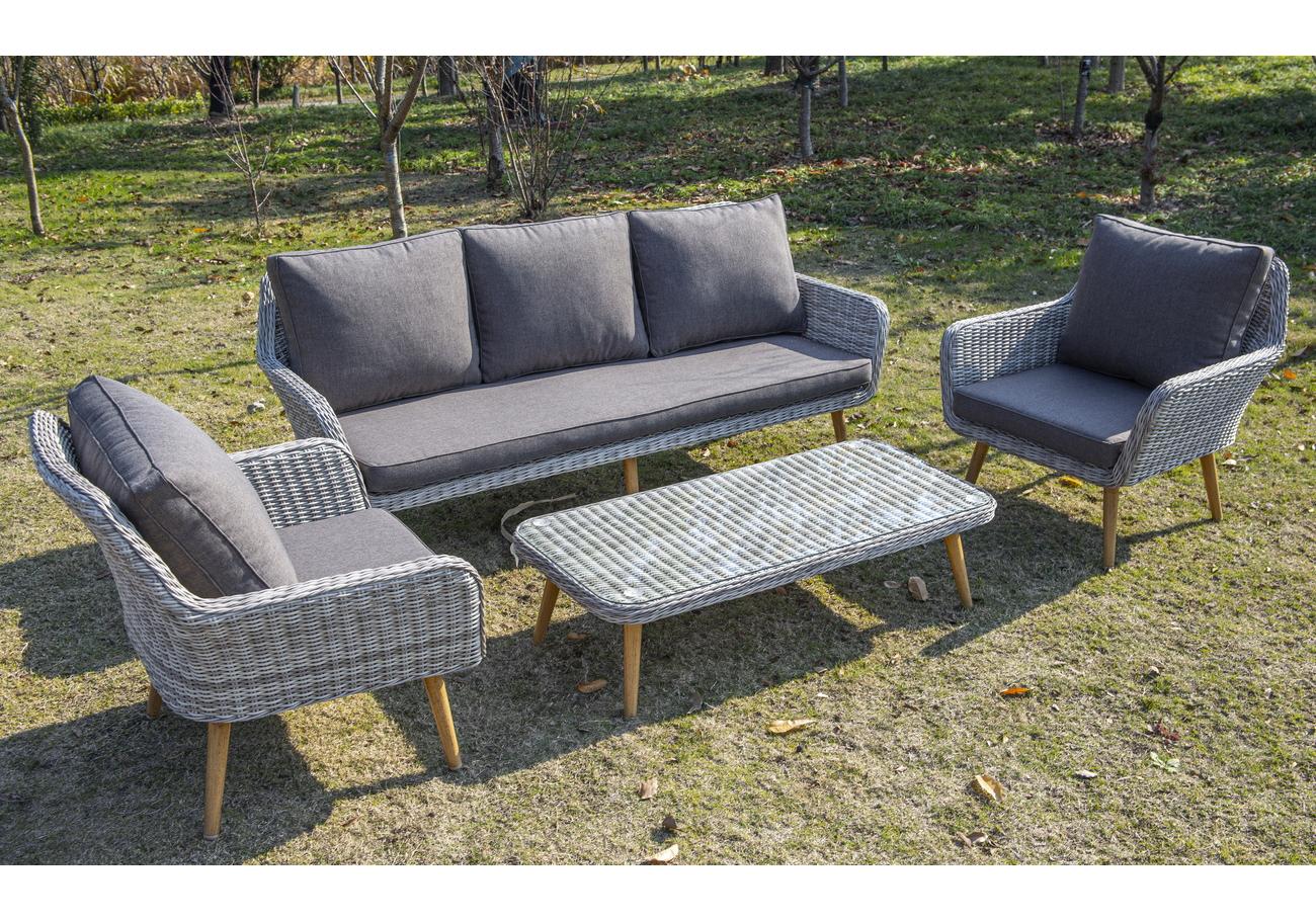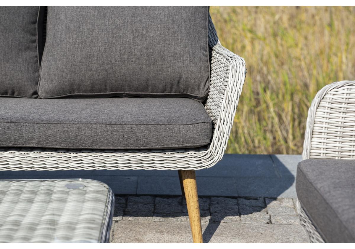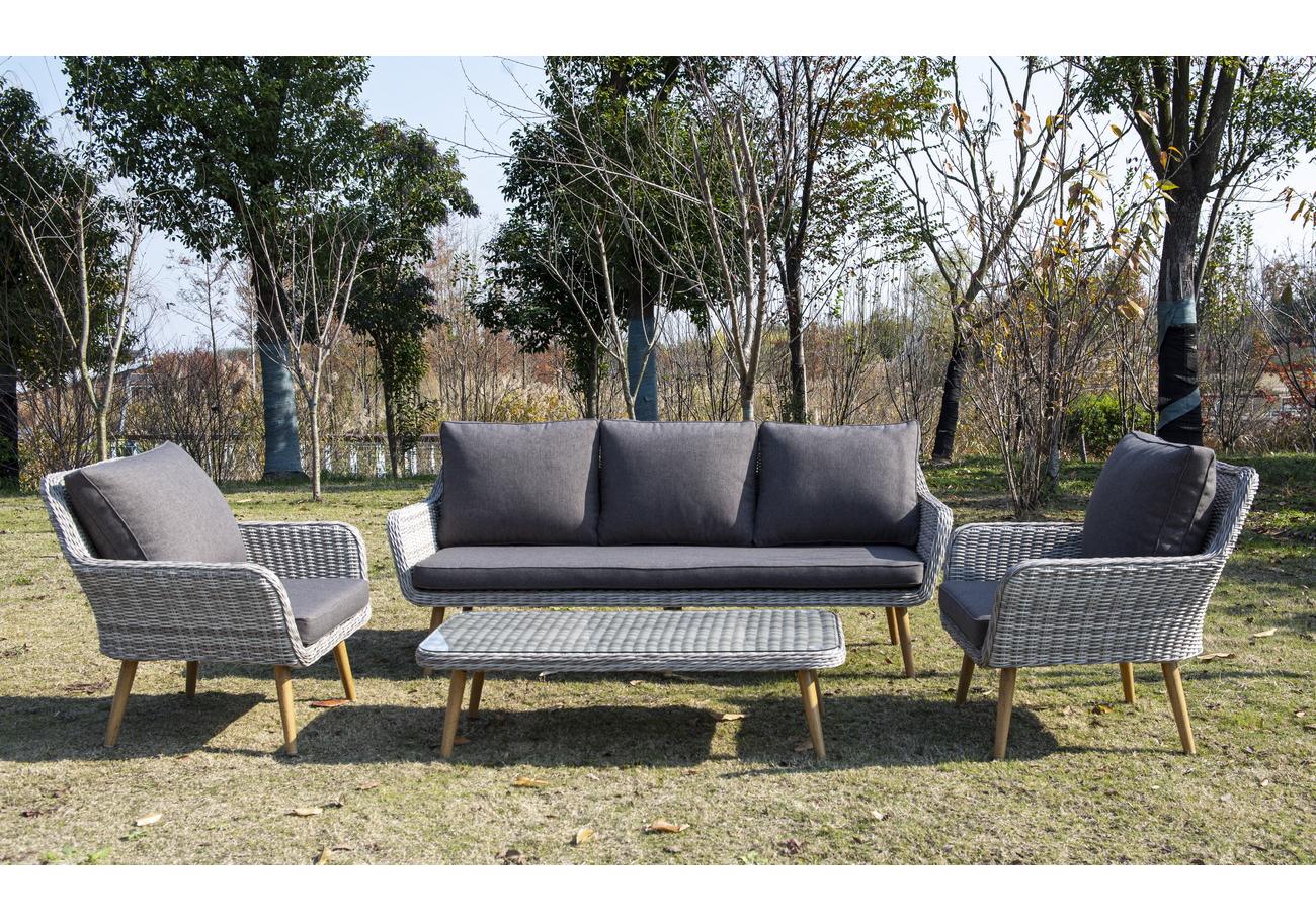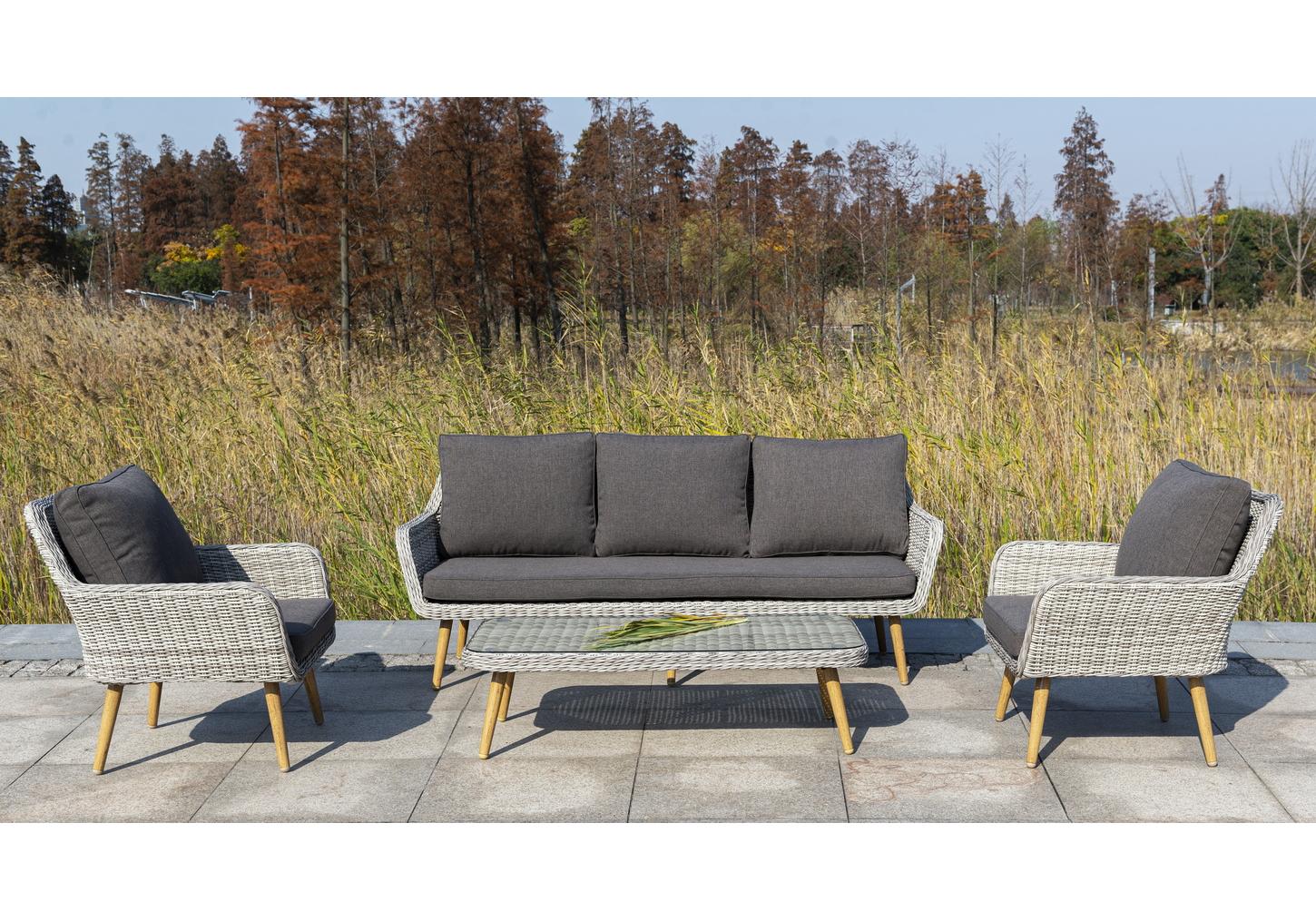 Алюминиевый каркас имеет цвет натурального дерева. Столик дополняет декоративная оплетка, при изготовлении которой используется круглый искусственный ротанг. Она представлена в бежевом оттенке.