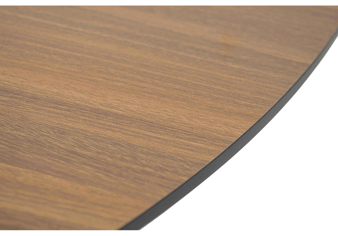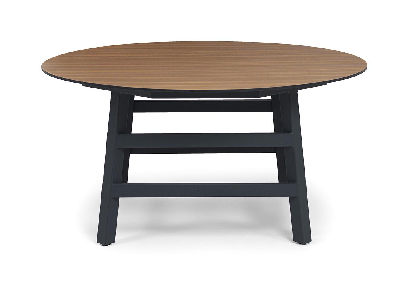 Размер стола - 1600×1600×750 мм. Столешница изготовлена из компакт-пластика HPL c рисунком цвета «дуб».