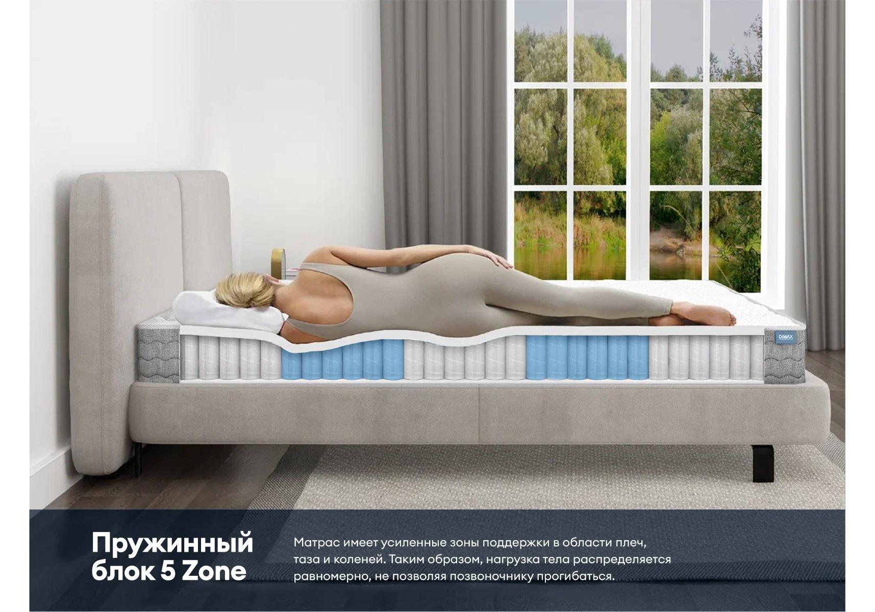 - Пружинный блок 5 Zone: Высокая плотность пружин в таком блоке обеспечивает равномерное распределение нагрузки и точечную поддержку позвоночника. А деление на пять зон жёсткости позволяет матрасу более качественно адаптироваться под каждую часть тела с усилением в районе бёдер, плеч и спины.