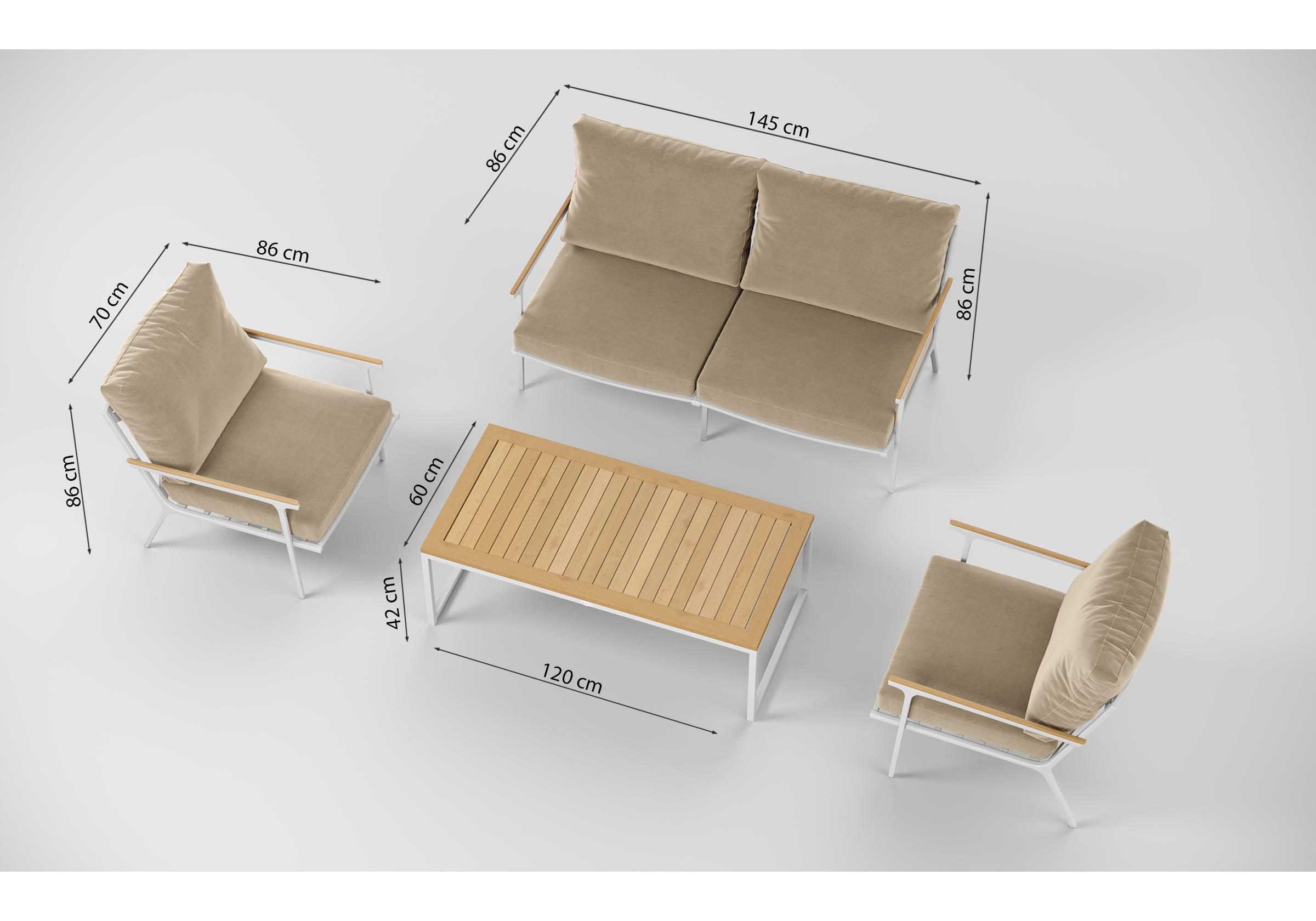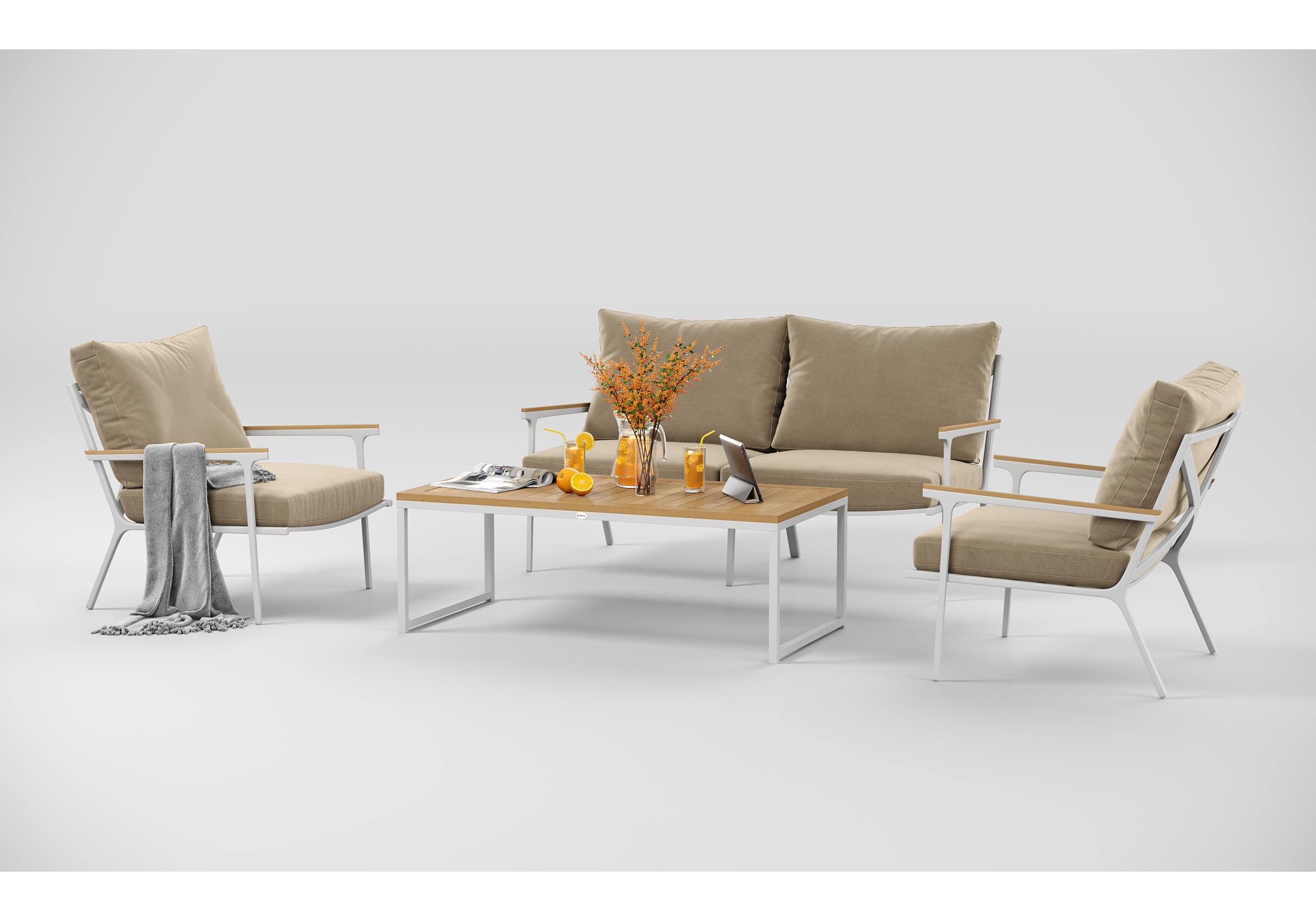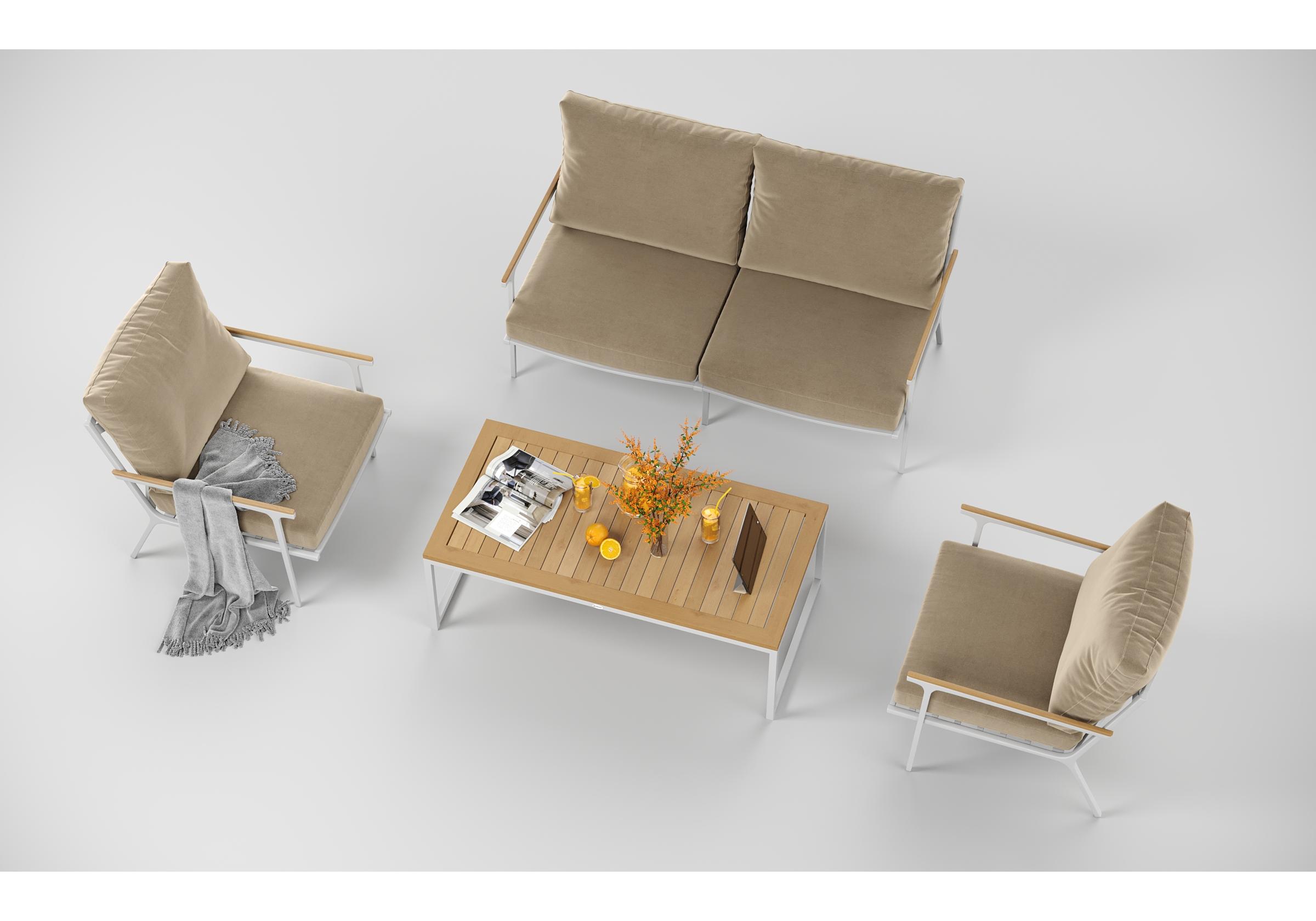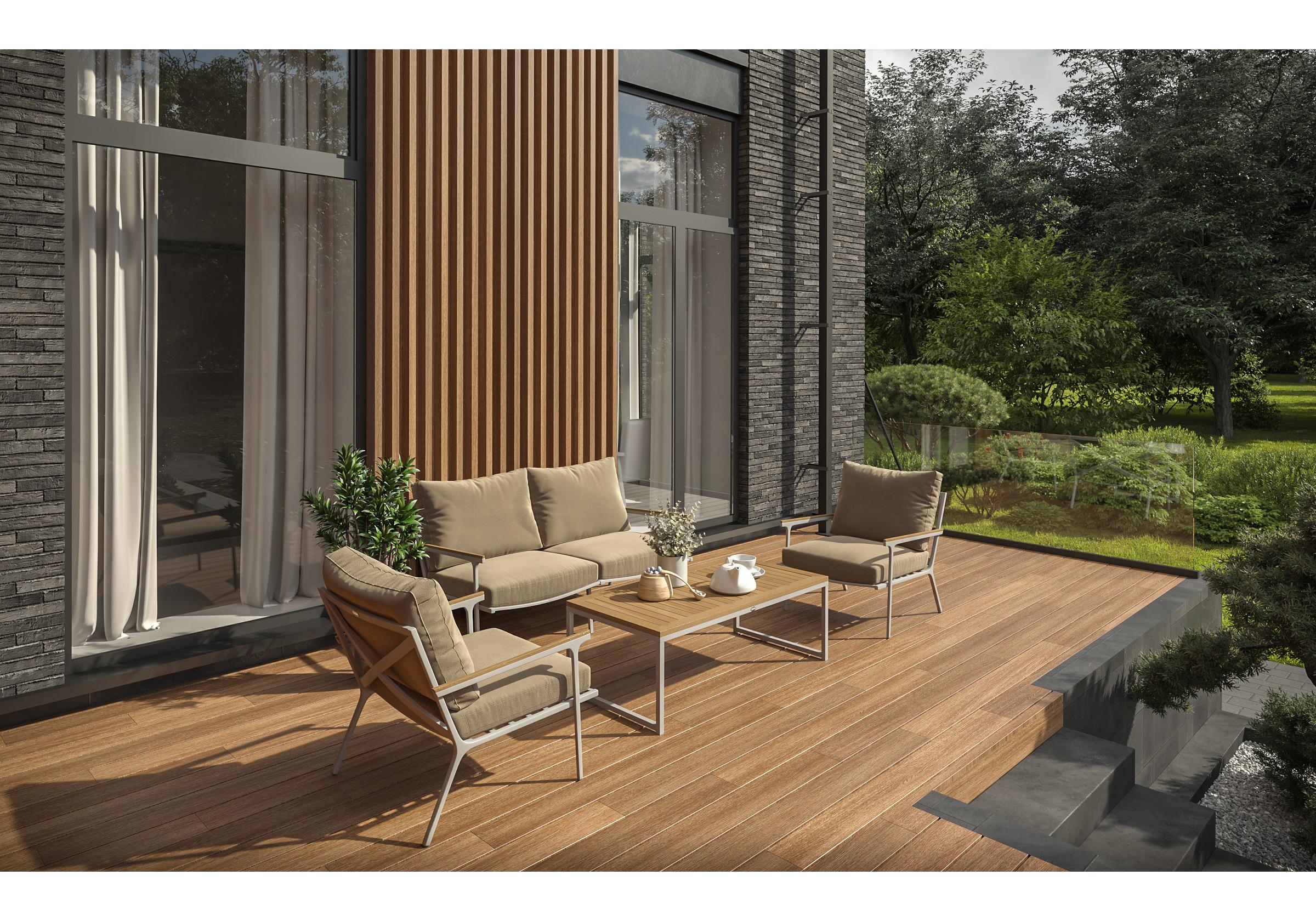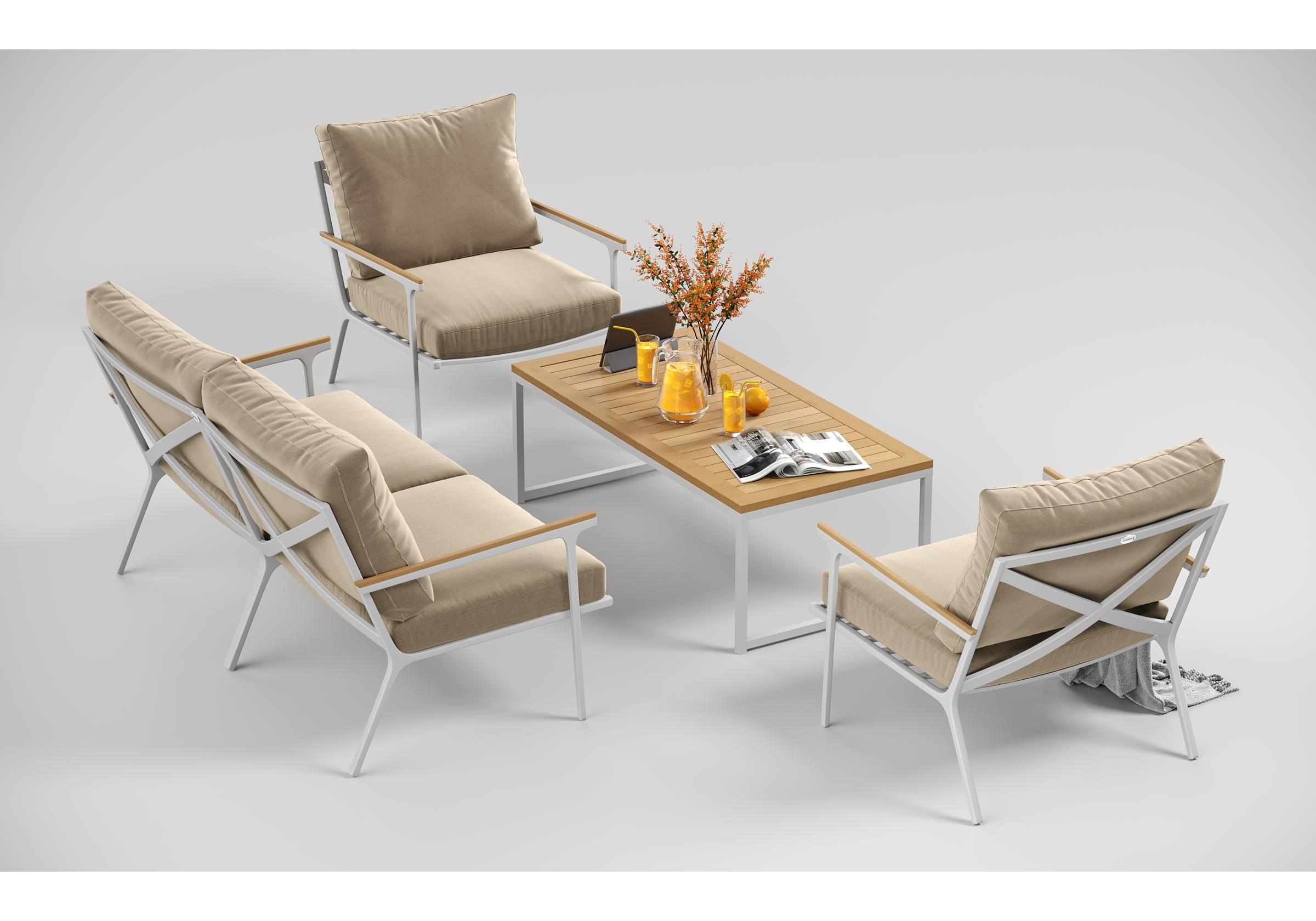 Особенности: подлокотники и планки столешницы из благородного тика, премиальная уличная ткань, съемные чехлы подушек на "молнии", дополнительно можно приобрести комплект защитных чехлов
