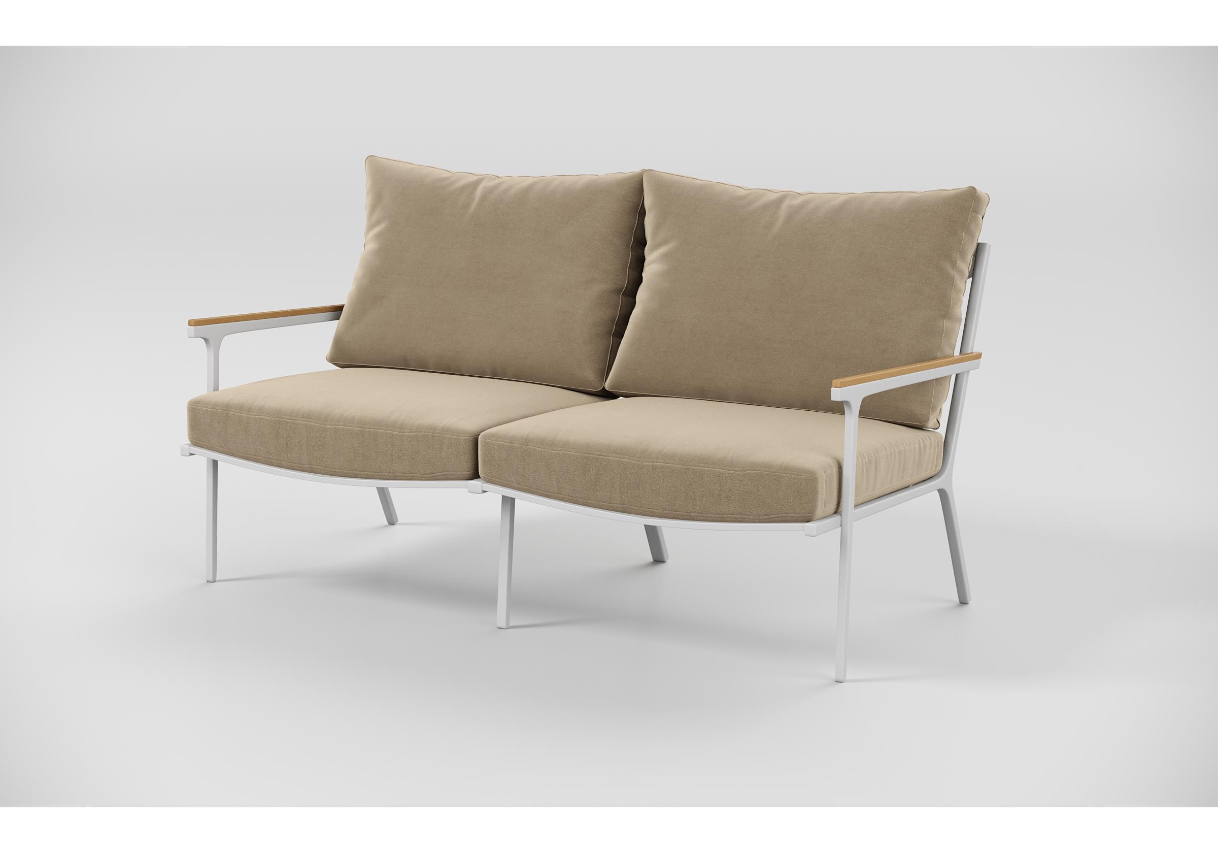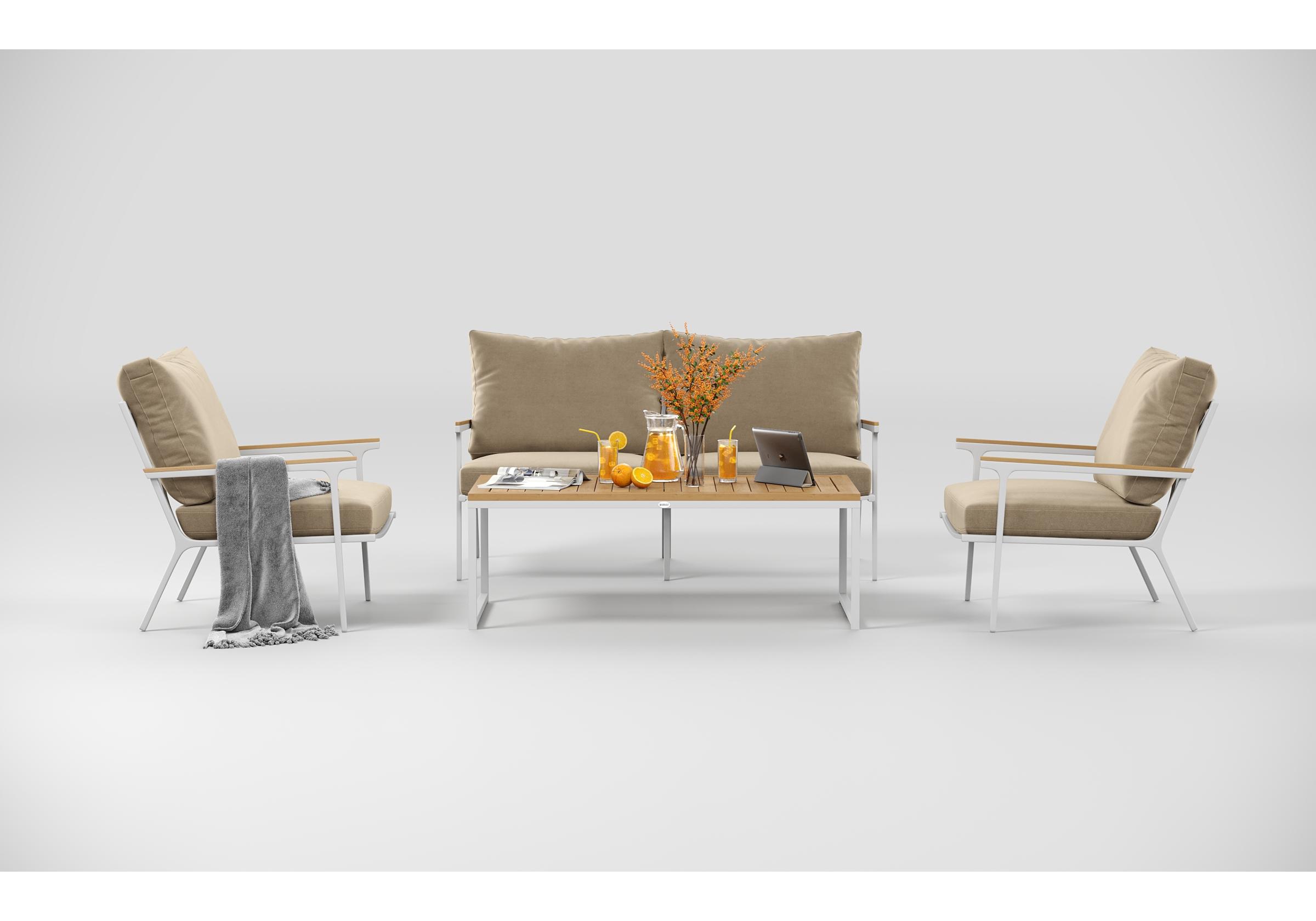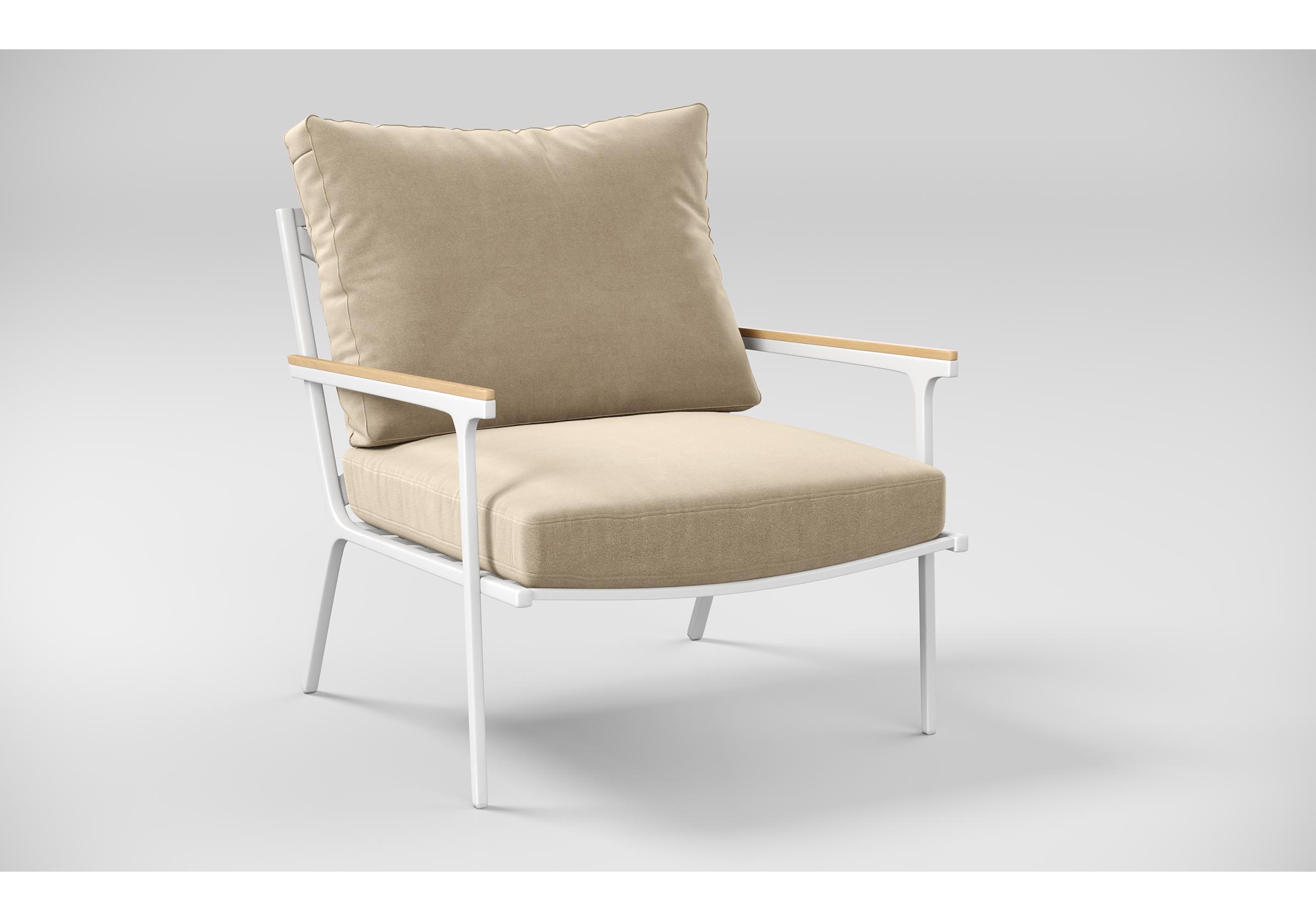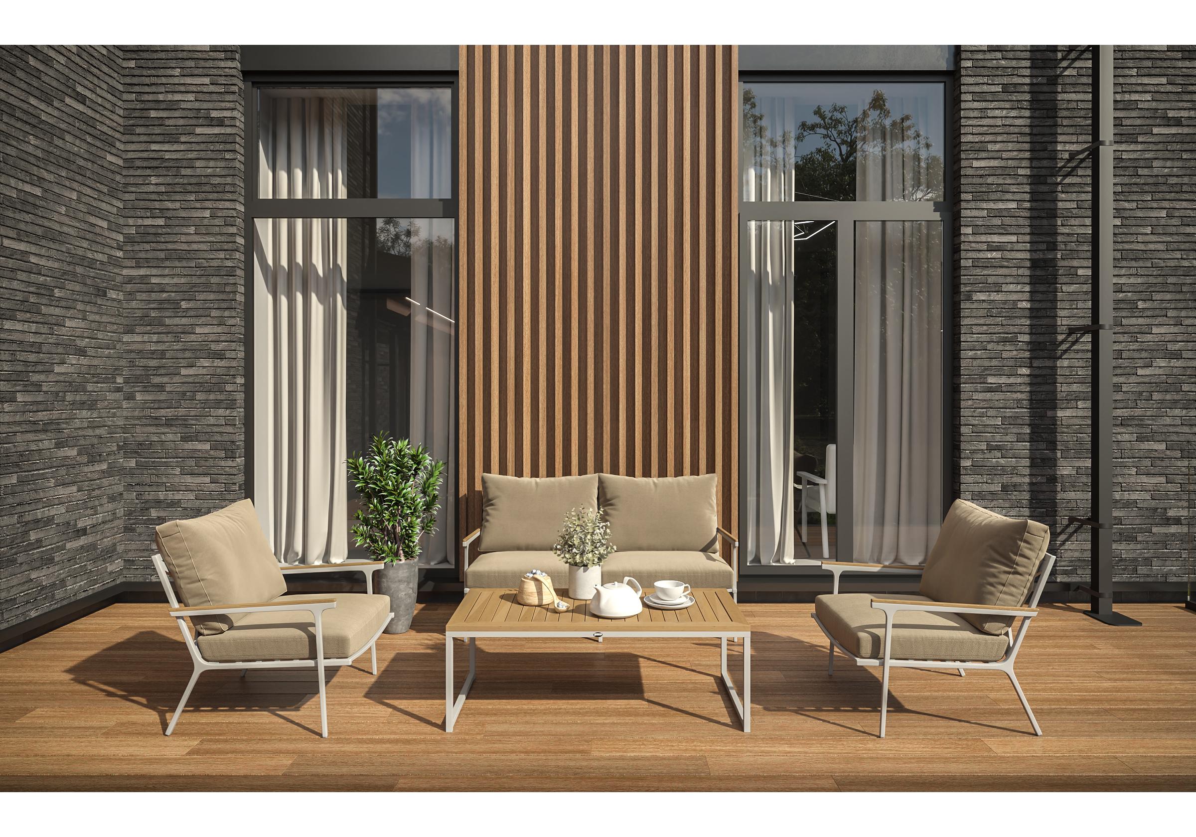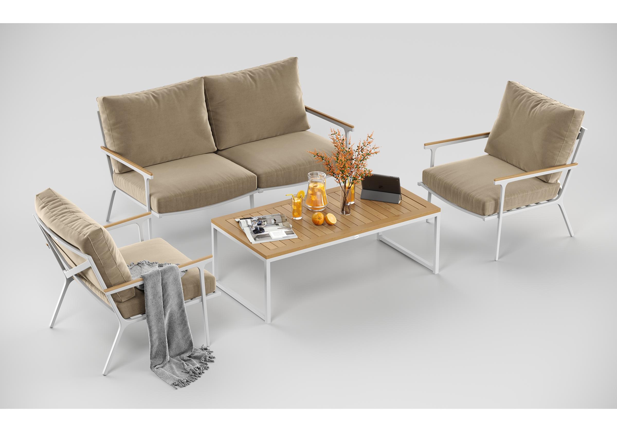 Особенности: подлокотники и планки столешницы из благородного тика, премиальная уличная ткань, съемные чехлы подушек на "молнии", дополнительно можно приобрести комплект защитных чехлов