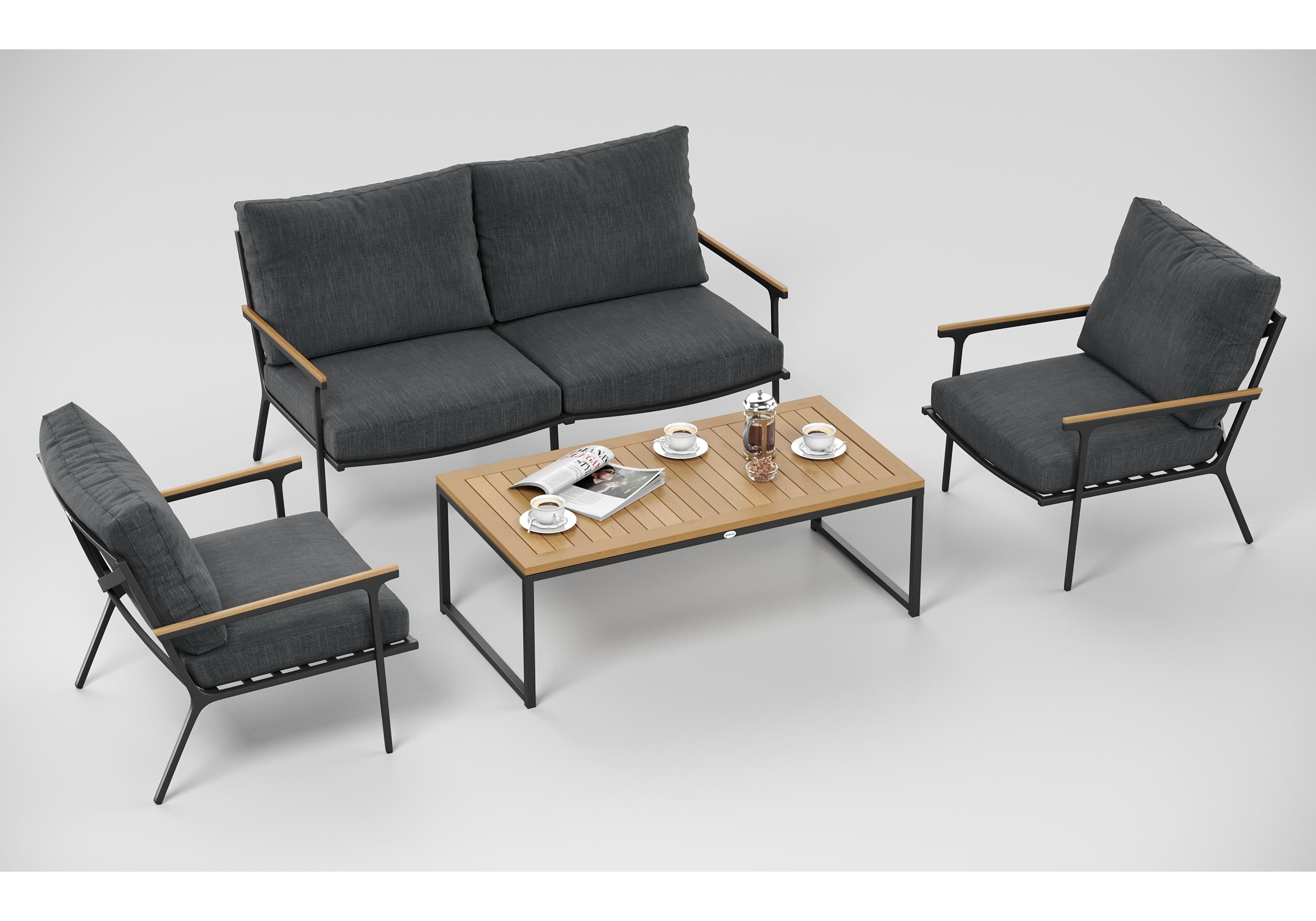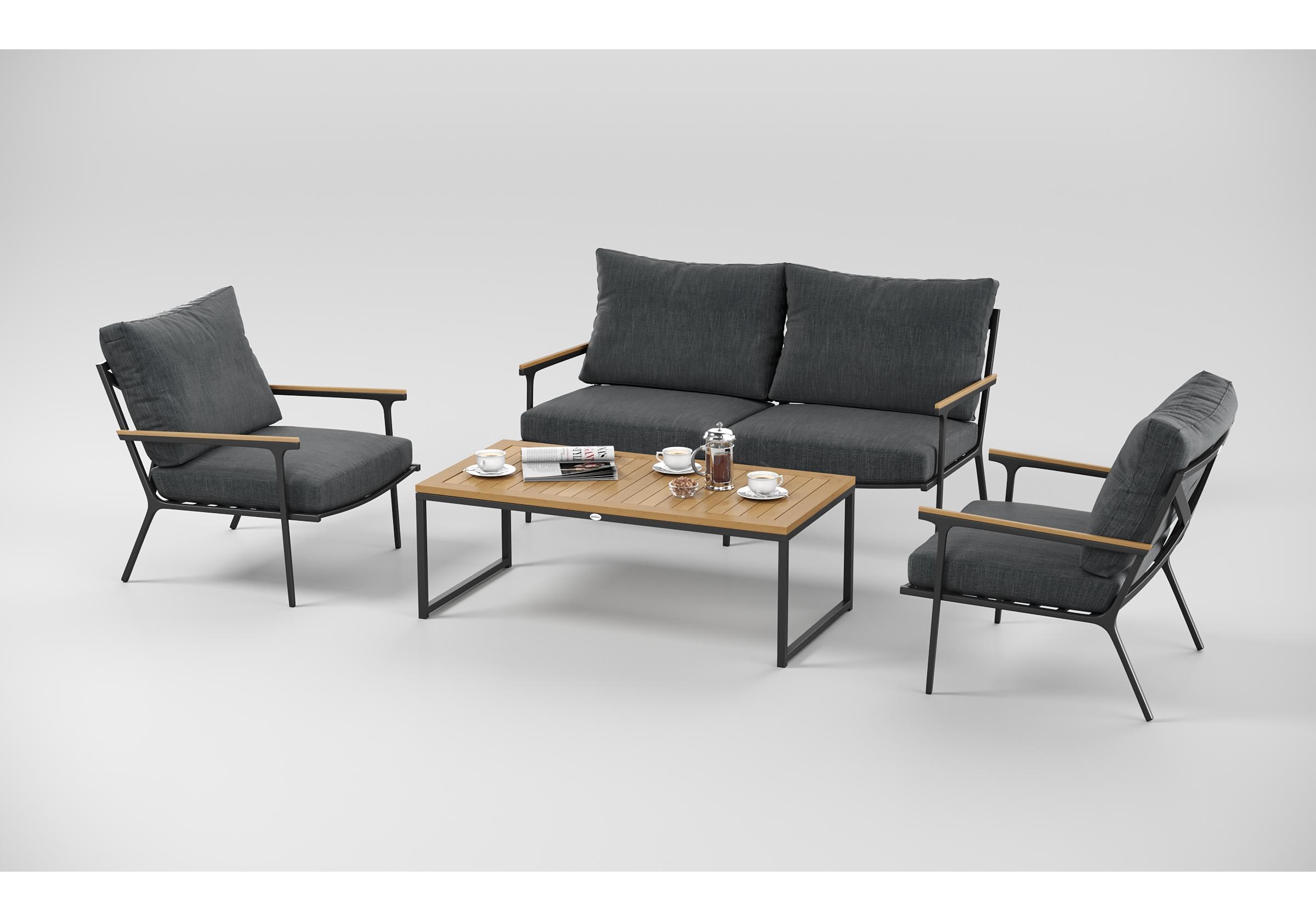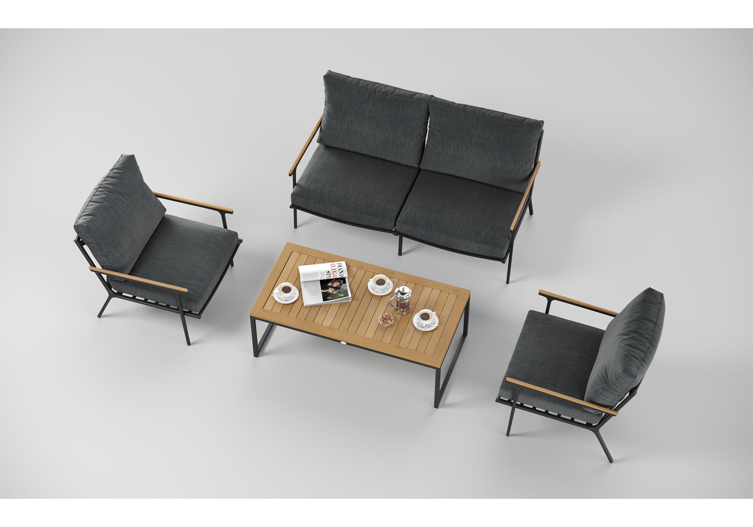 Особенности: подлокотники и планки столешницы из благородного тика, премиальная уличная ткань, съемные чехлы подушек на "молнии", дополнительно можно приобрести комплект защитных чехлов
