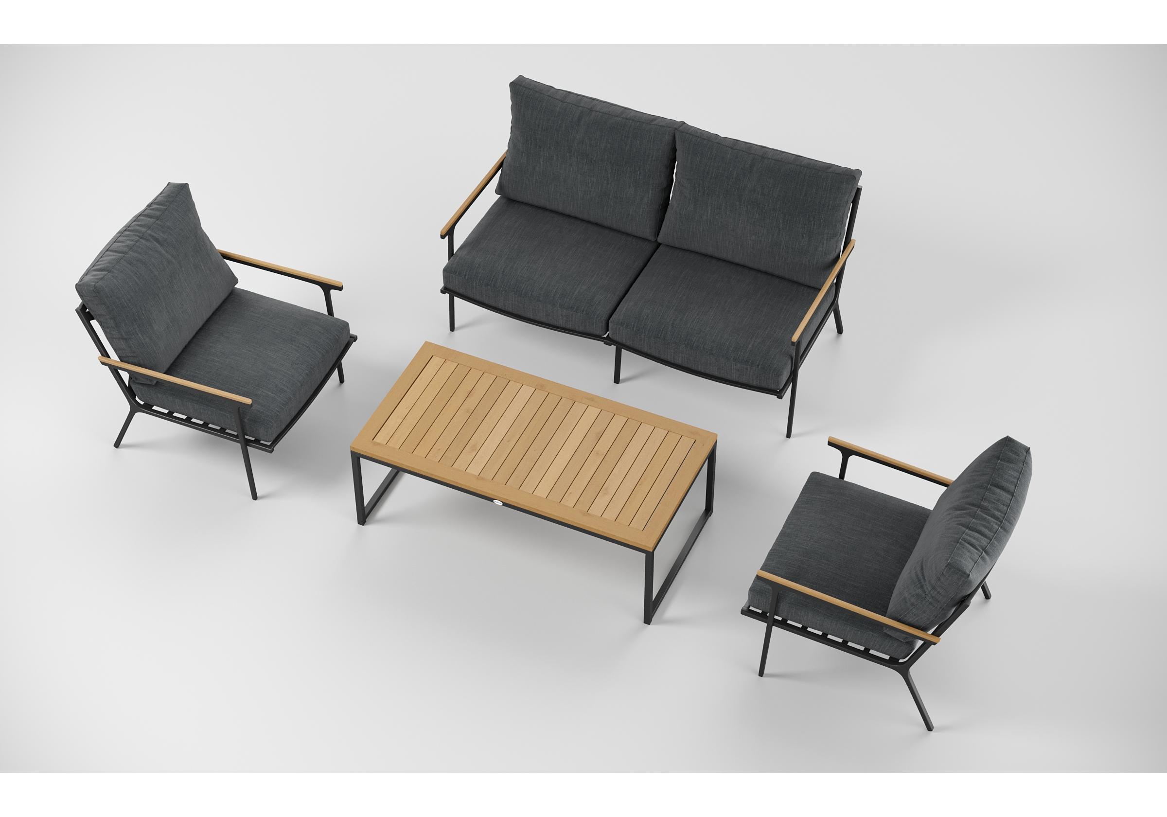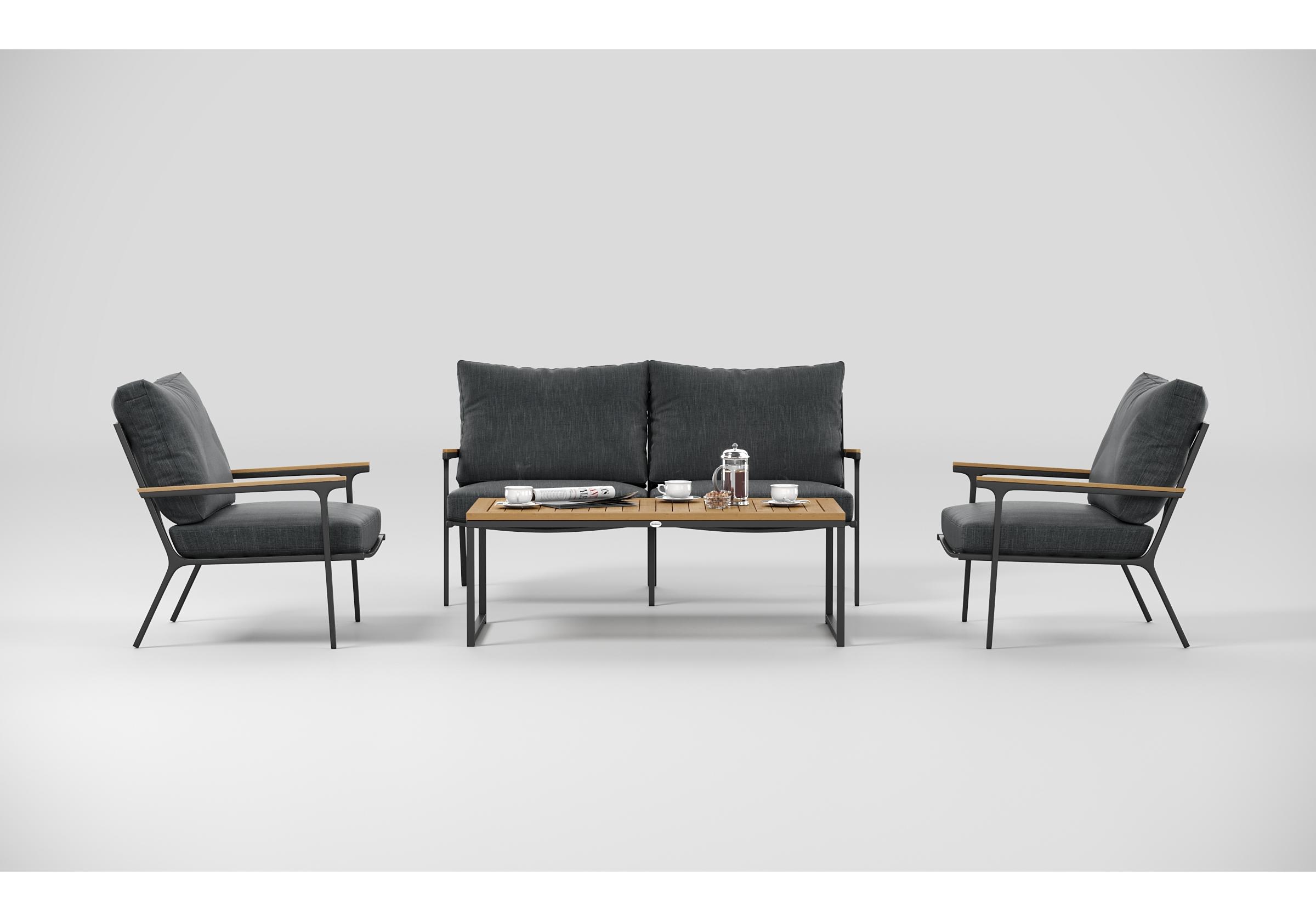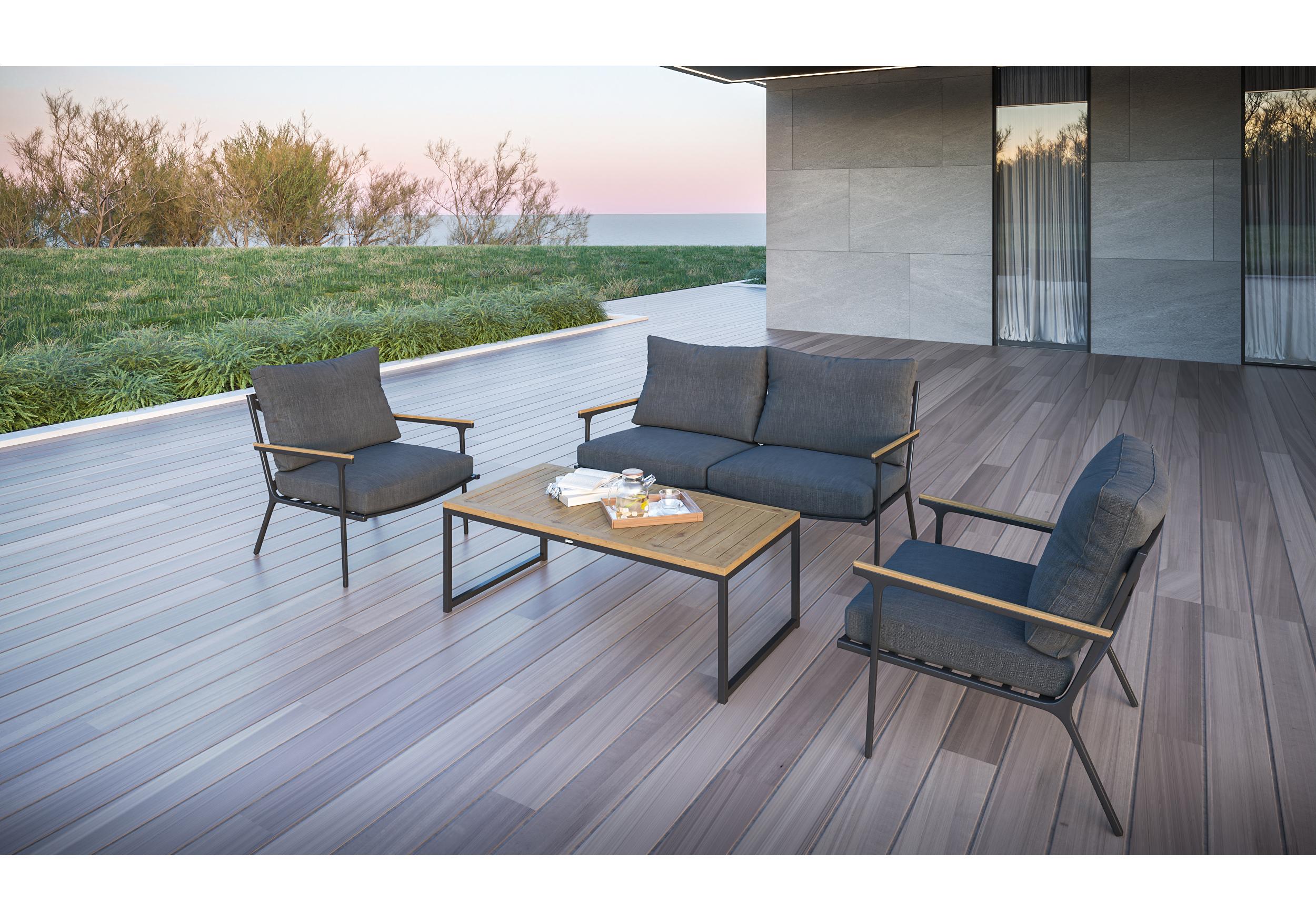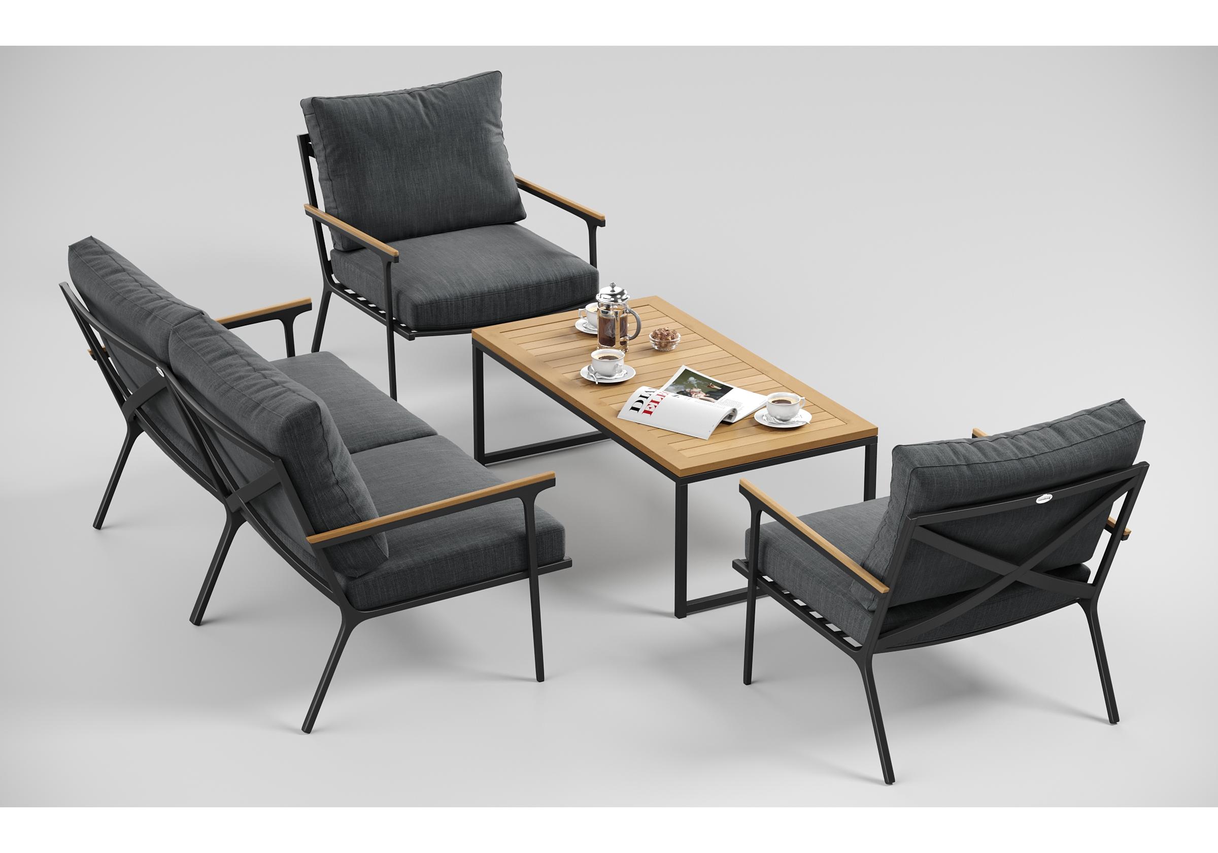 Особенности: подлокотники и планки столешницы из благородного тика, премиальная уличная ткань, съемные чехлы подушек на "молнии", дополнительно можно приобрести комплект защитных чехлов