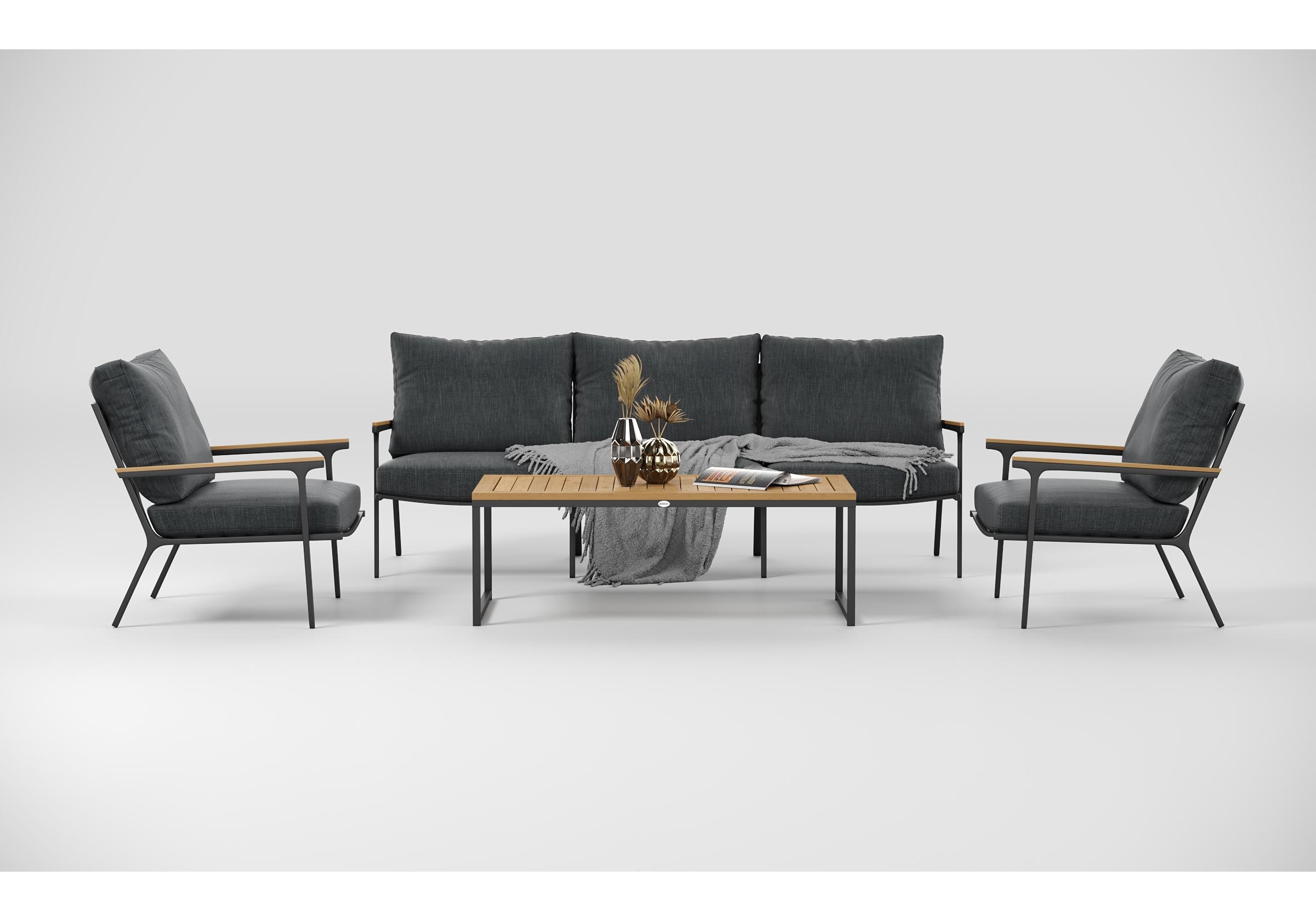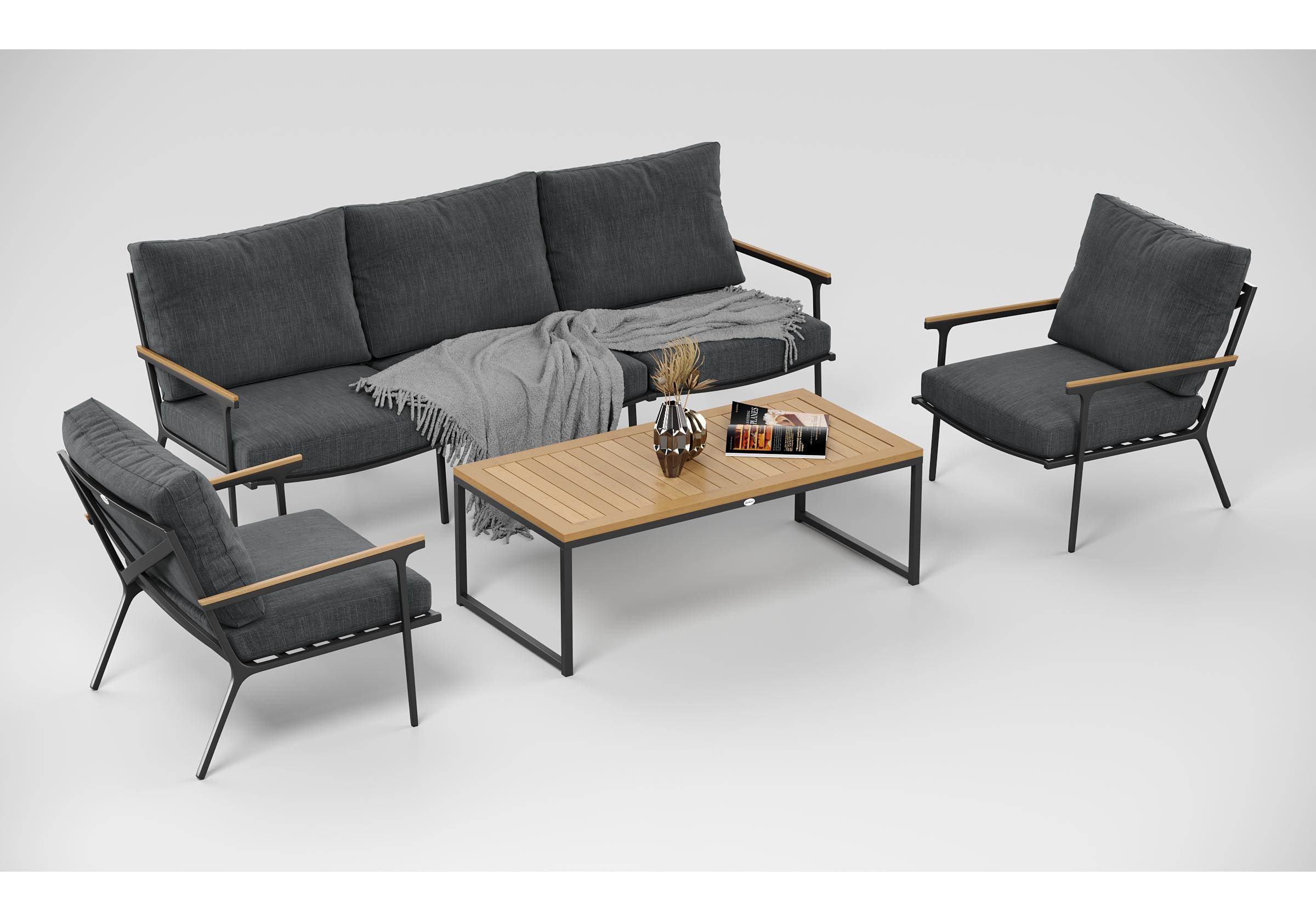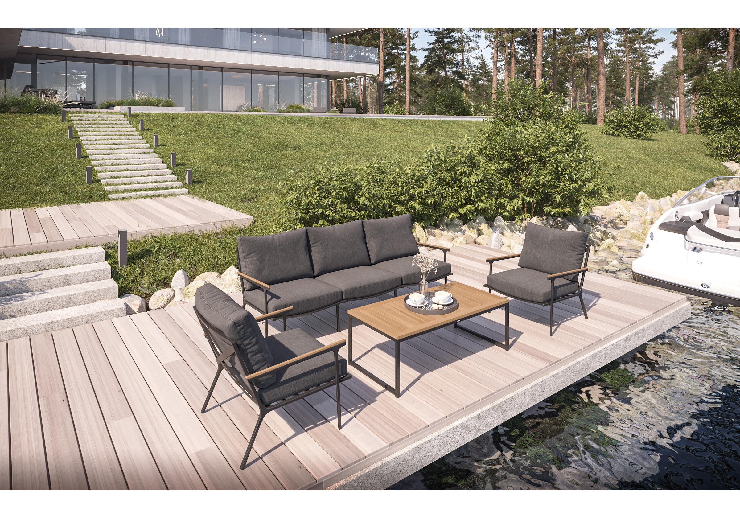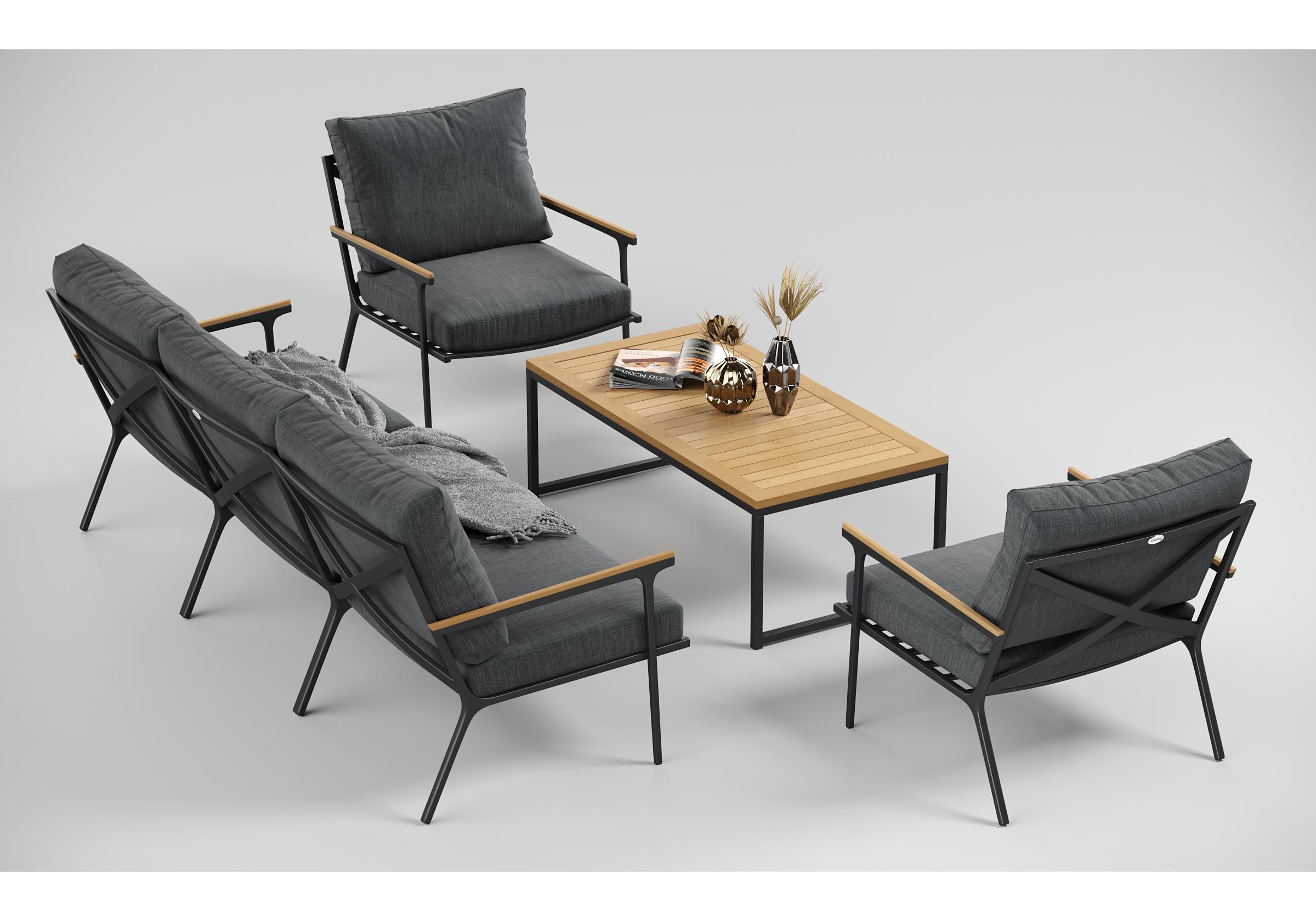 Особенности: подлокотники и планки столешницы из благородного тика, премиальная уличная ткань, съемные чехлы подушек на "молнии", дополнительно можно приобрести комплект защитных чехлов