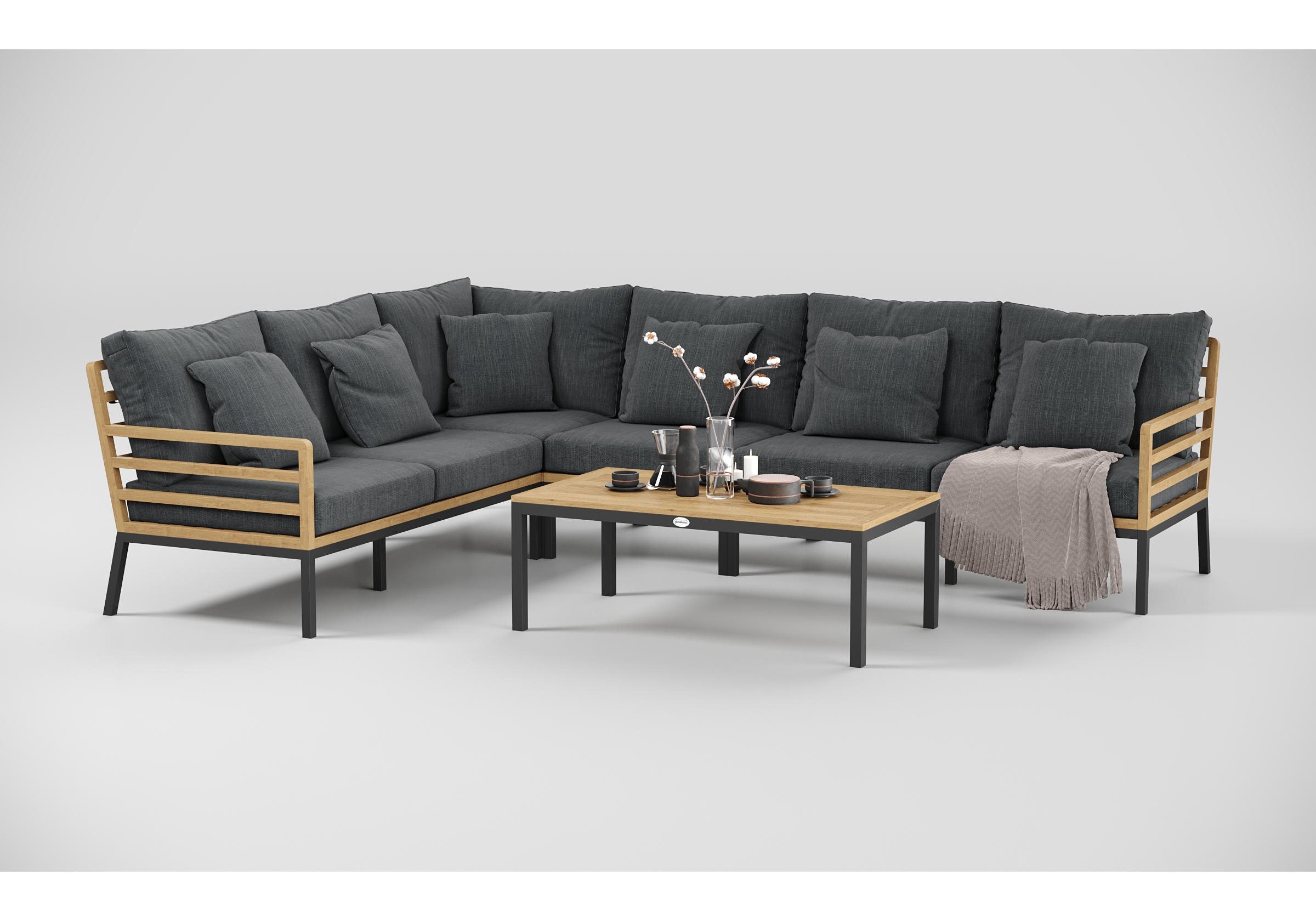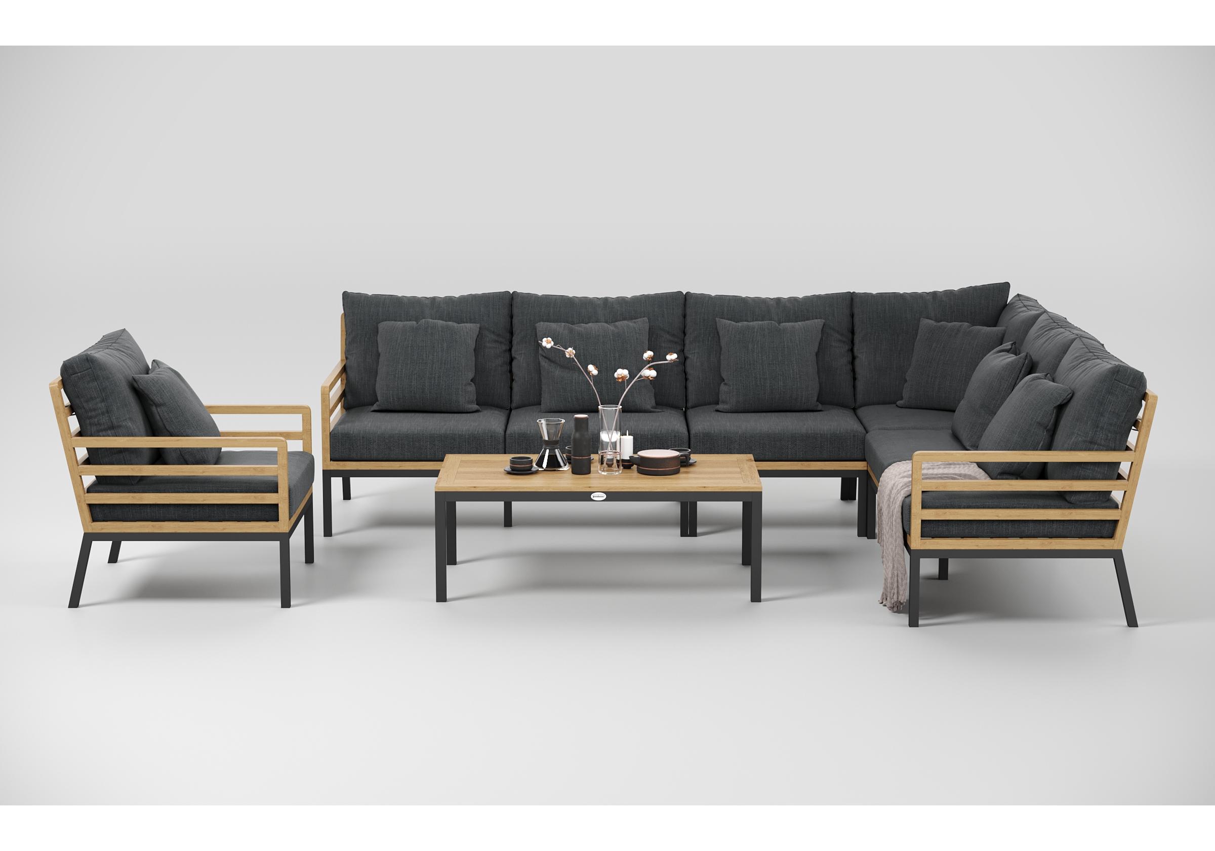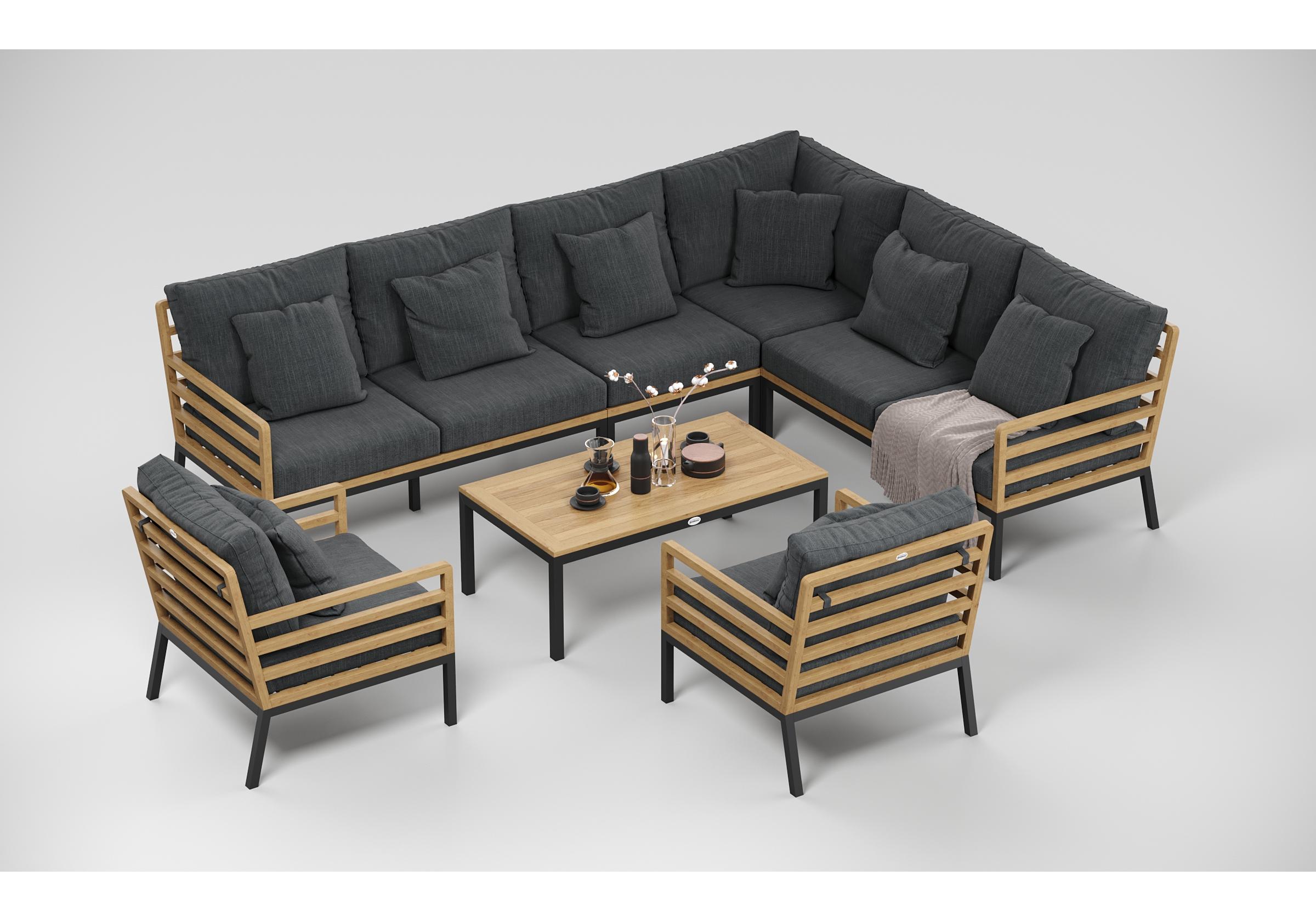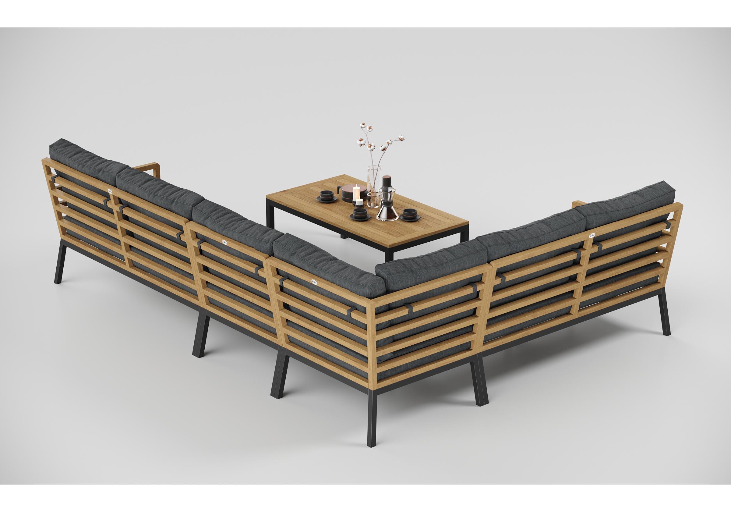Особенности: каркас диванов из тика, подножье из алюминия, столешница столика из тиковых планок, премиальная уличная ткань, съемные чехлы подушек "на молнии", в комплекте 5 декоративных подушек