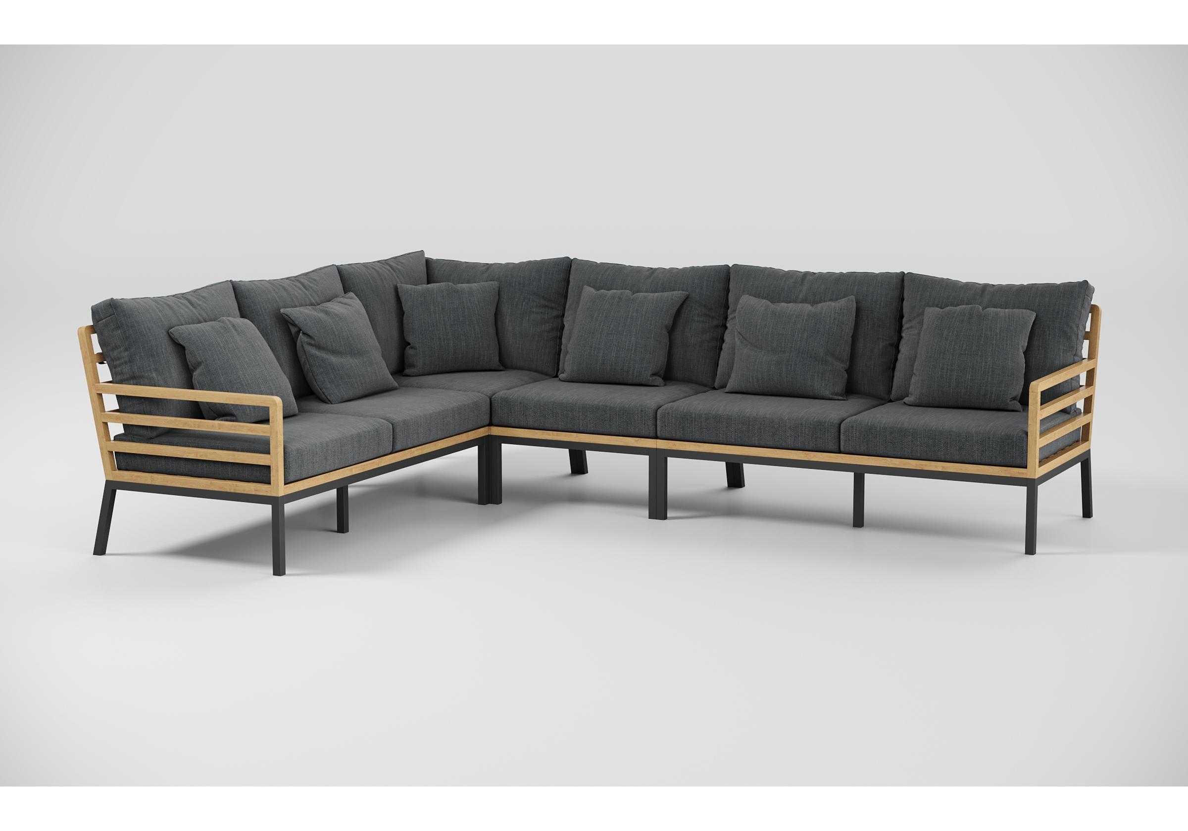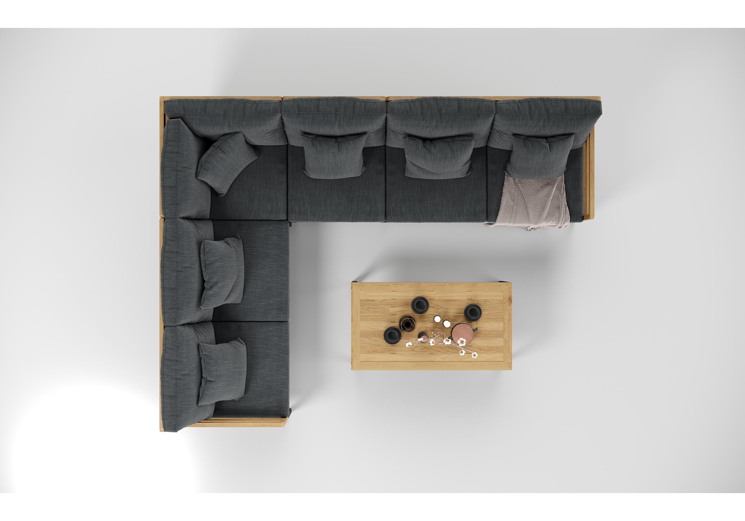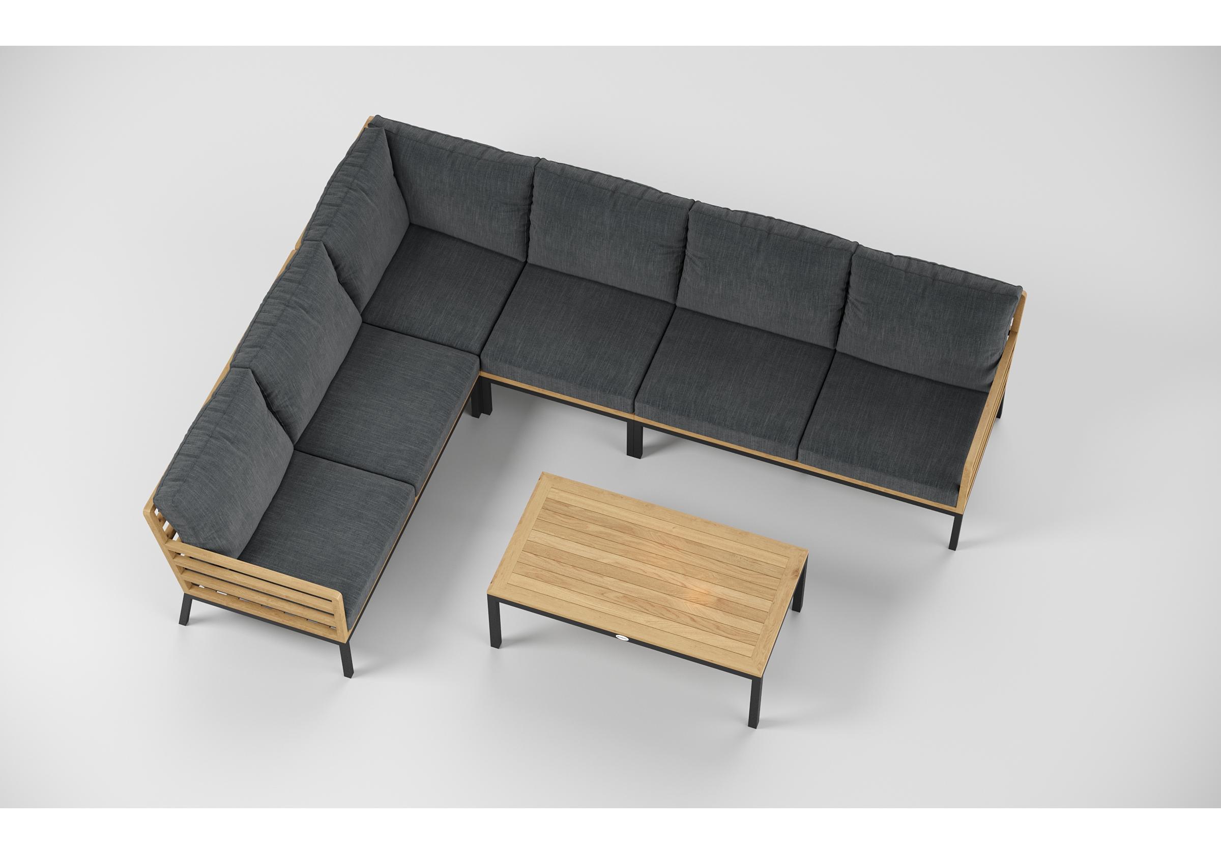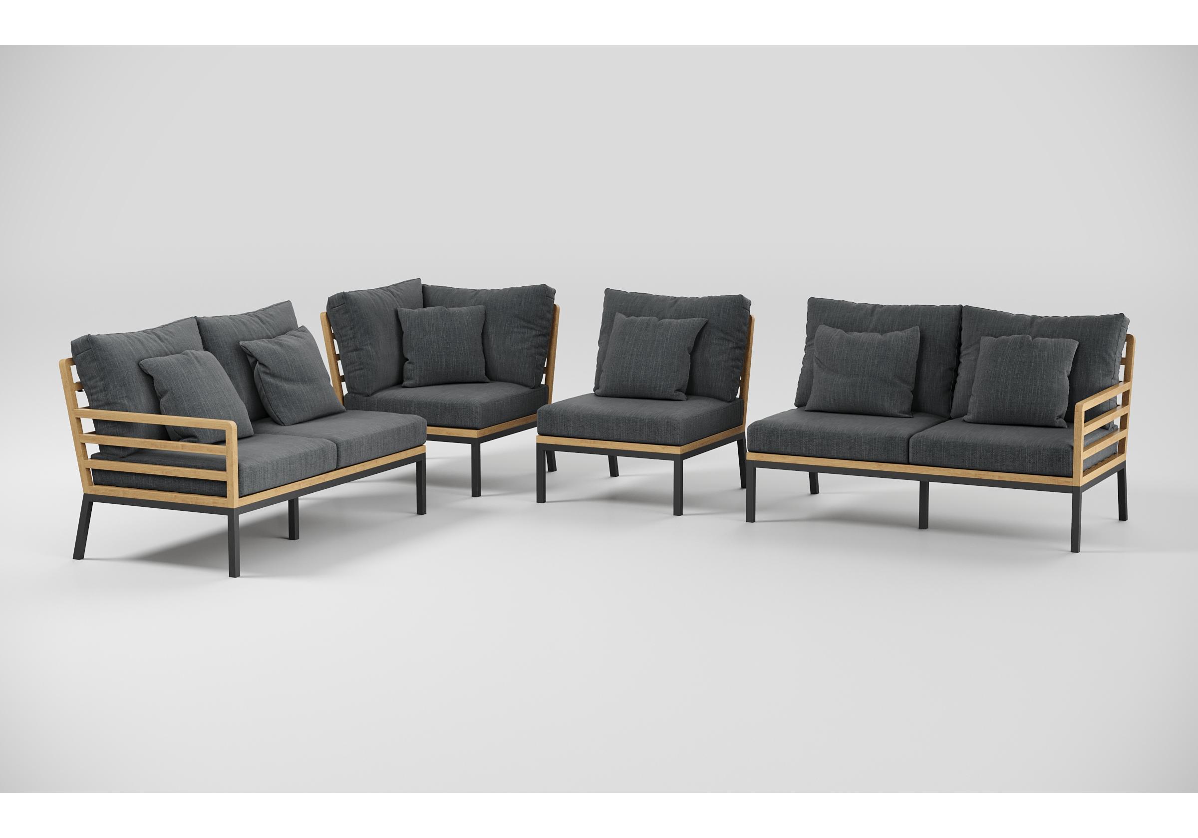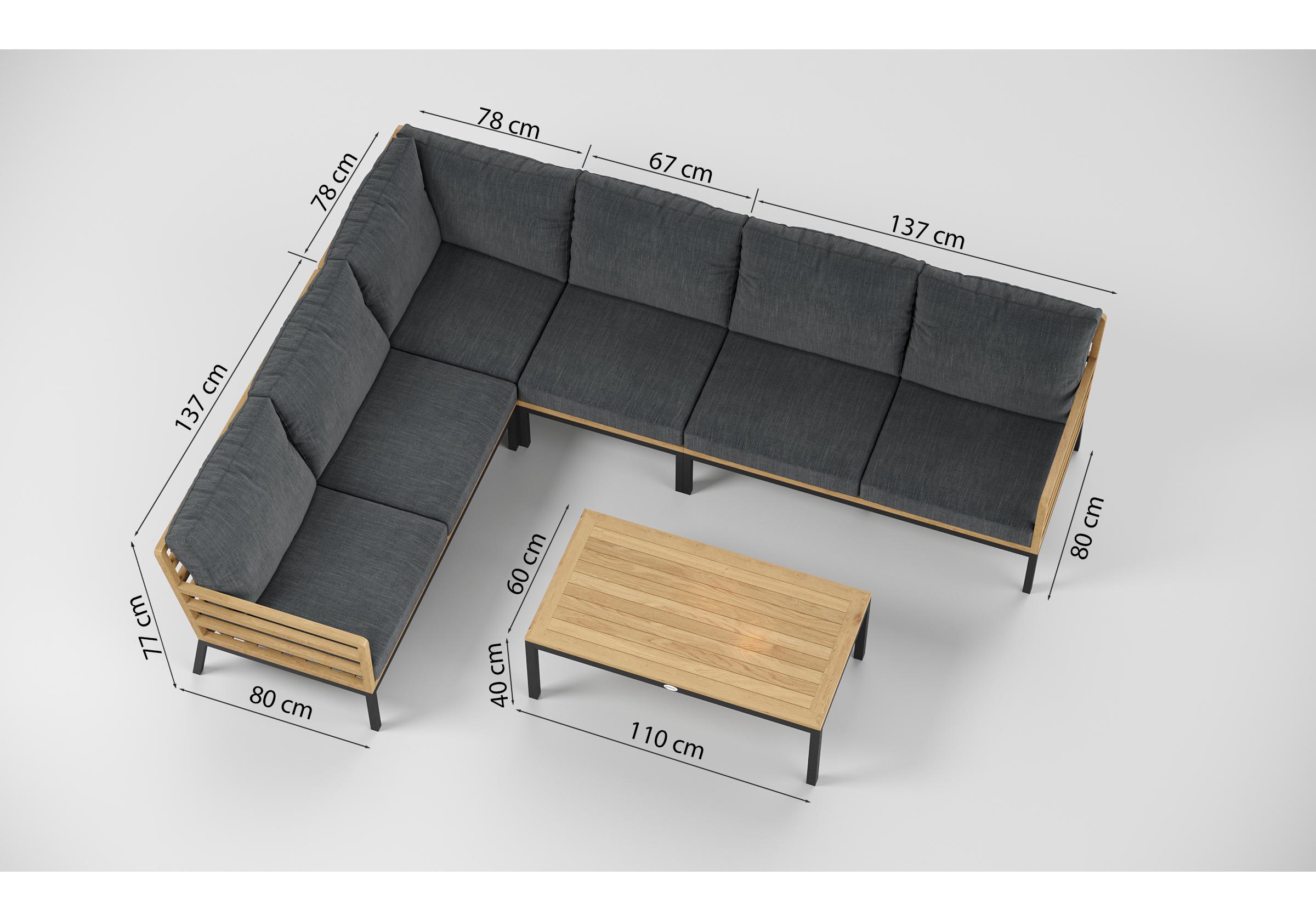 Особенности: каркас диванов из тика, подножье из алюминия, столешница столика из тиковых планок, премиальная уличная ткань, съемные чехлы подушек "на молнии", в комплекте 5 декоративных подушек