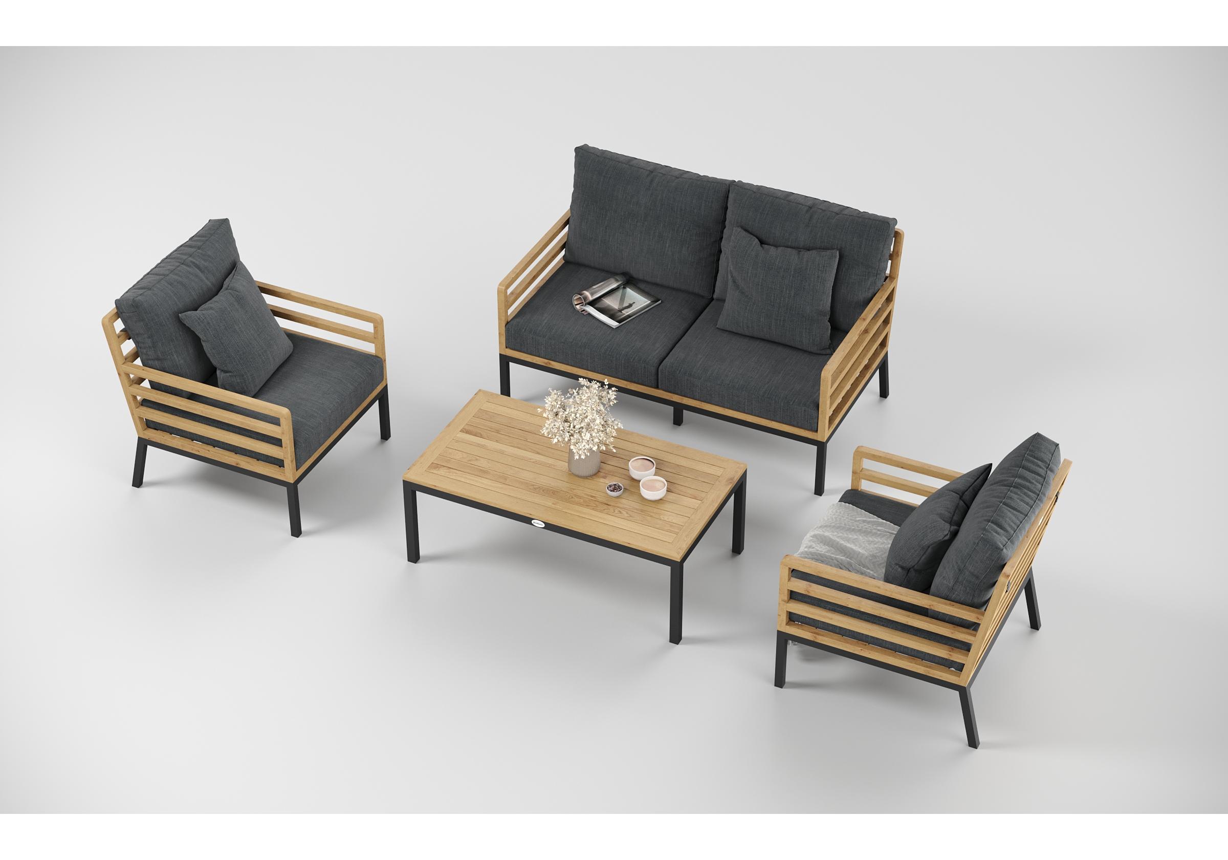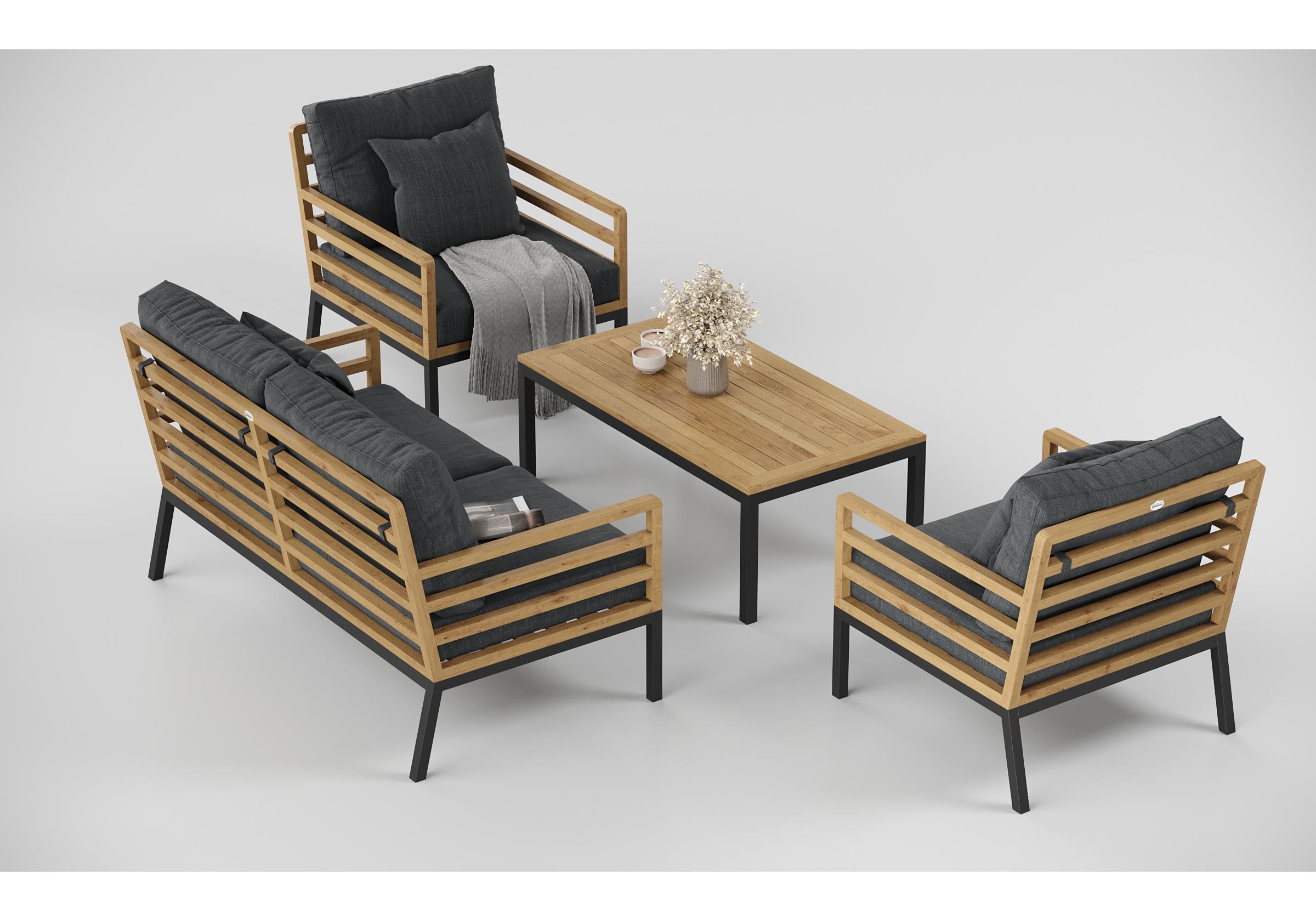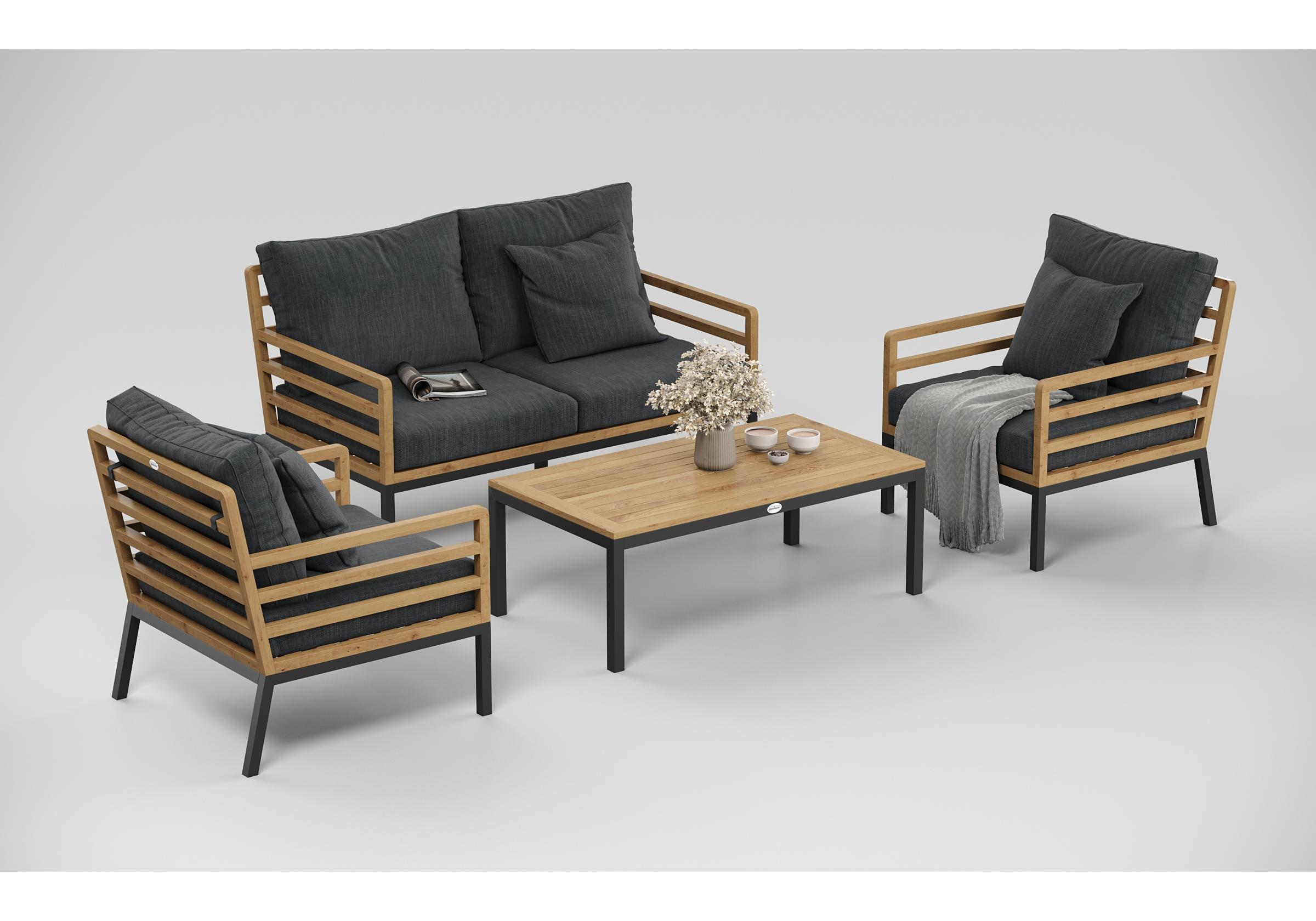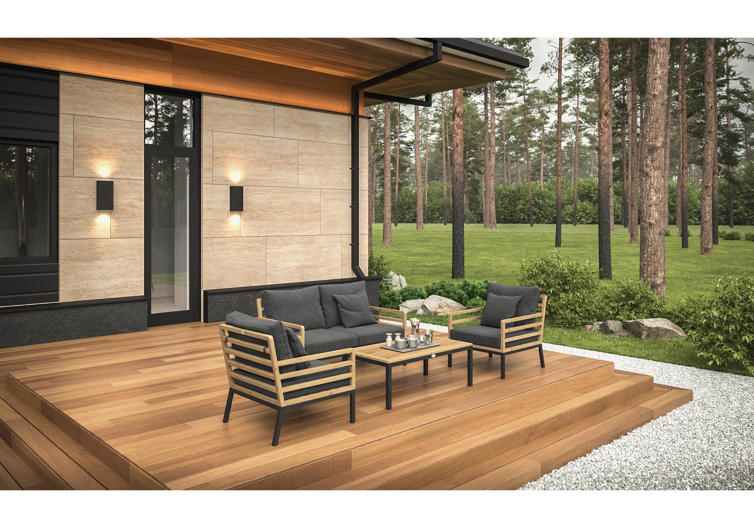 Особенности: каркас дивана и кресел из тика, подножье из алюминия, столешница столика из тиковых планок, премиальная уличная ткань, съемные чехлы подушек "на молнии", в комплекте 3 декоративные подушки