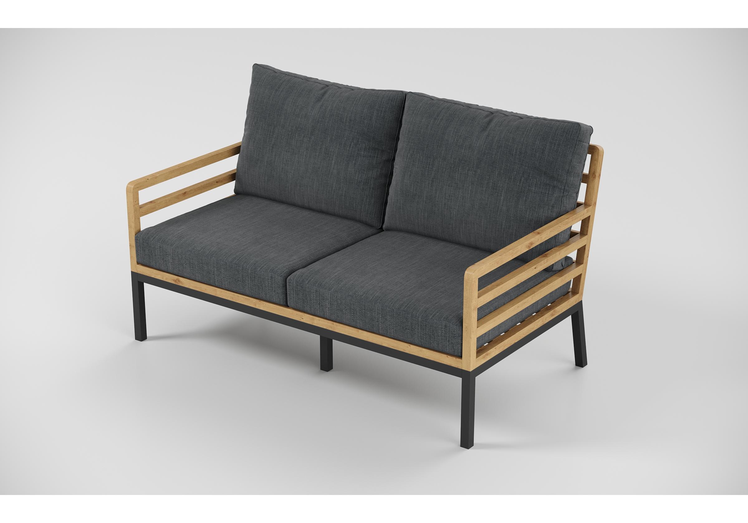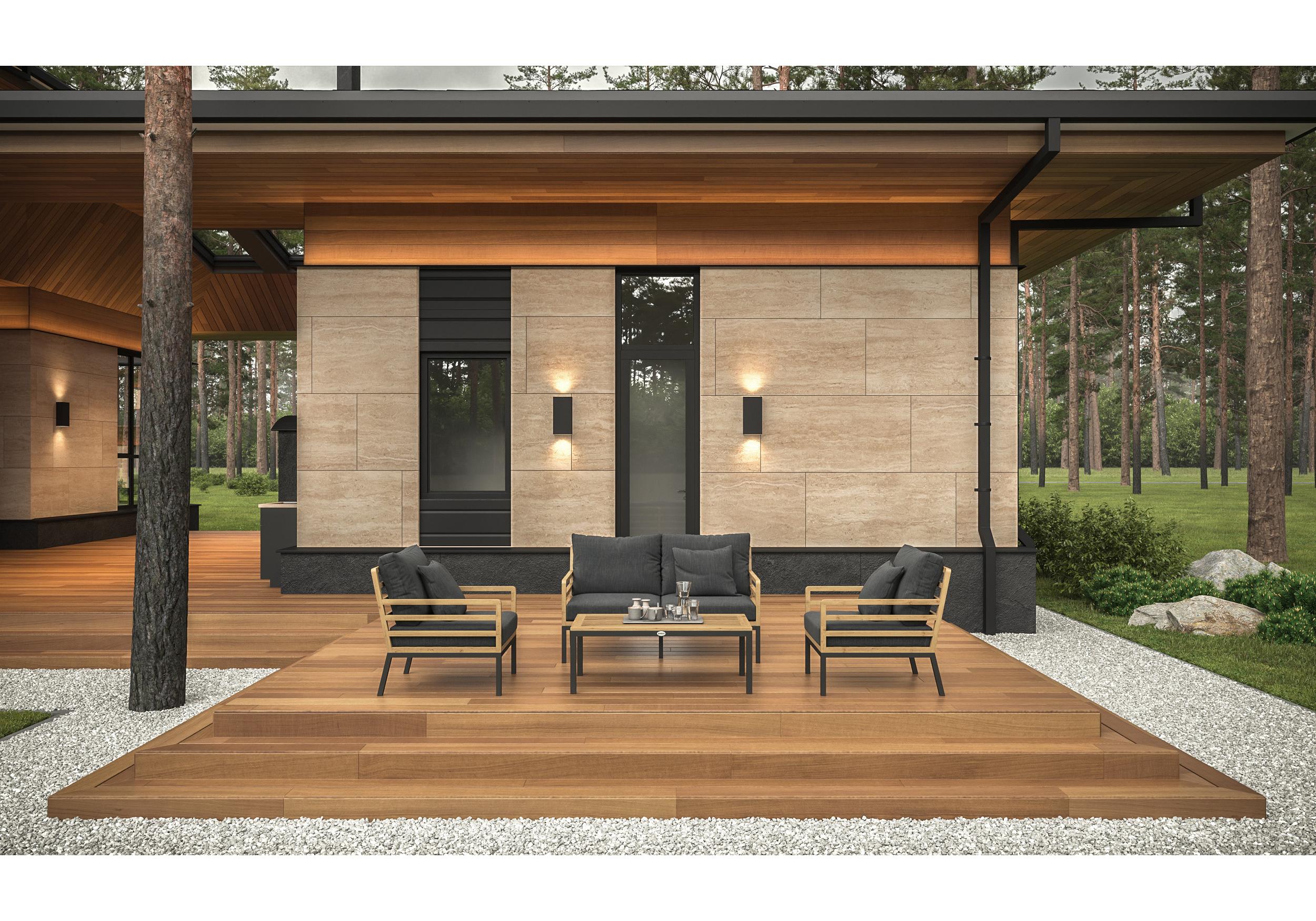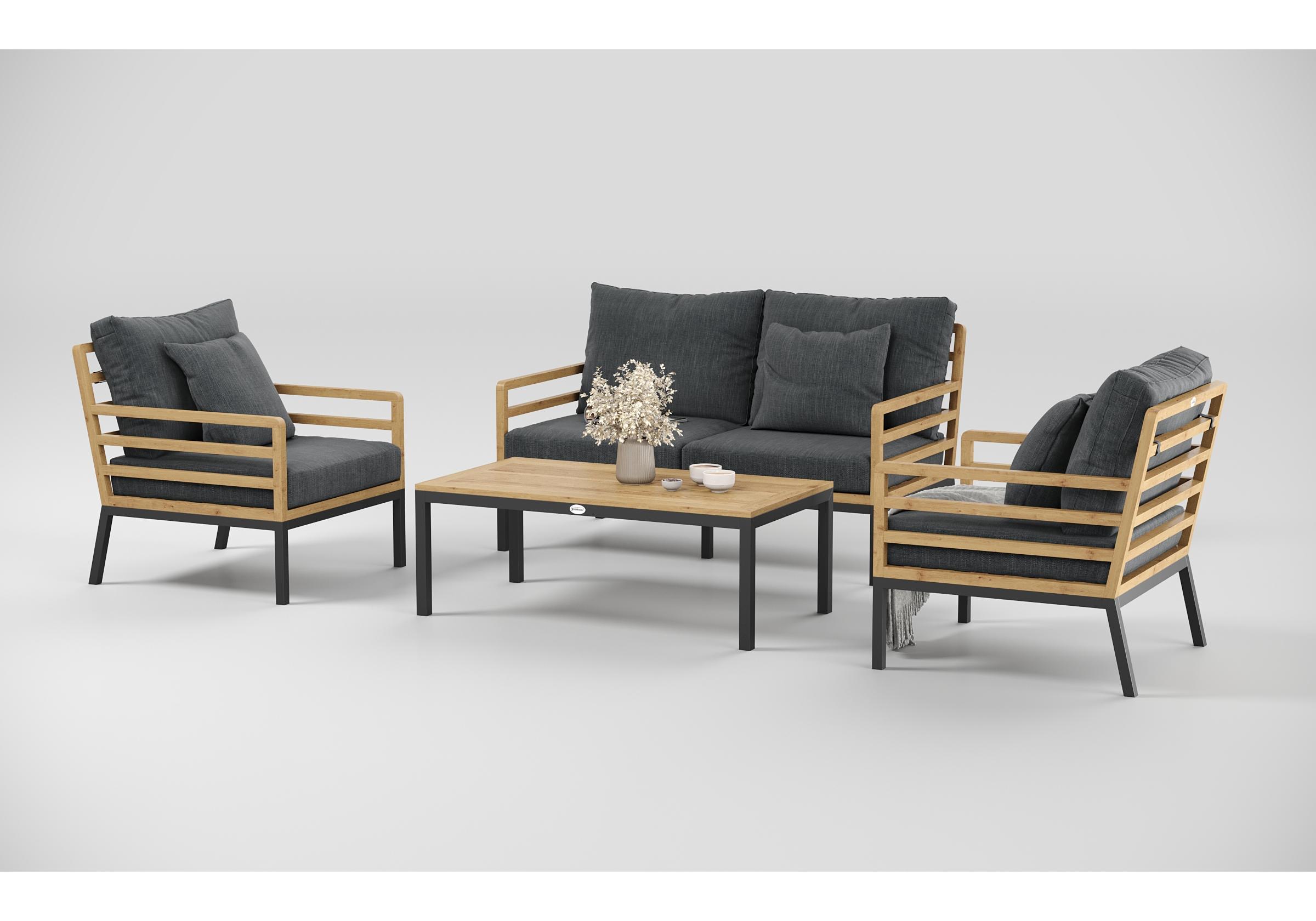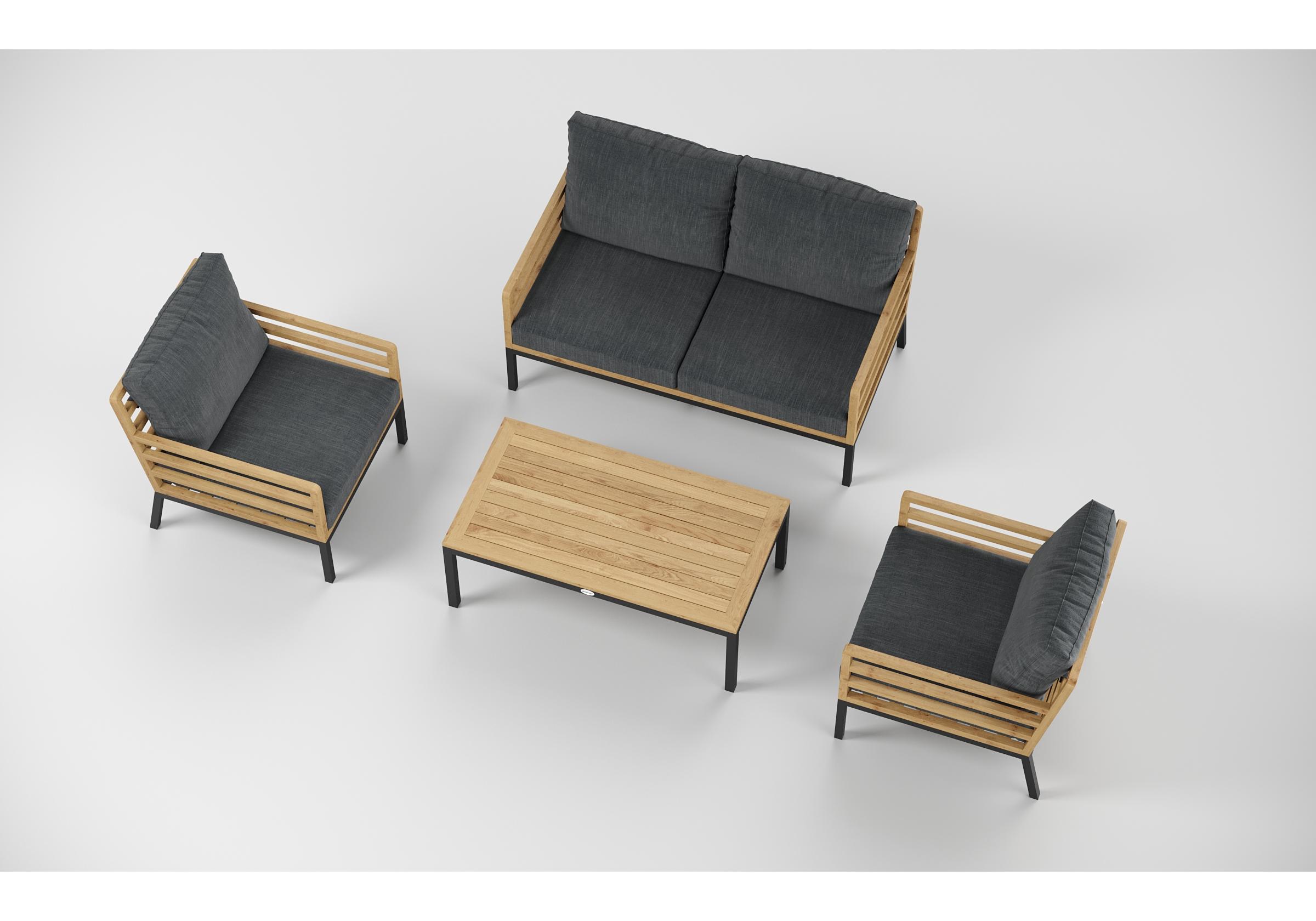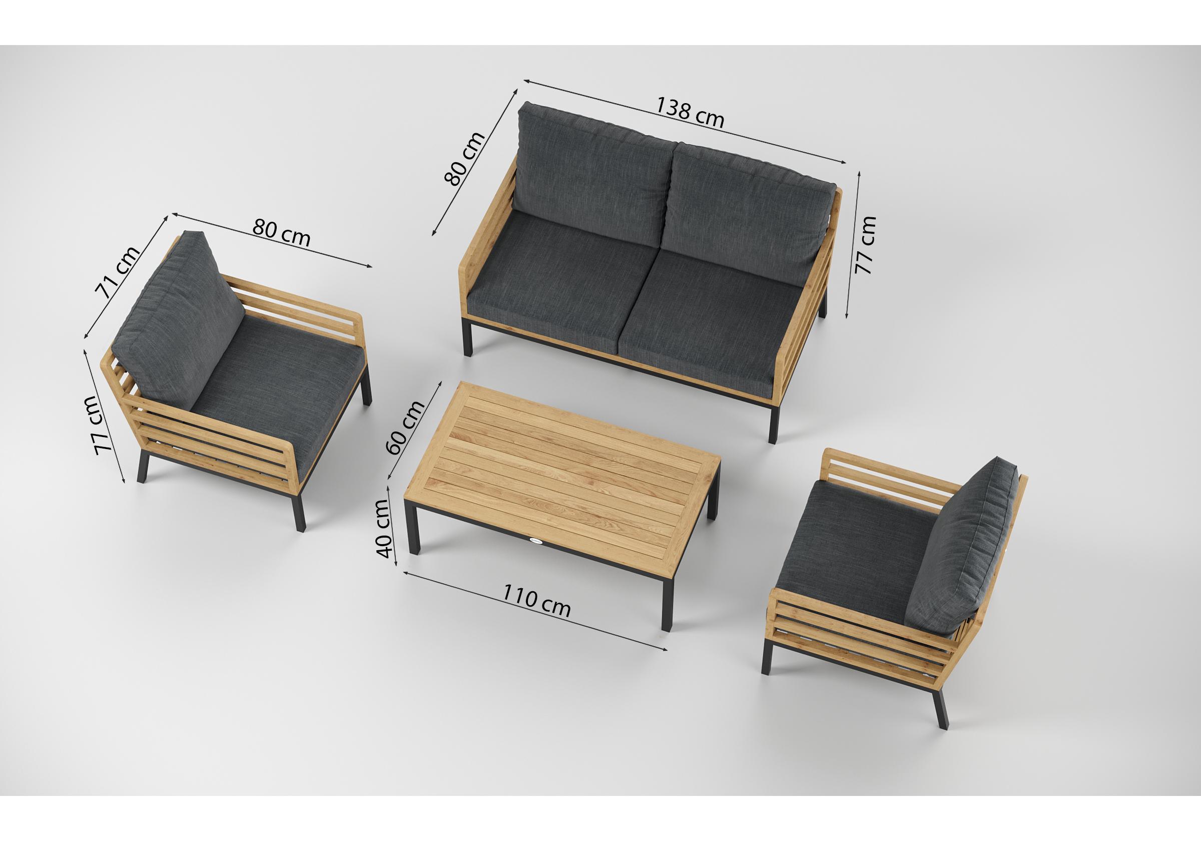 Особенности: каркас дивана и кресел из тика, подножье из алюминия, столешница столика из тиковых планок, премиальная уличная ткань, съемные чехлы подушек "на молнии", в комплекте 3 декоративные подушки