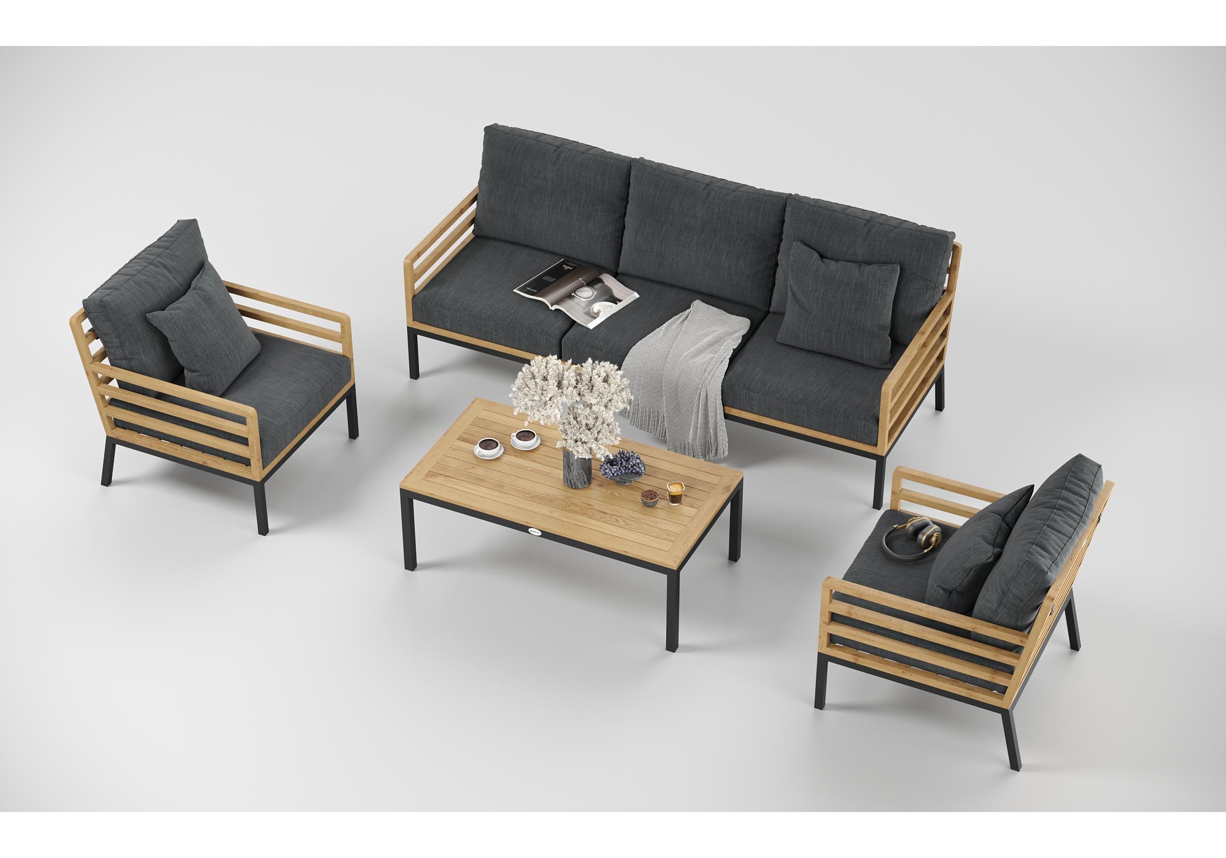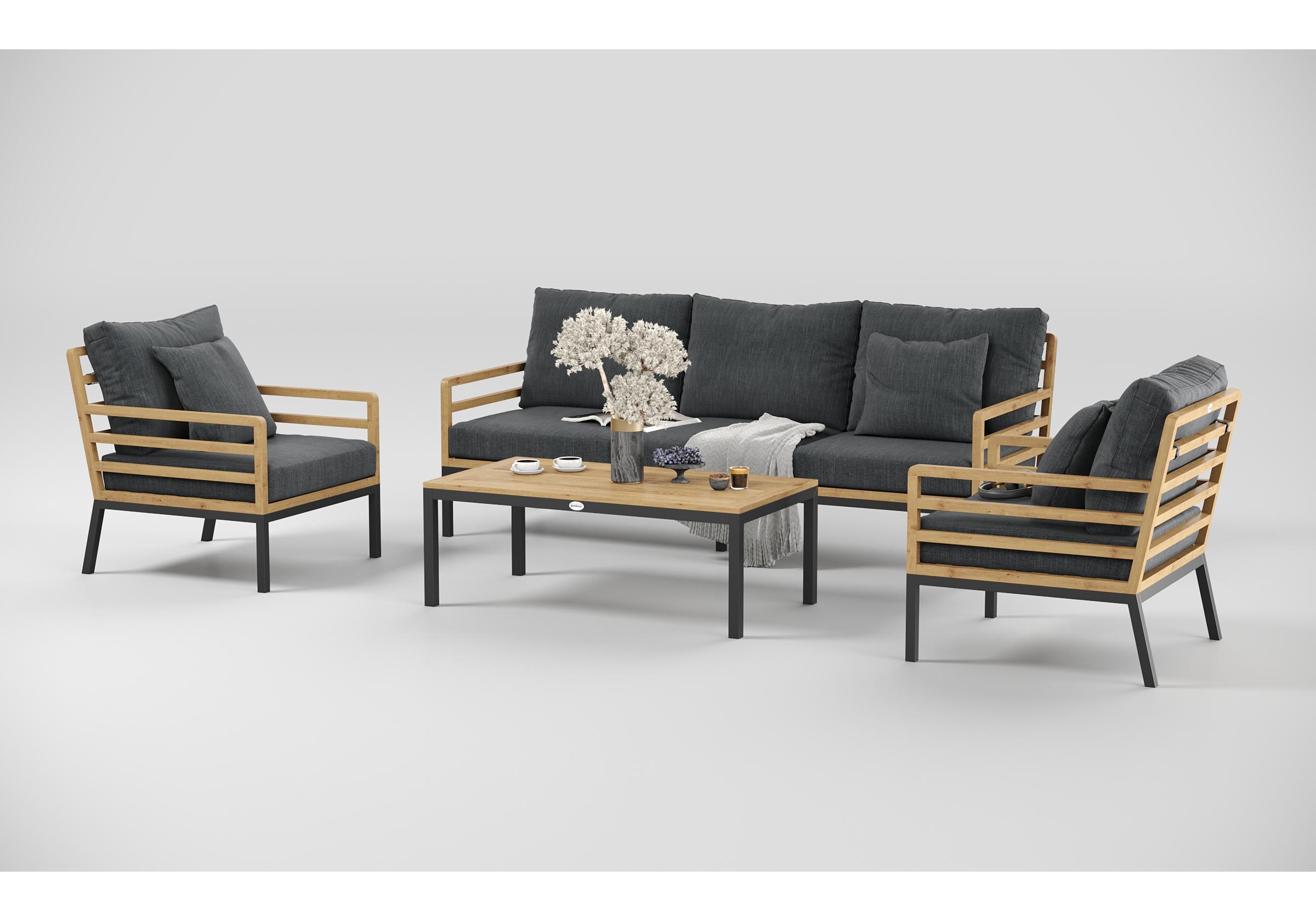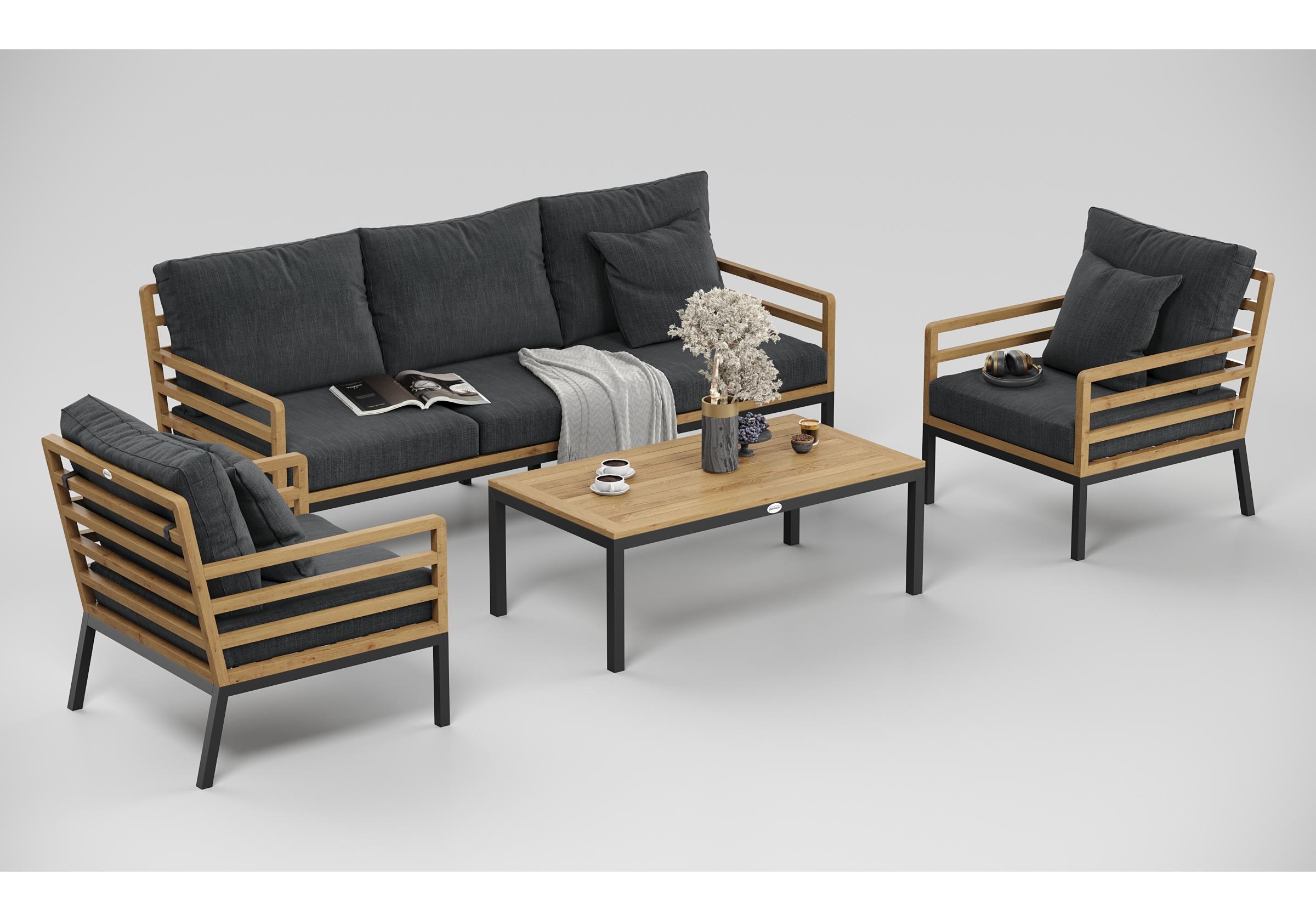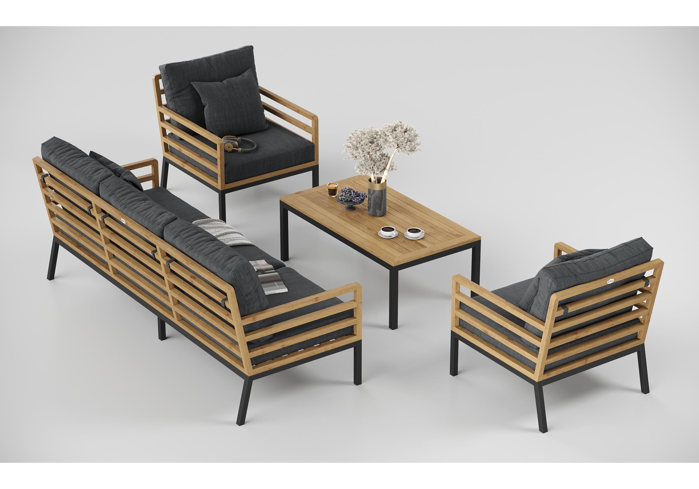 Особенности: каркас дивана и кресел из тика, подножье из алюминия, столешница столика из тиковых планок, премиальная уличная ткань, съемные чехлы подушек "на молнии", в комплекте 3 декоративные подушки