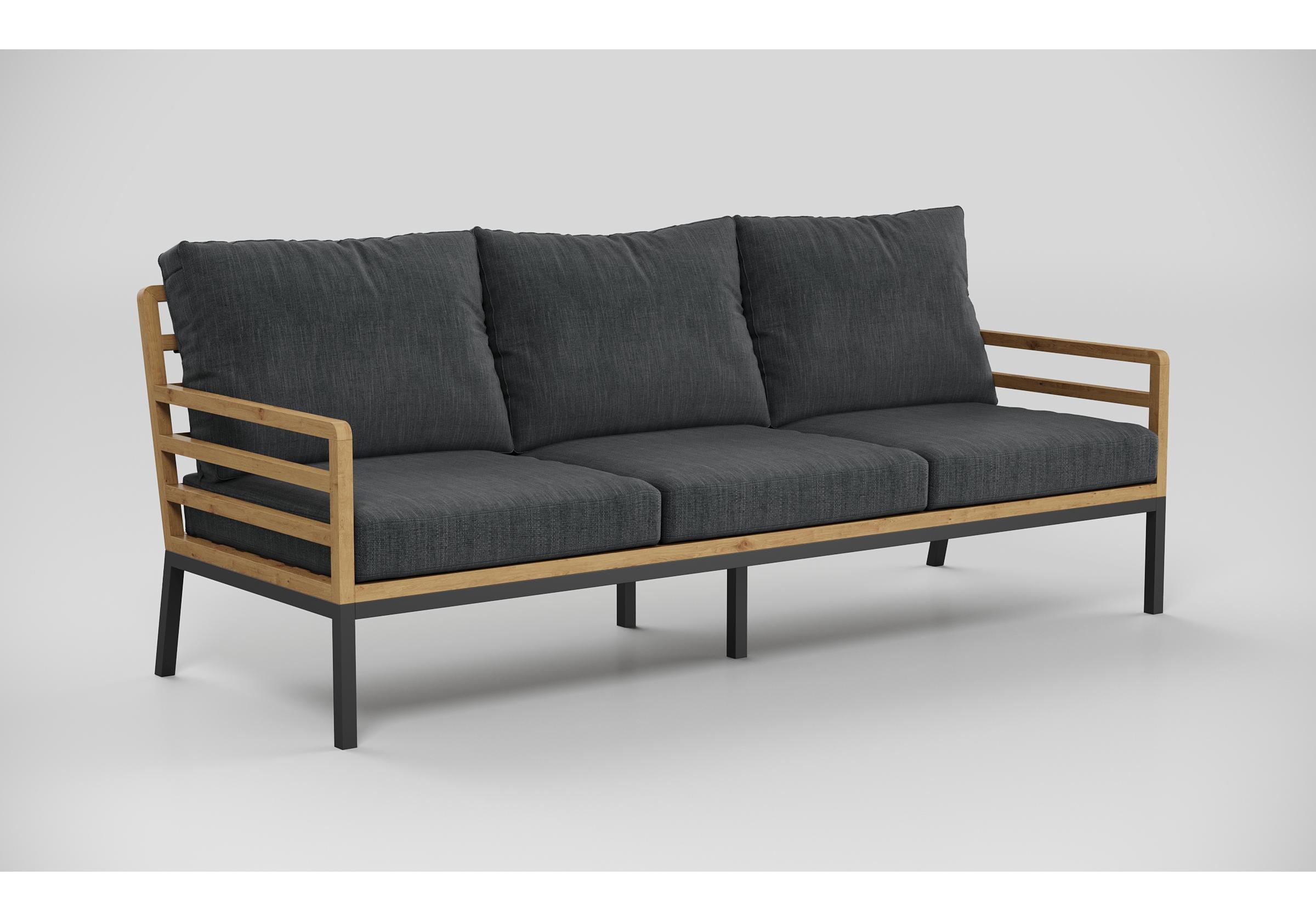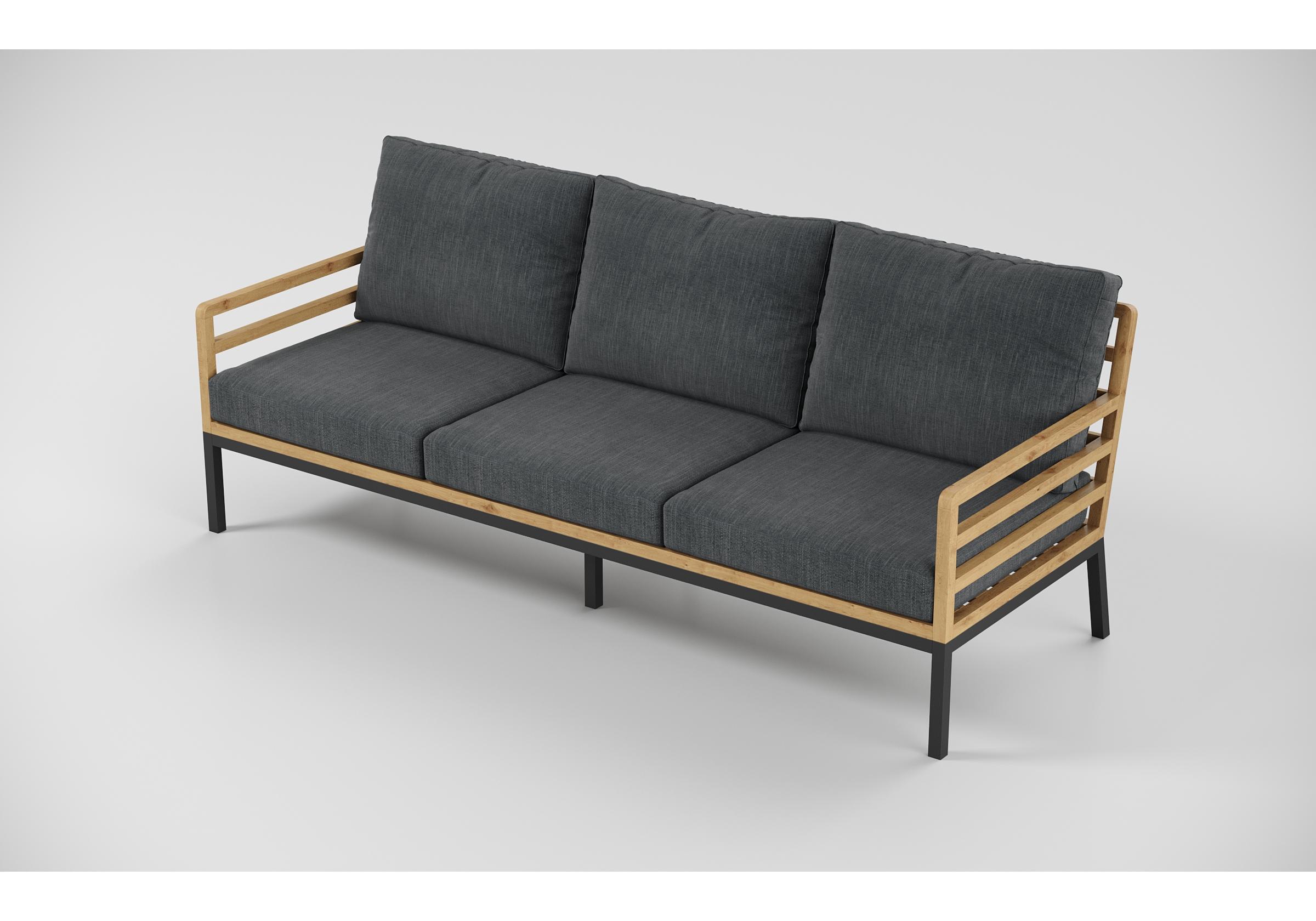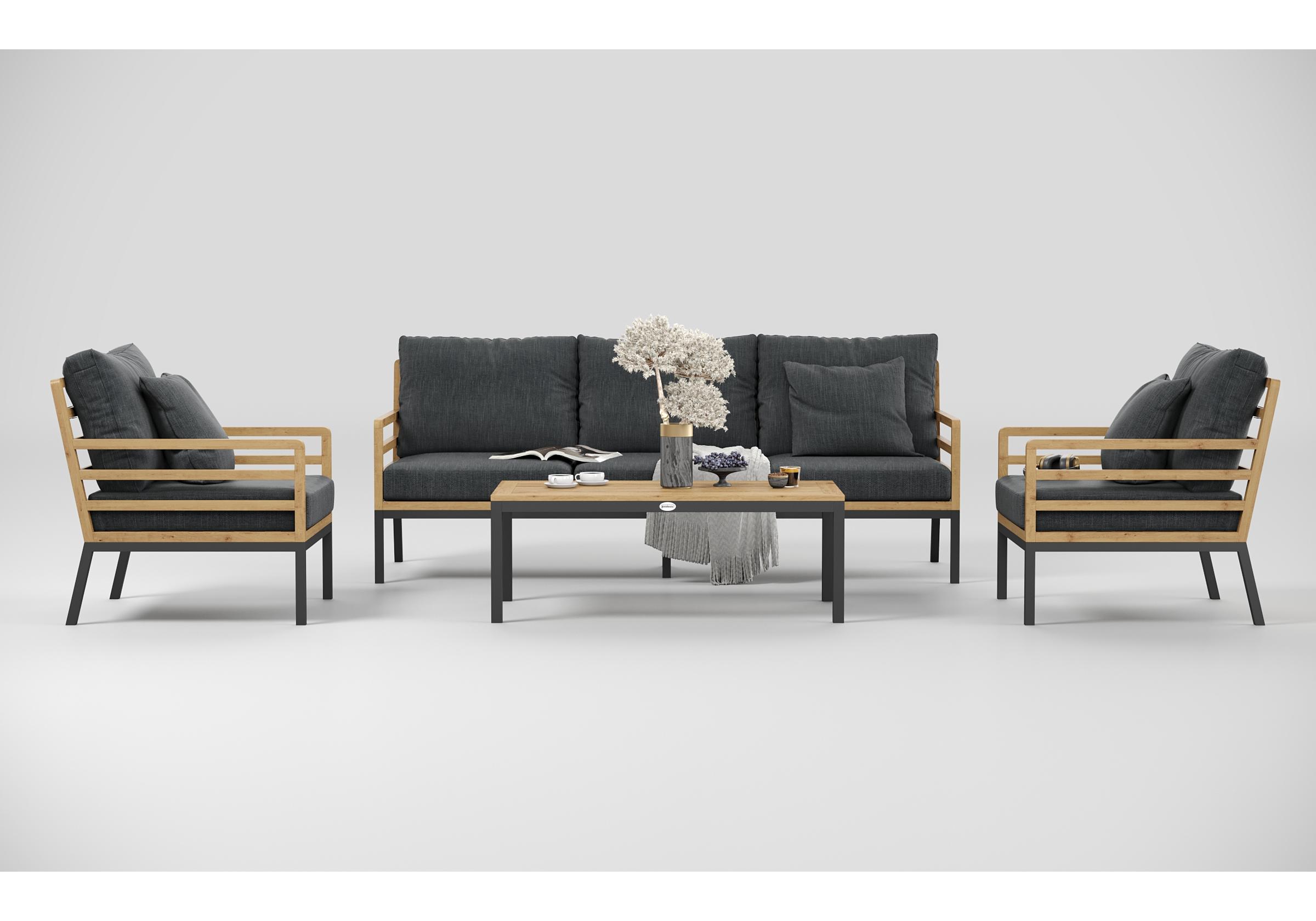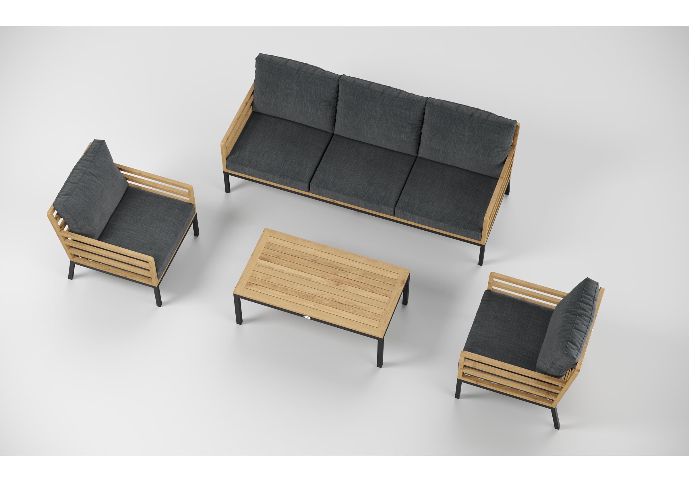 Особенности: каркас дивана и кресел из тика, подножье из алюминия, столешница столика из тиковых планок, премиальная уличная ткань, съемные чехлы подушек "на молнии", в комплекте 3 декоративные подушки