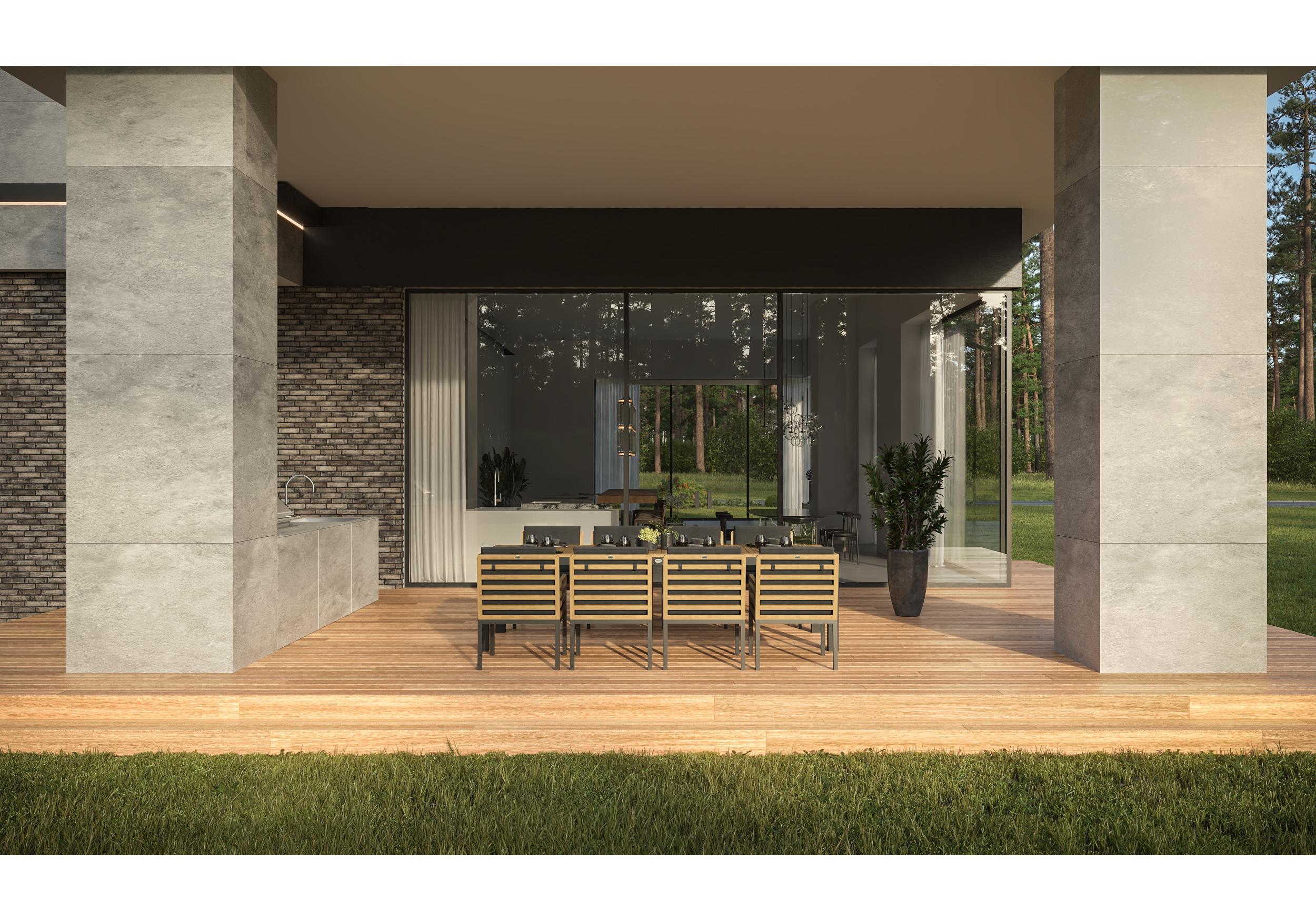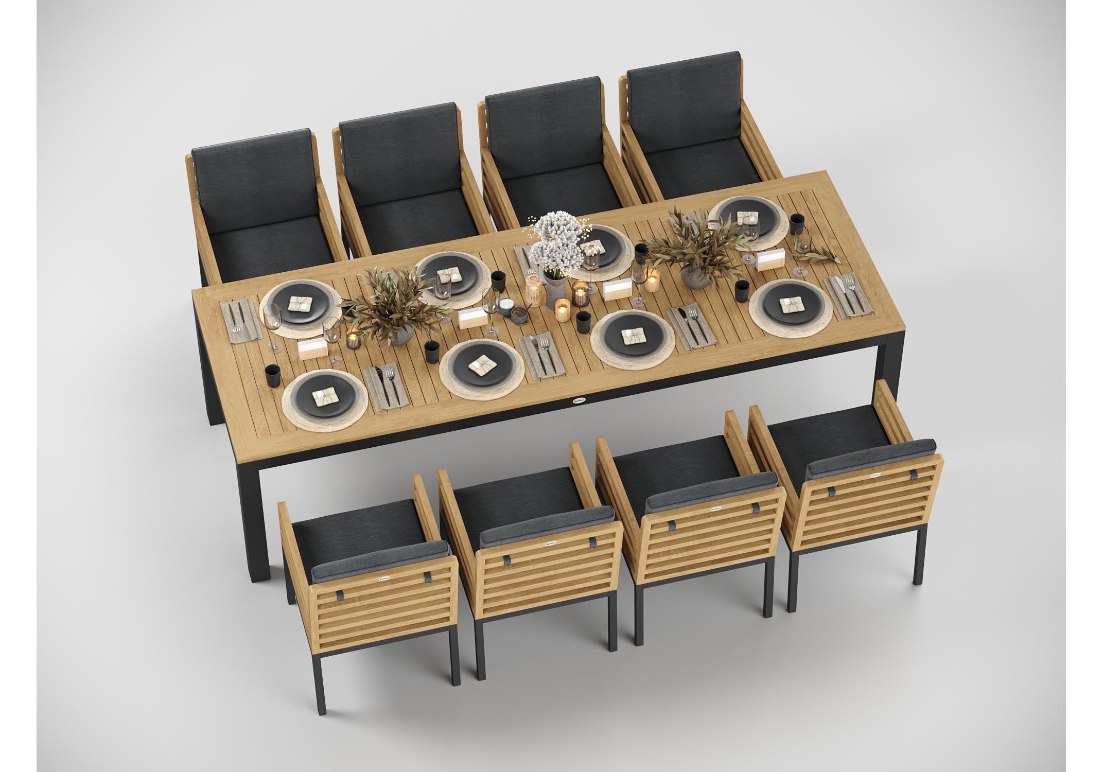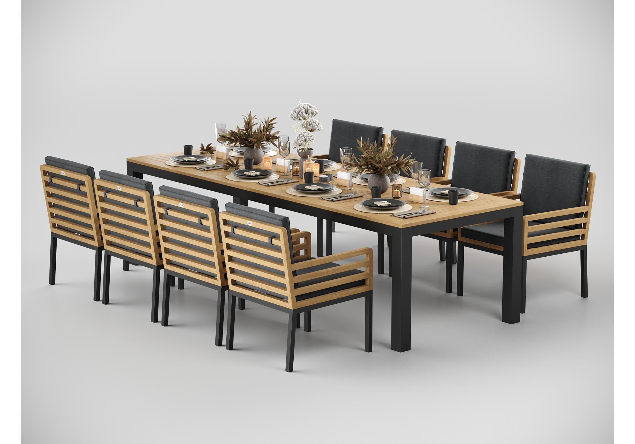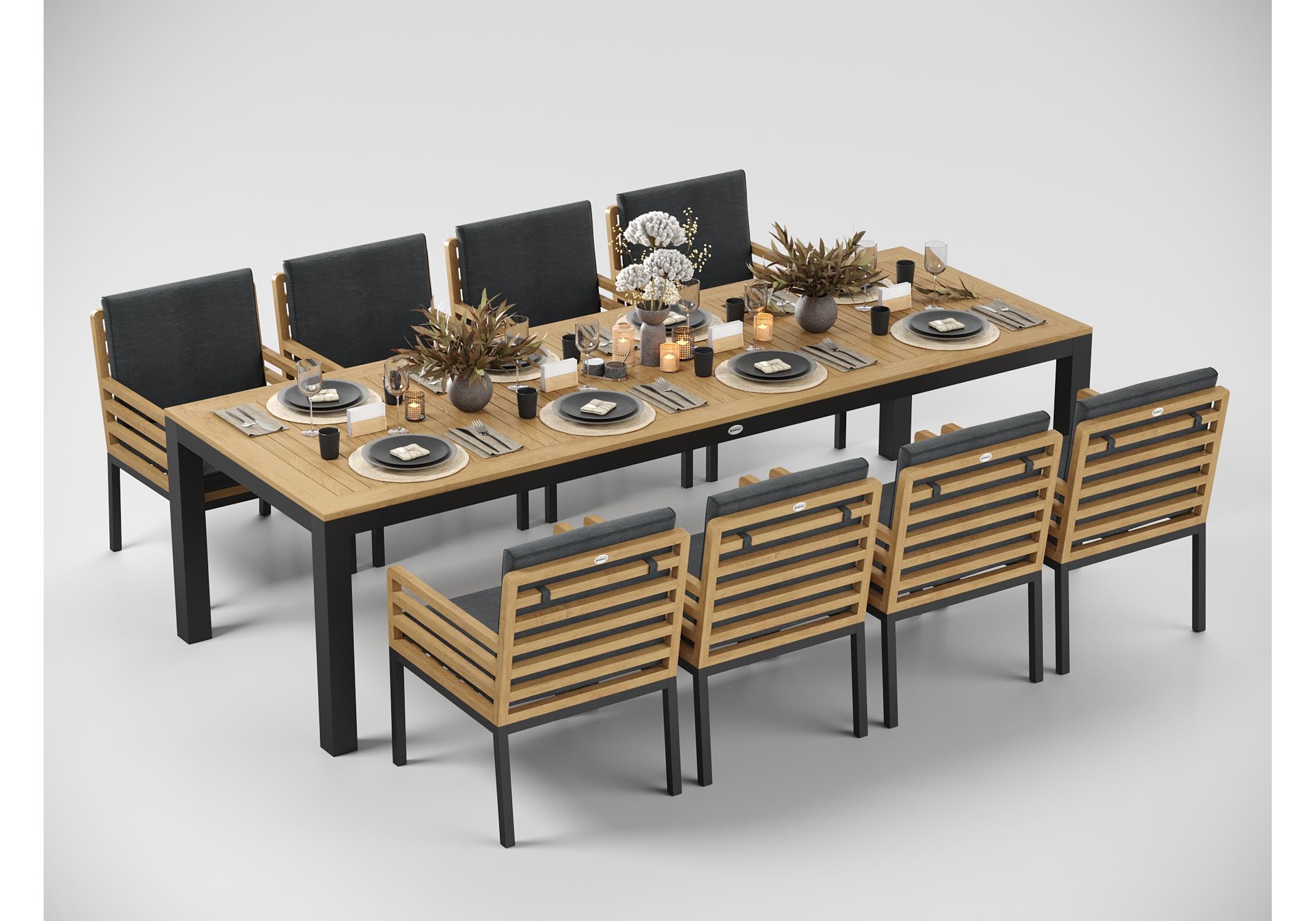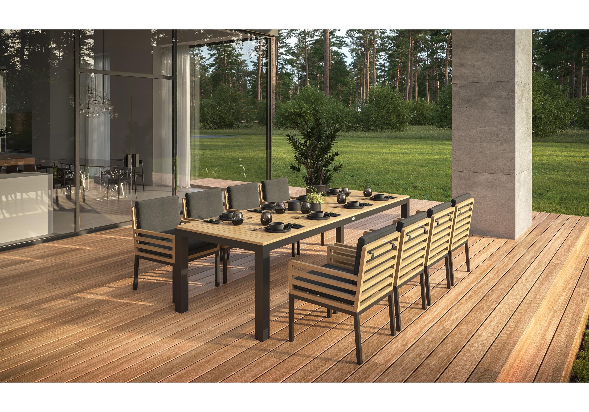 Особенности: каркас стула из тика, подножье из алюминия, премиальная уличная ткань, съемный чехол на "молнии", липучки для крепления подушки к каркасу спинки; каркас стола из алюминия, столешница из тиковых планок