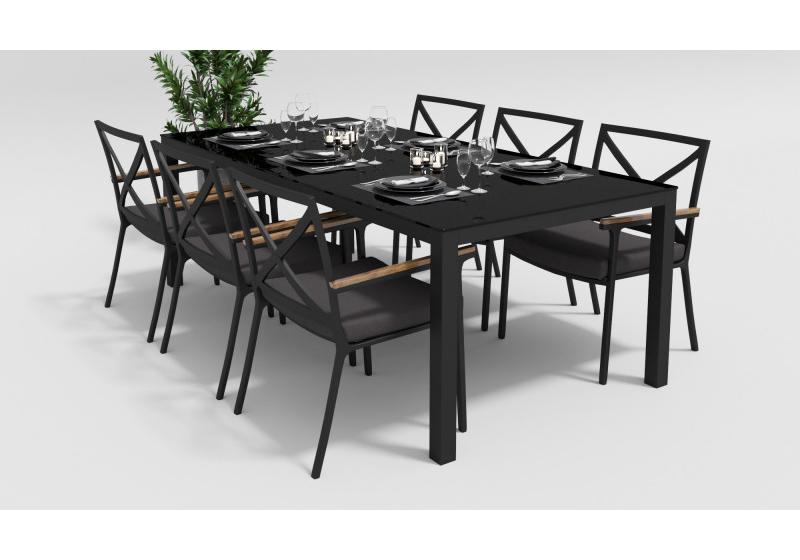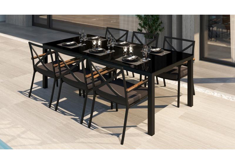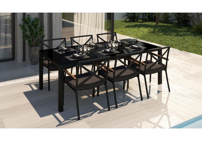 Материалы: всесезонный алюминий, ткань для улицы, закаленное стекло, тик