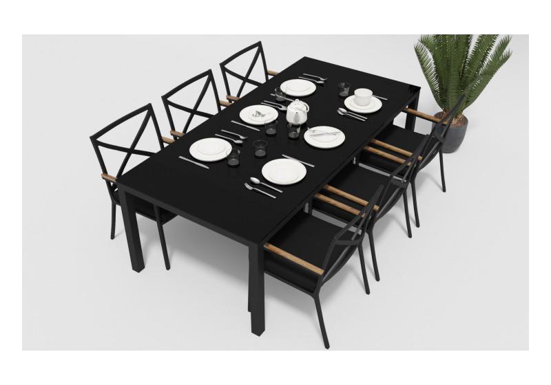 Материалы: всесезонный алюминий, ткань для улицы, закаленное стекло, тик
