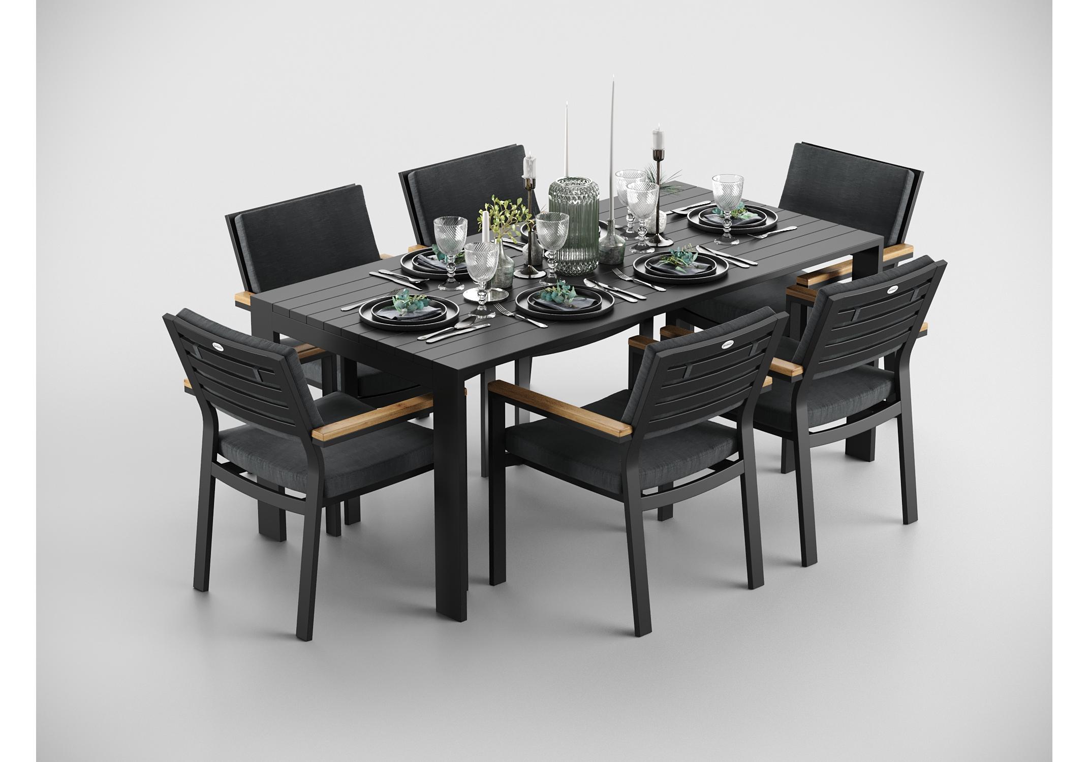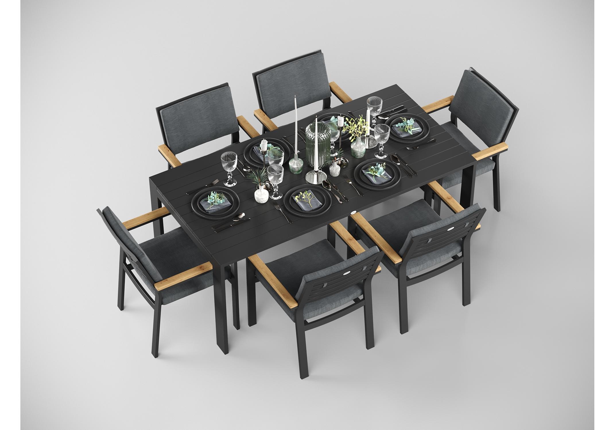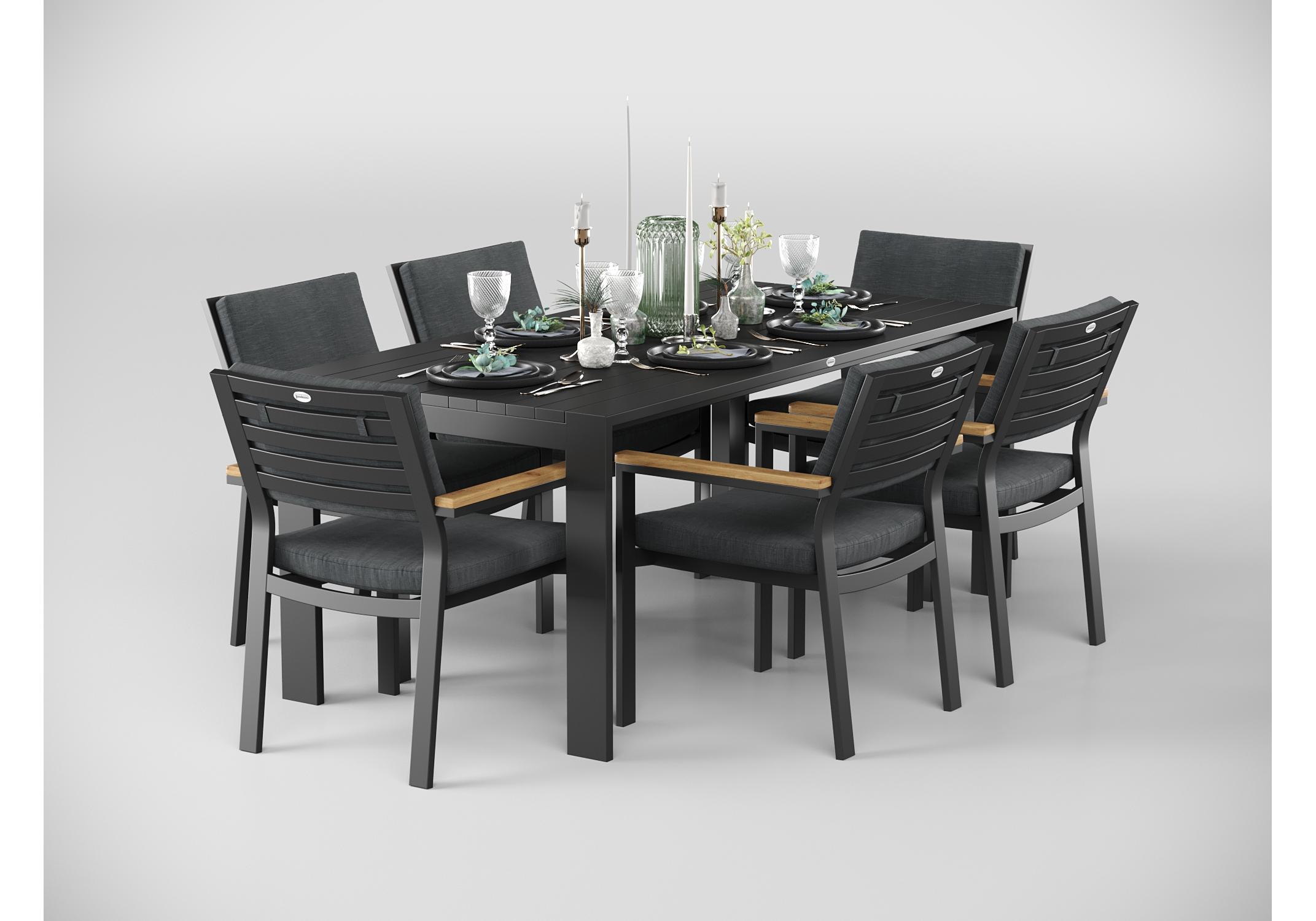 Особенности: каркас мебели выполнен из всесезонного алюминия с порошковым покрытием темно-серого цвета (карбон), подушки спинок и сидений стульев обшиты премиальной уличной тканью темно-серого цвета, толщина подушек 5 см, чехол съемный на "молнии", столешница обеденного стола изготовлена из алюминиевых планок шириной 7 см