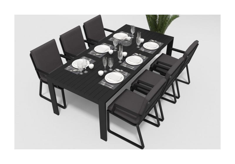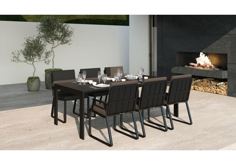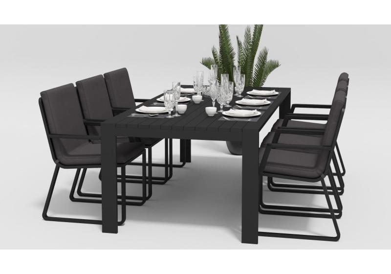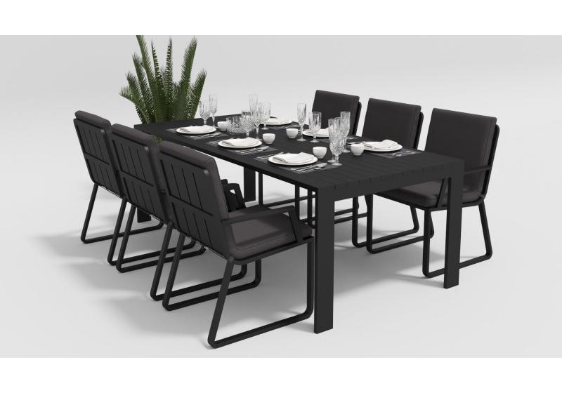 Особенности:столешница из алюминиевых планок шириной 7 см, единая подушка стула с креплением к каркасу,съемный чехол подушки на "молнии"