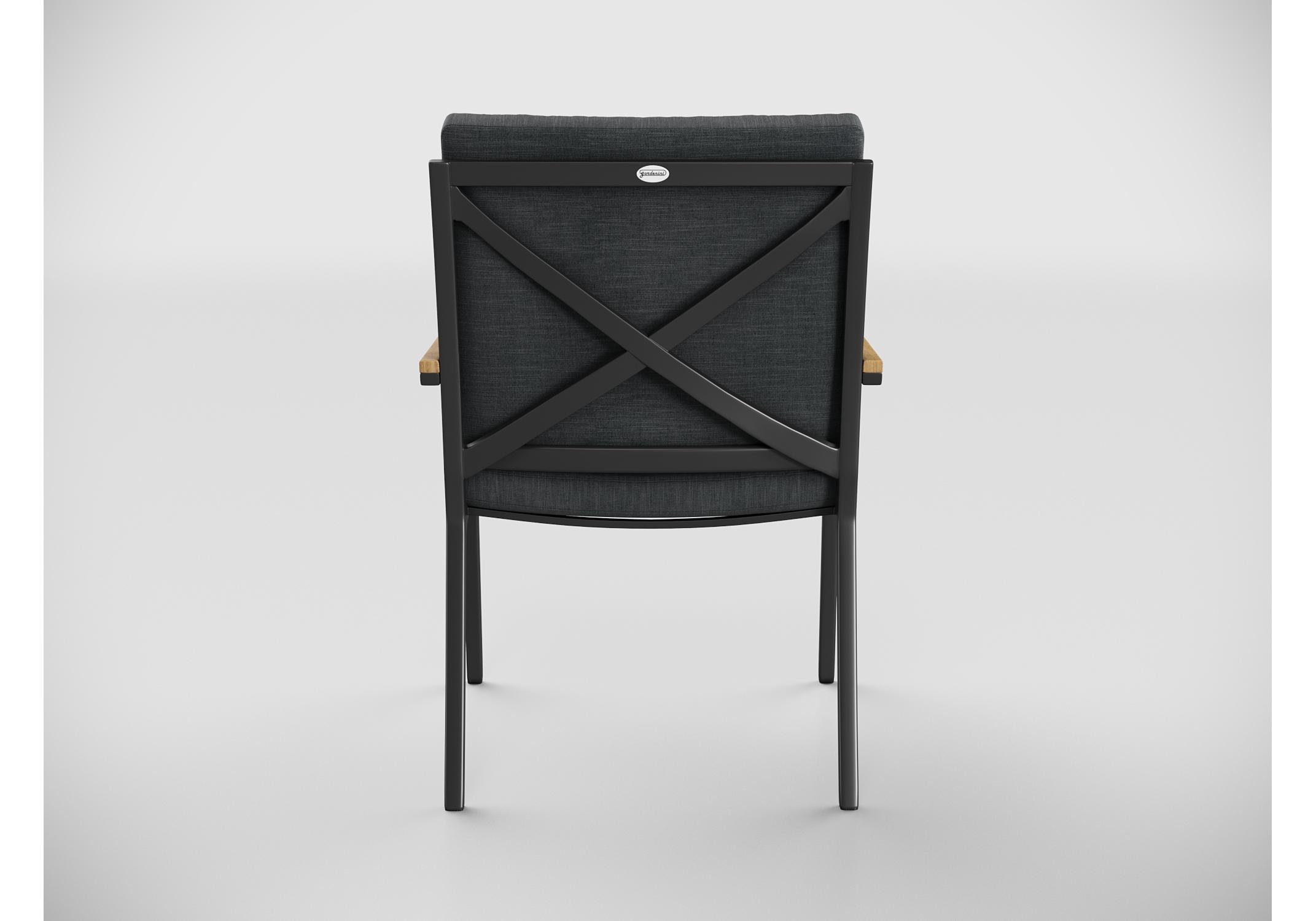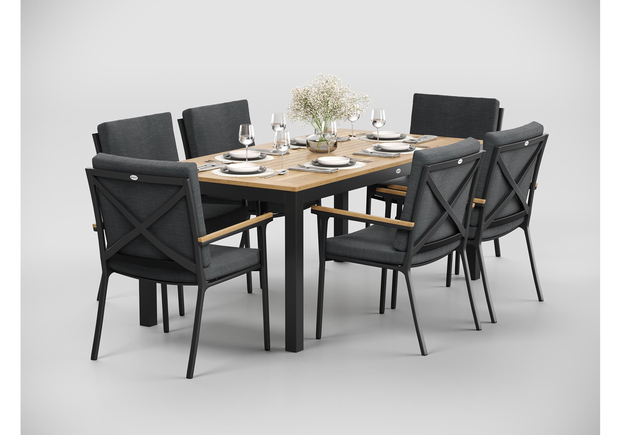 Особенности: каркас мебели выполнен из всесезонного алюминия с порошковым покрытием темно - серого цвета (карбон), подлокотники стульев декорированы вставками из тика, подушки сидений и спинки обшиты премиальной уличной тканью темно - серого цвета, толщина подушек 5 см, чехол съемный на "молнии", столешница обеденного стола изготовлена из тиковых планок
