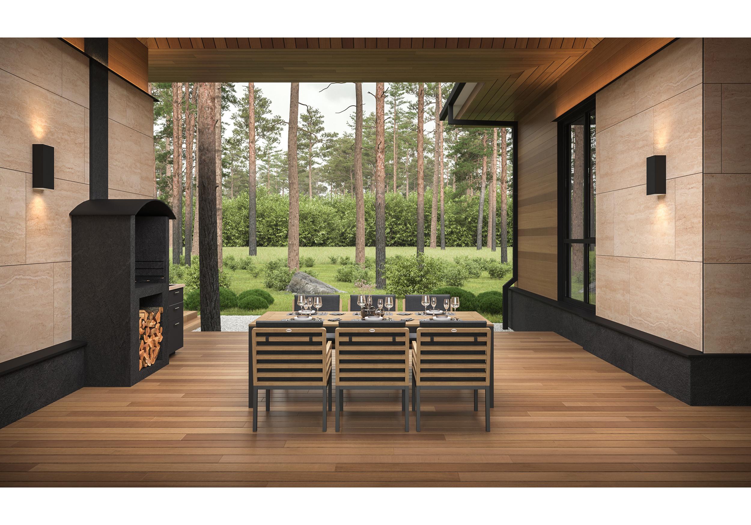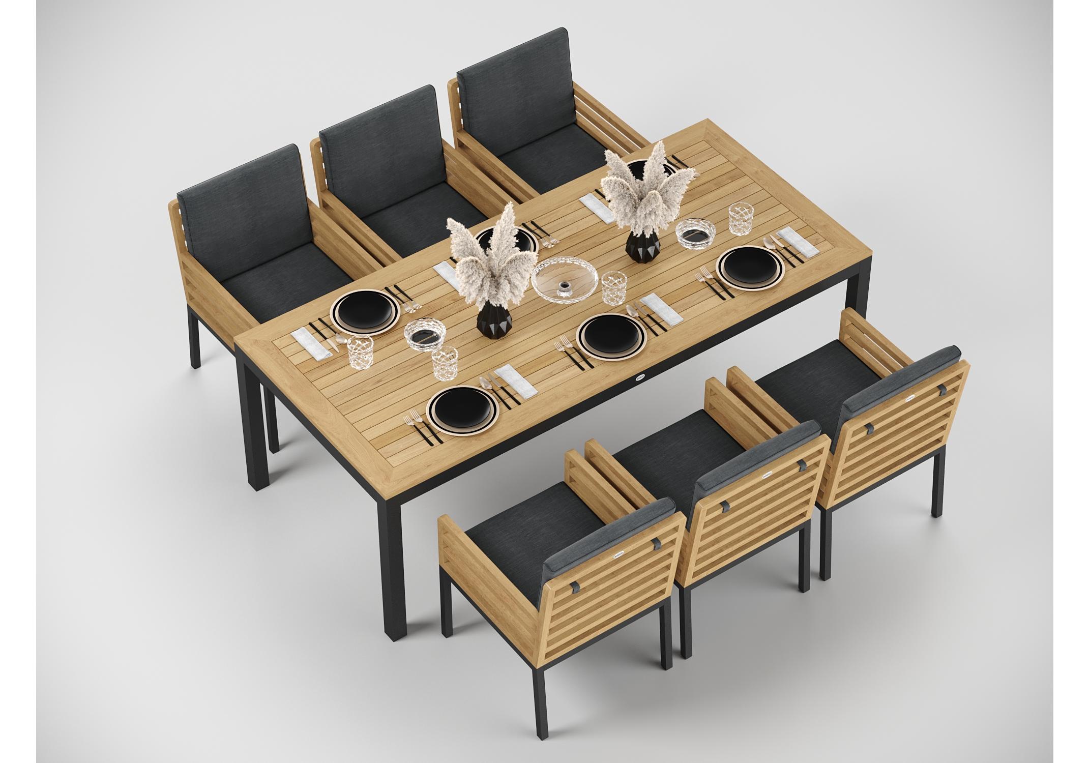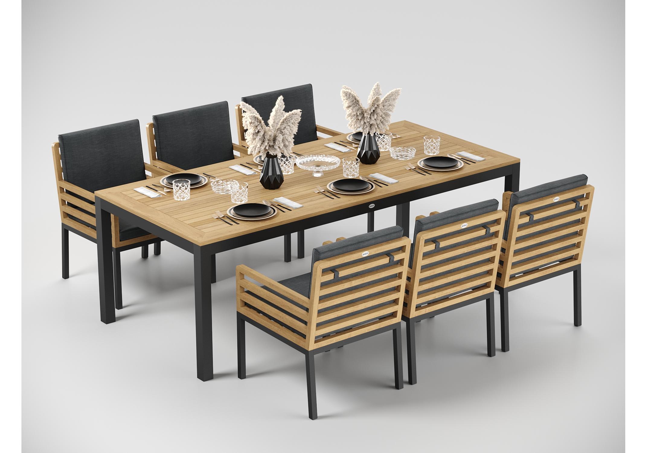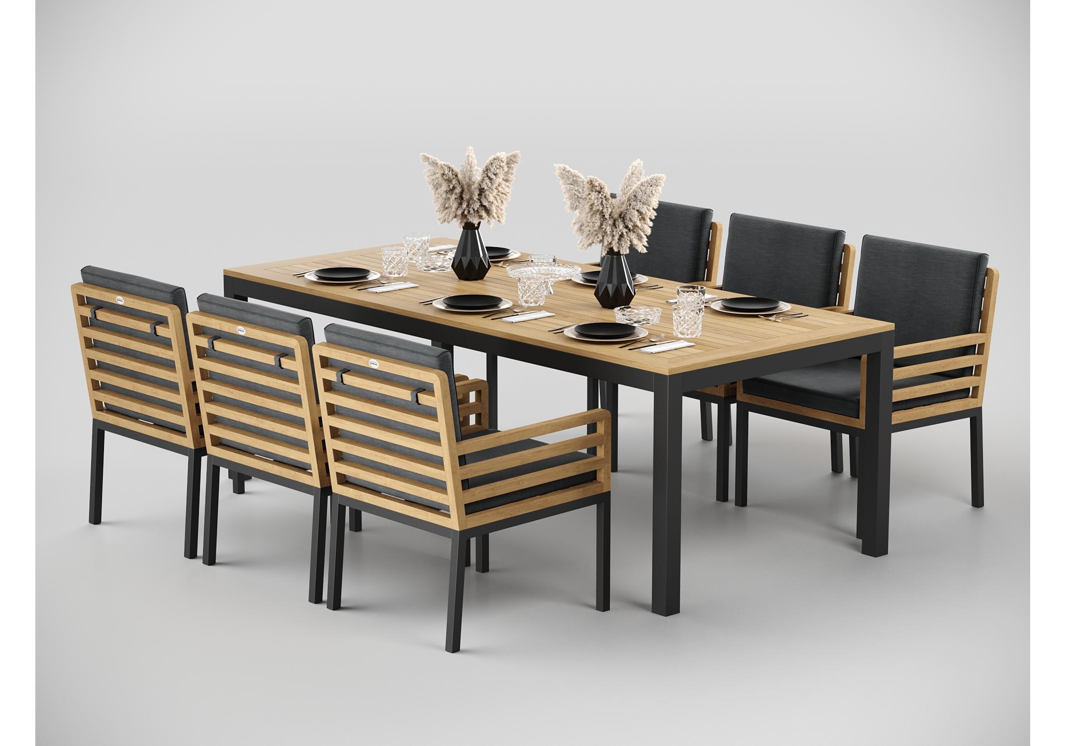 Особенности: каркас стула из тика, подножье из алюминия, премиальная уличная ткань, съемный чехол "на молнии", липучки для крепления подушки к каркасу спинки; каркас стола из алюминия, столешница из тиковых планок
