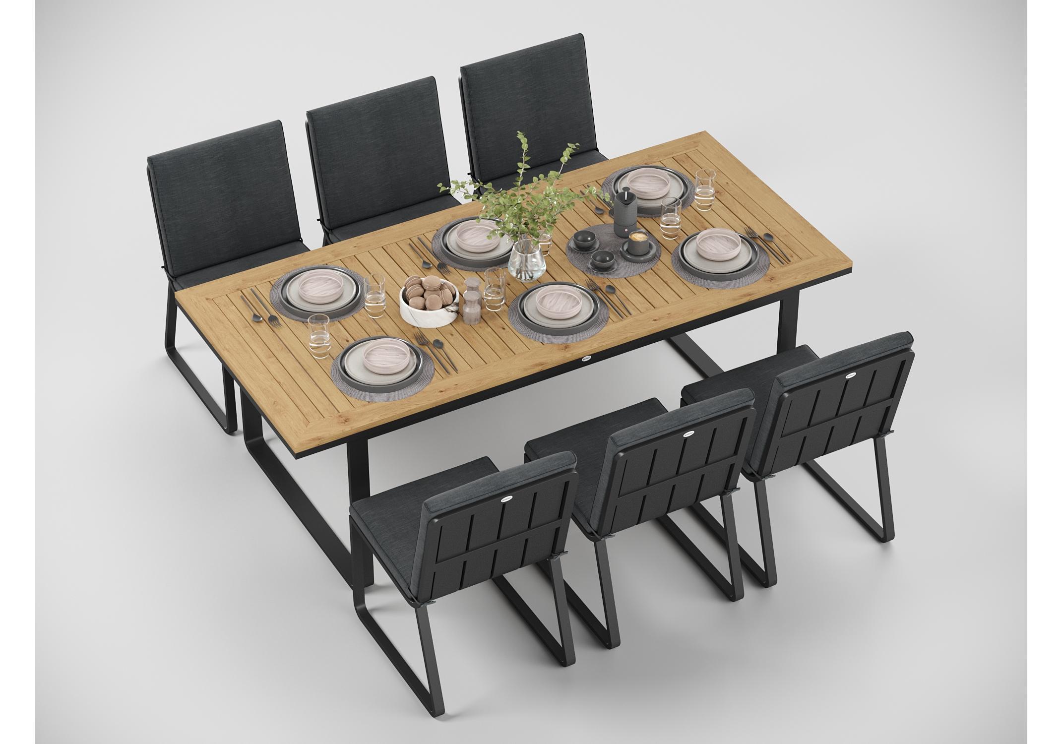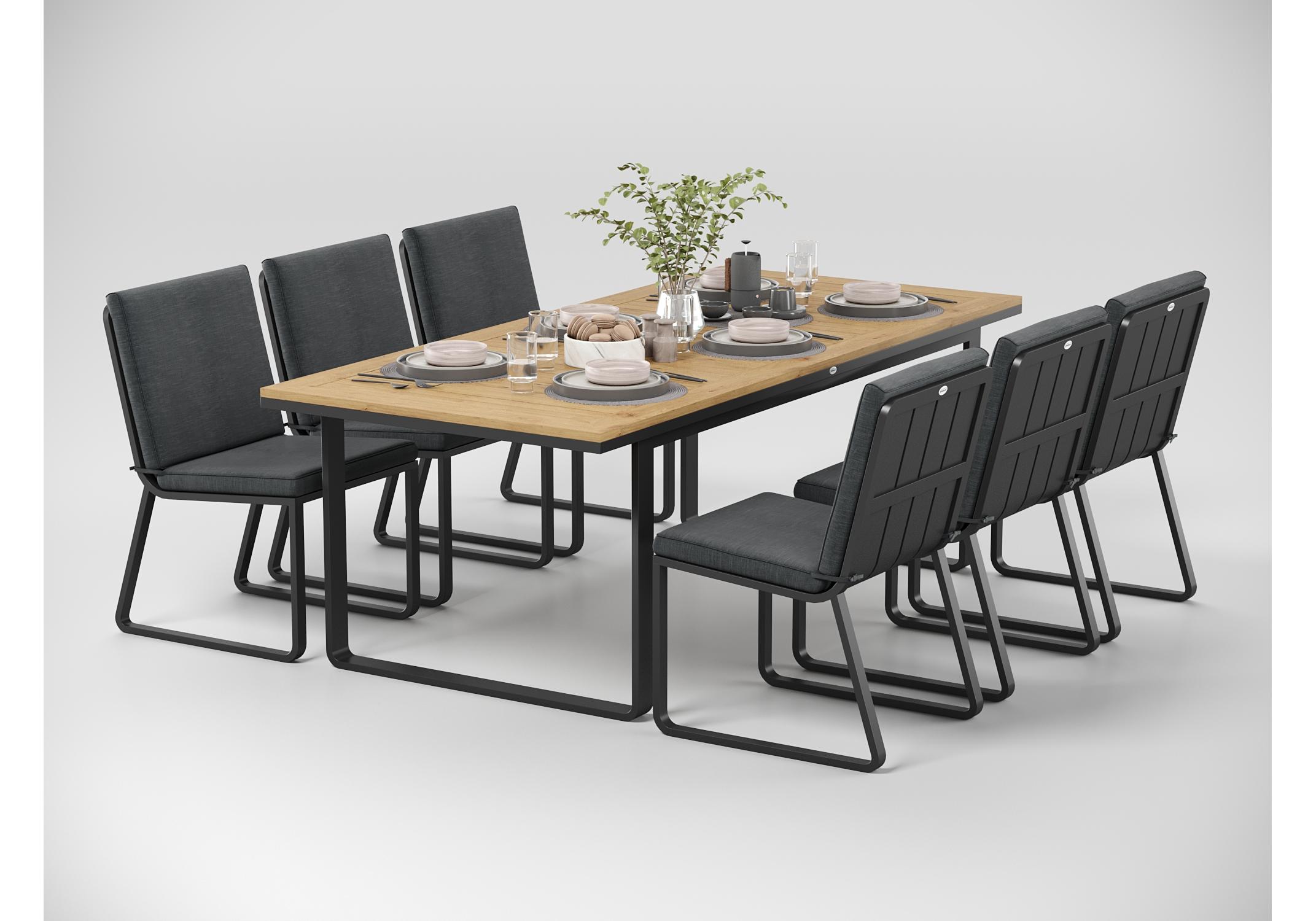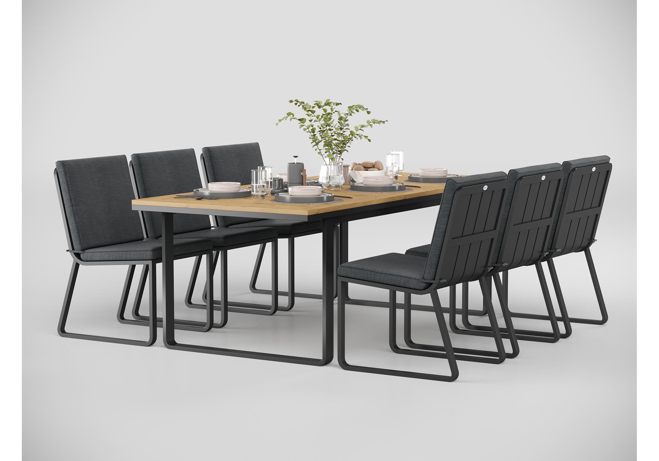 Особенности: каркас мебели выполнен из всесезонного алюминия с порошковым покрытием темно - серого цвета (карбон), подушки сидений и спинки обшиты премиальной уличной тканью темно - серого цвета, толщина подушек 5 см, чехол съемный на "молнии", столешница обеденного стола изготовлена из тиковых планок