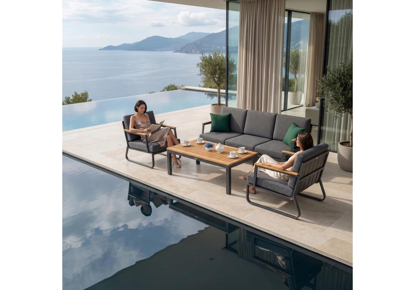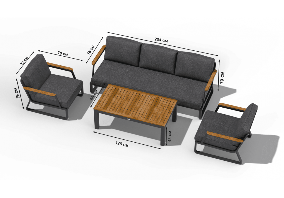 Цвет: каркас карбон (темно-серый) / подушки маренго (серый) / столешница из тика / подлокотники из тика
