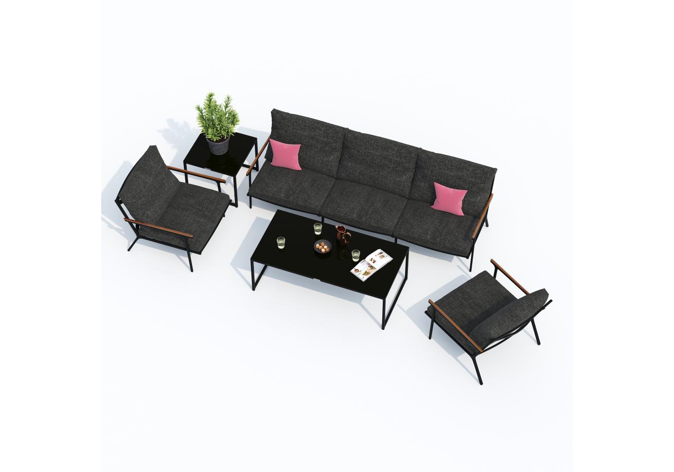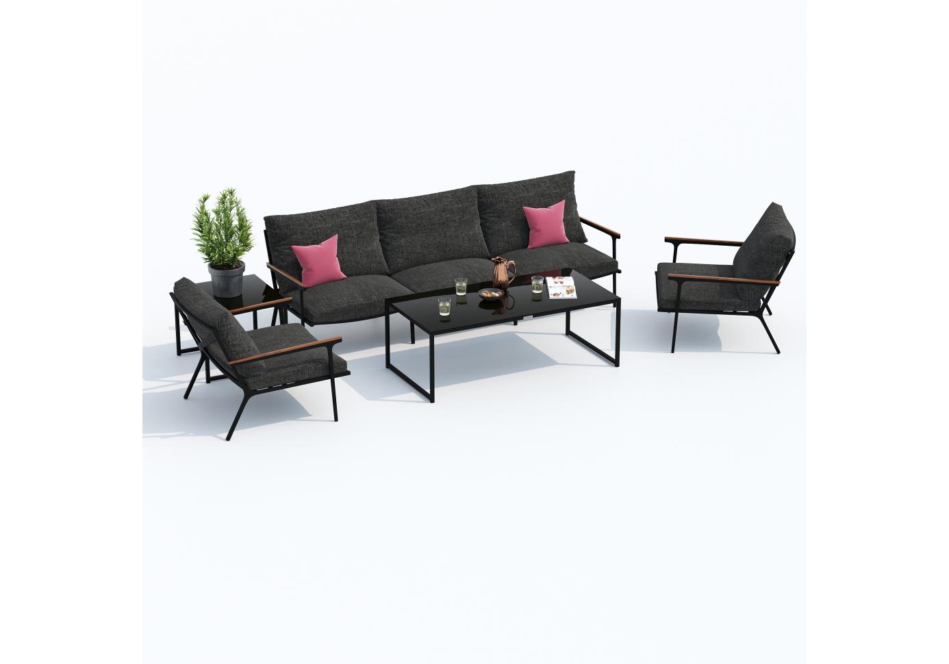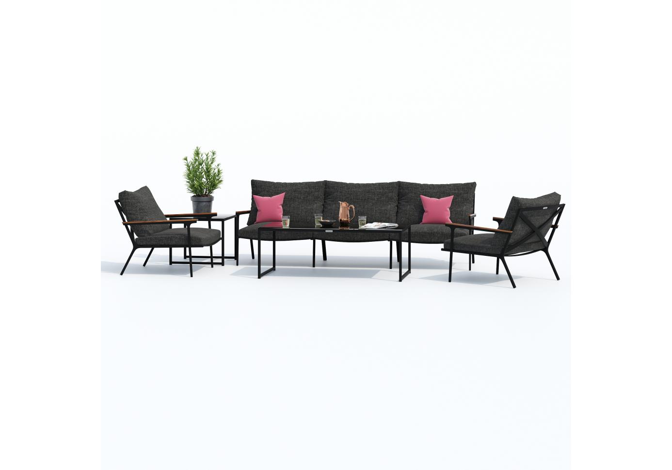Мягкий трёхместный диван, большие кресла и два журнальных столика со столешницей из чёрного глянцевого стекла - создать поистине уютное пространство для отдыха легко. Минимализм и сдержанная цветовая гамма, которую можно дополнить яркими акцентами в виде различных предметов декора. Чехлы цвета маренго идеально сочетаются с темно-серым каркасом. Они не выгорят на солнце и выдержат любые капризы погоды. Благодаря вшитой молнии их легко снять и почистить, если на них есть видимые загрязнения.