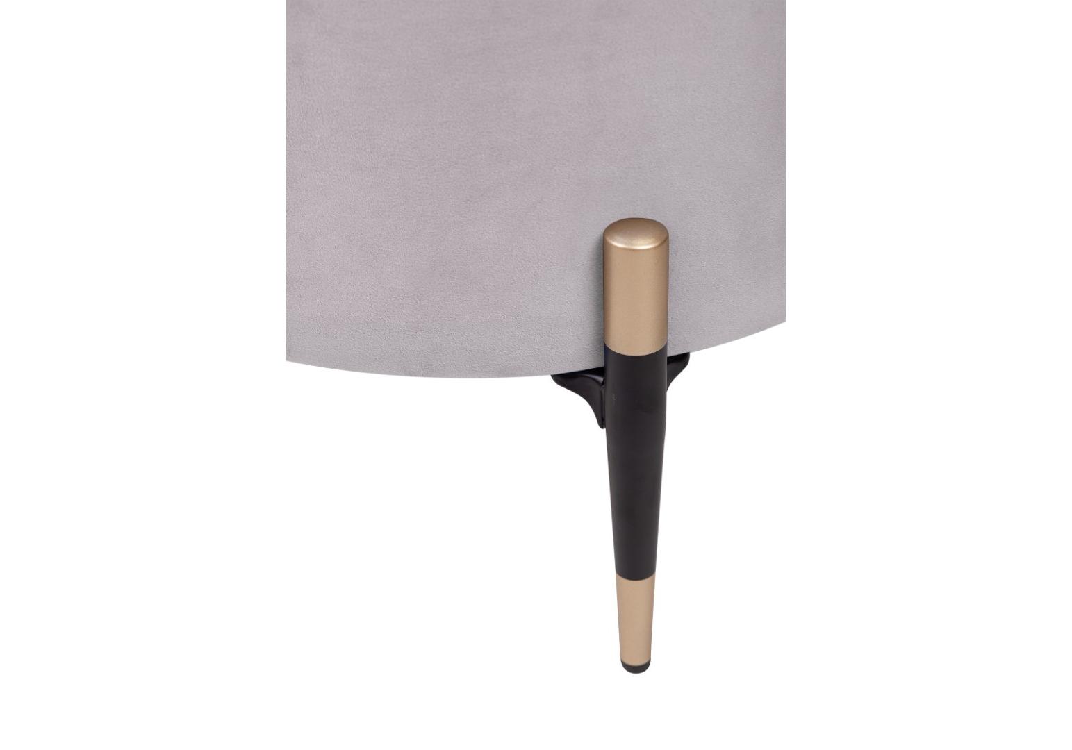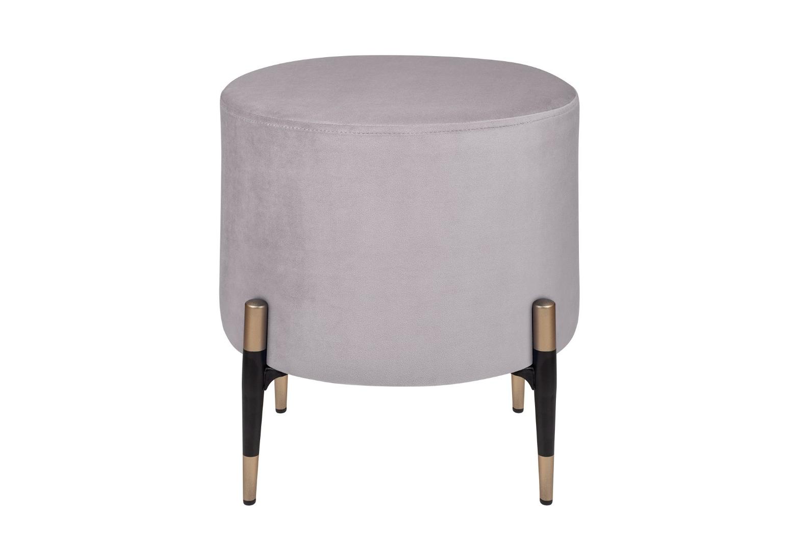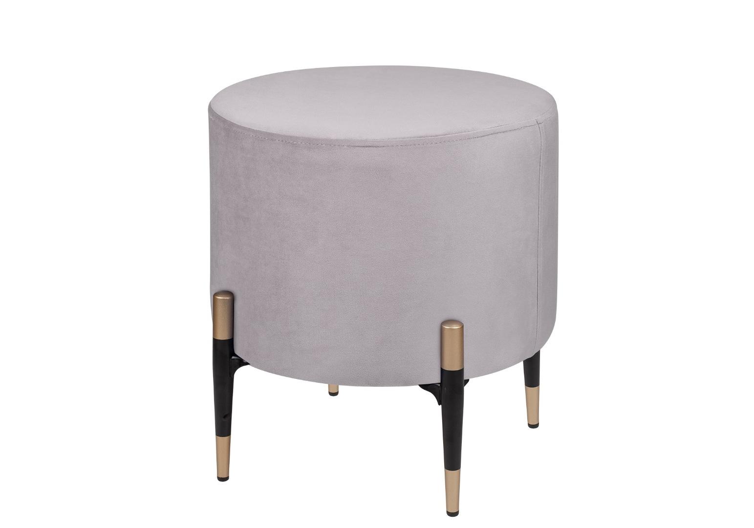 Круглый серый пуф Lutor из мягкого велюра серого цвета. Особого внимания заслуживают ножки: изящные, конусовидные, чёрные — с деликатной золотой окантовкой внизу. Именно эта деталь создаёт элегантный контраст с нежно-розовой обивкой и придаёт пуфу законченный, дизайнерский вид. Легко впишется в любой интерьер.