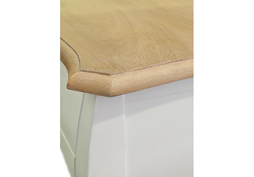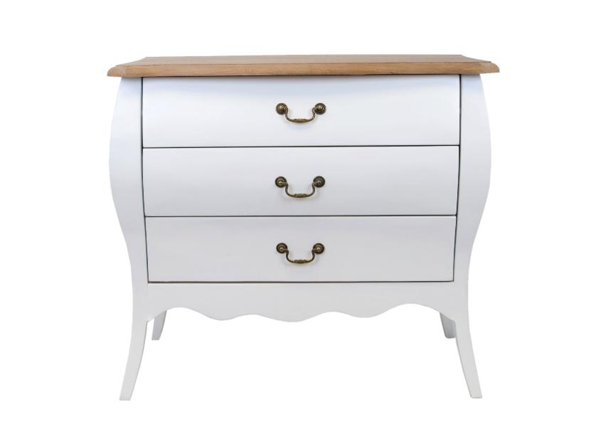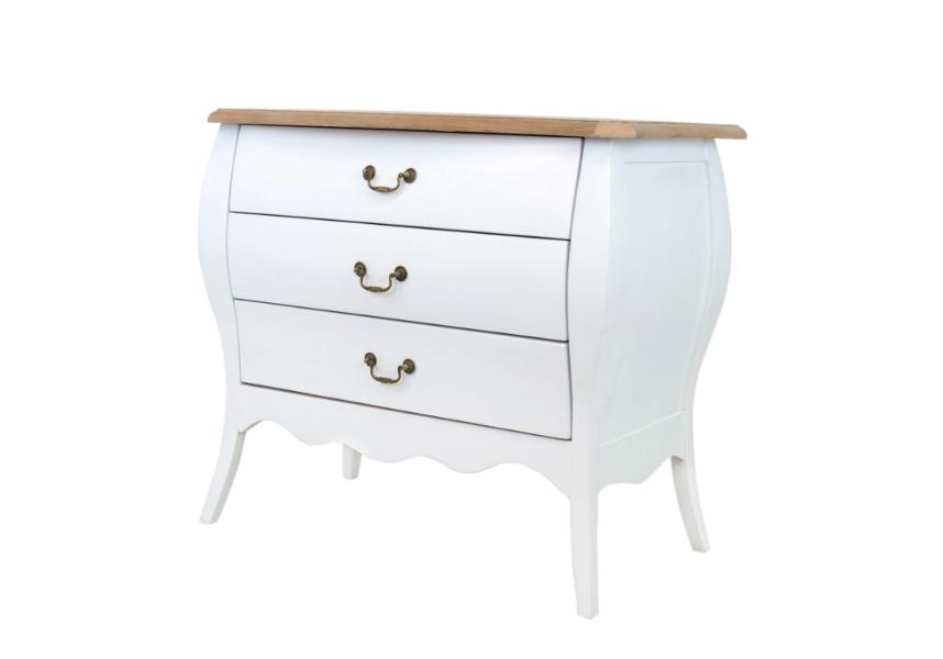 Белый комод Delvin из дуба исполнен в непринужденной манере французского прованса. Размеры комода — 90х49х80 см. Он оснащен тремя выдвижными вместительными ящиками. Нижняя часть комода имеет фигурные детали и изящно изогнутые небольшие ножки. Комод будет выгодно смотреться как в современном классическом стиле, так и в стиле кантри, стиле прованс.