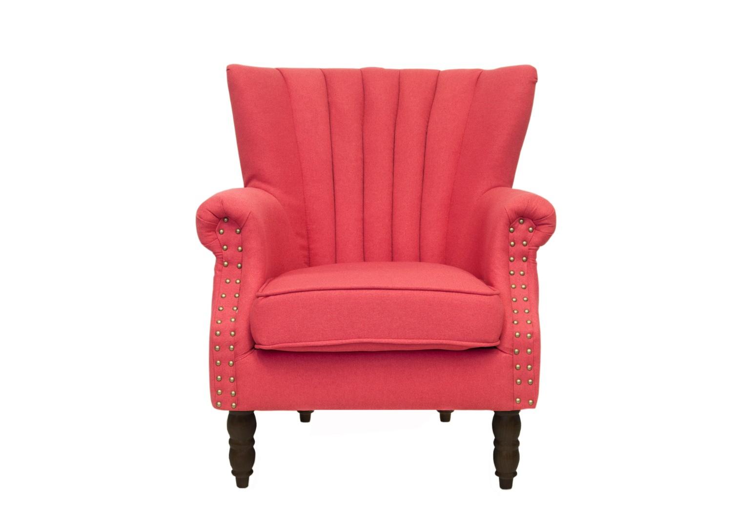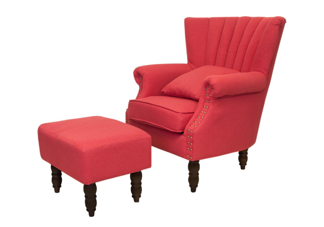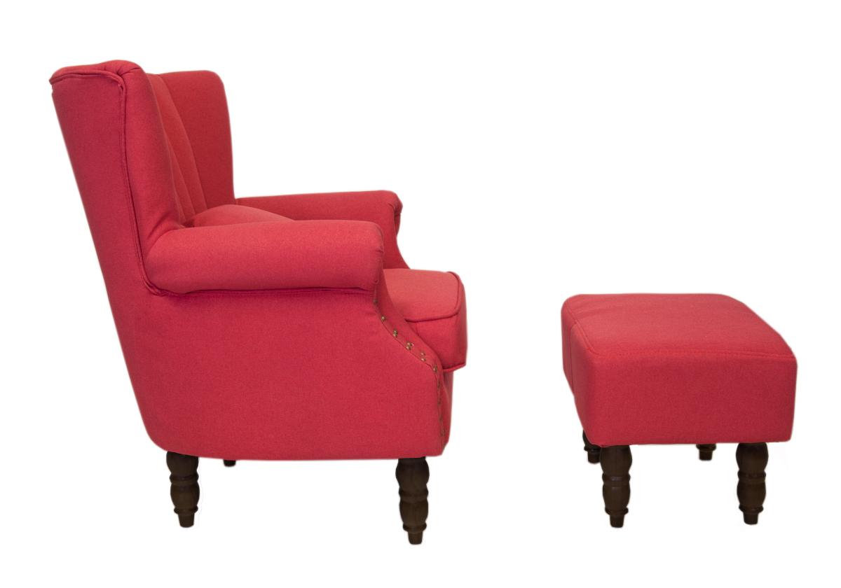 Кресло Lab красного цвета на резных ножках выполнено в оригинальном дизайне. Прочный каркас создан из дерева, в качестве обивки использована ткань из натурального льна. Высокая спинка с продольной объемной стежкой, широкое сиденье и мягкие подлокотники обеспечивают телу удобное положение, способствуют полному расслаблению при отдыхе. Модель поставляется в комплекте с дополнительной подушкой и пуфом, выполненном в том же стиле.
