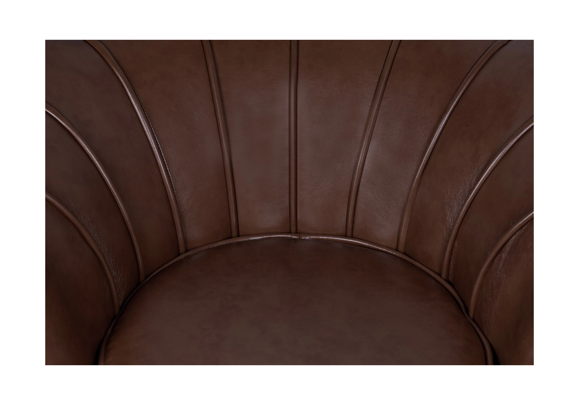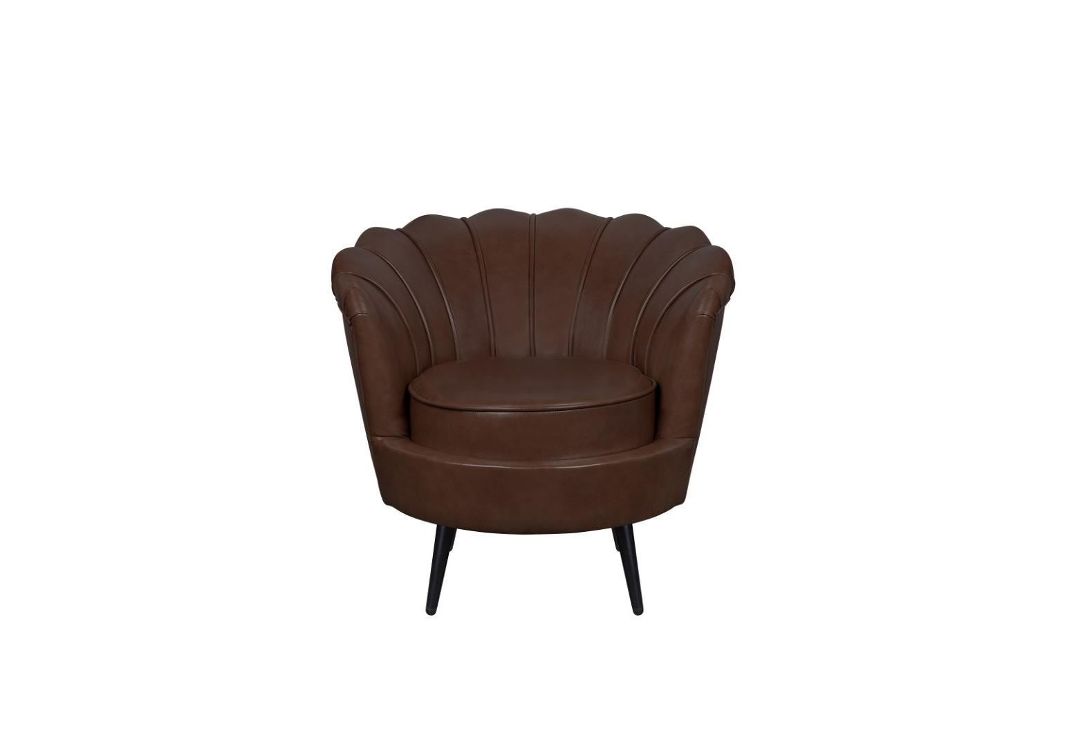 Дизайнерское кресло Pearl Grey V2 на основе каркаса из натурального дерева, с обивкой из искусственной кожи, декорированной продольными стежками на внутренней стороне спинки. Модель выполнена в темно-коричневом цвете; по форме напоминает створку раковины, огибающей жемчужину — круглую подушку для сидения. Короткие металлические ножки черного цвета расходятся в виде лучей под небольшим наклоном к основанию. Мебель роскошно выглядит и подходит для оформления элитных интерьеров.