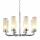 Модель содержит 8 цоколей, ориентированных вверх и рассчитанных на подключение лампочек мощностью 25 Вт. Матовые плафоны выполнены в виде узких высоких цилиндров и декорированы по краям серебряной окантовкой.