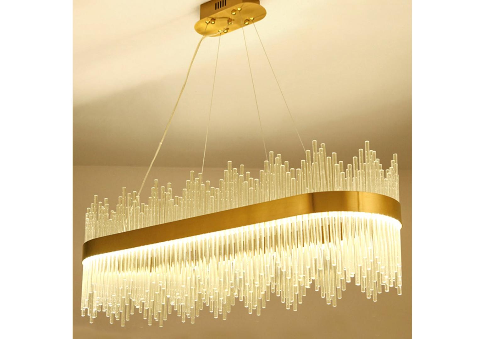 Подвесная люстра Stripglass на металлической арматуре цвета латунь. Плафон состоит из множества стеклянных цилиндрический полосок, которые прекрастно рассеивают свет от вмонтированной внутрь корпуса светодиодной ленты.