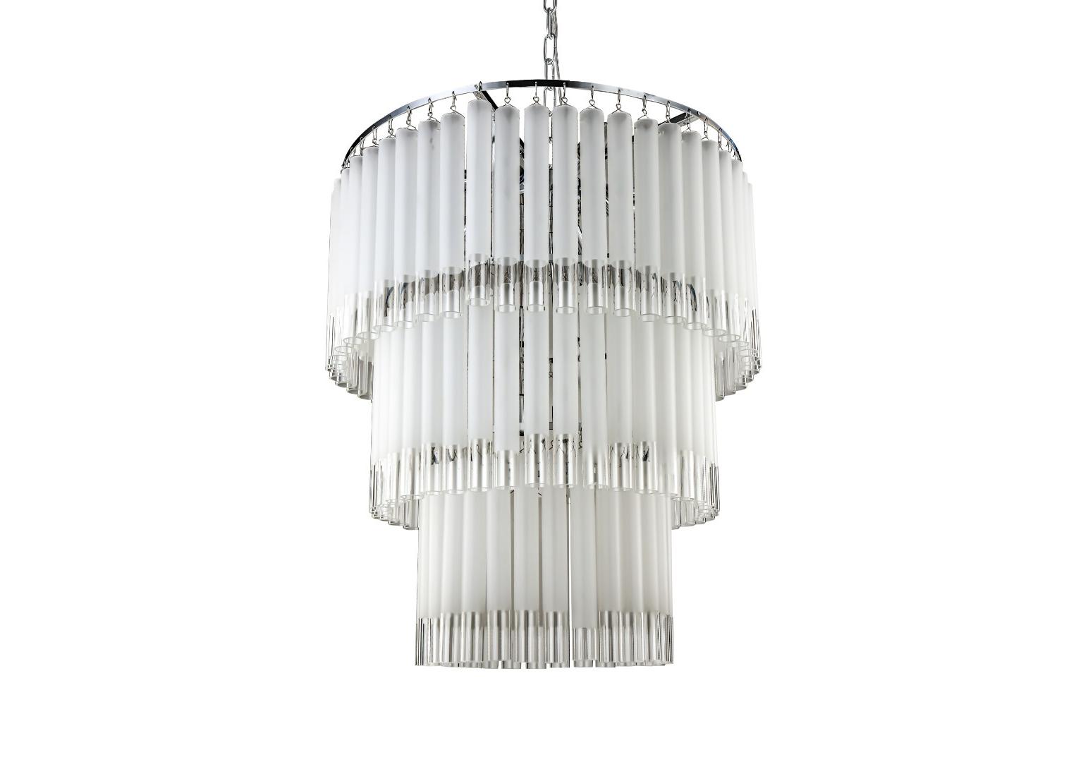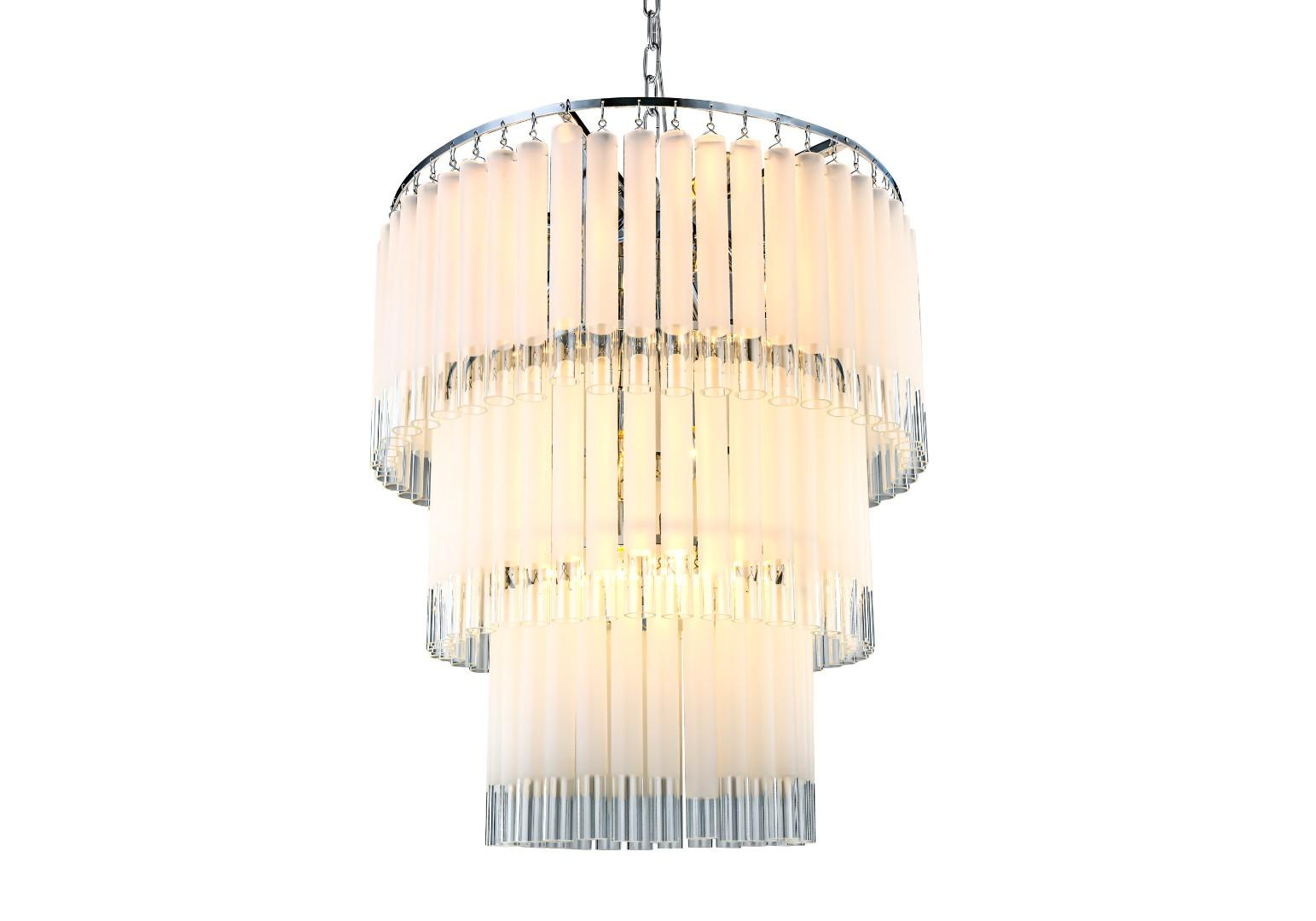 Трехъярусная люстра Tyrell на основе металлического каркаса цвета «хром», состоящего из системы колец разного диаметра, расположенных на разных уровнях. На кольцах удерживаются длинные узкие пластины из матового стекла, которые закрывают лампочки и создают преграду для света, частично рассеивают и приглушают его, делают более комфортным для человека.