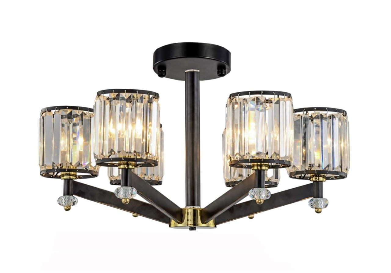 Светильник Garlem с креплением на потолочную планку круглой формы. Прочный каркас выполнен из черненного металла, на шести рожках, лучами отходящих из одного центра, установлены лампы. Плафоны с гранеными поверхностями выполнены из полупрозрачного стекла, способного мягко рассеивать свет и создавать в помещении уютную атмосферу. Модель дополнительно украшена стеклянными и металлическими «под золото» элементами декора.