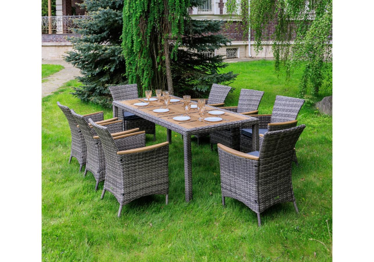 Включает в себя восемь кресел из искусственного ротанга на стальном каркасе и прочный стол.