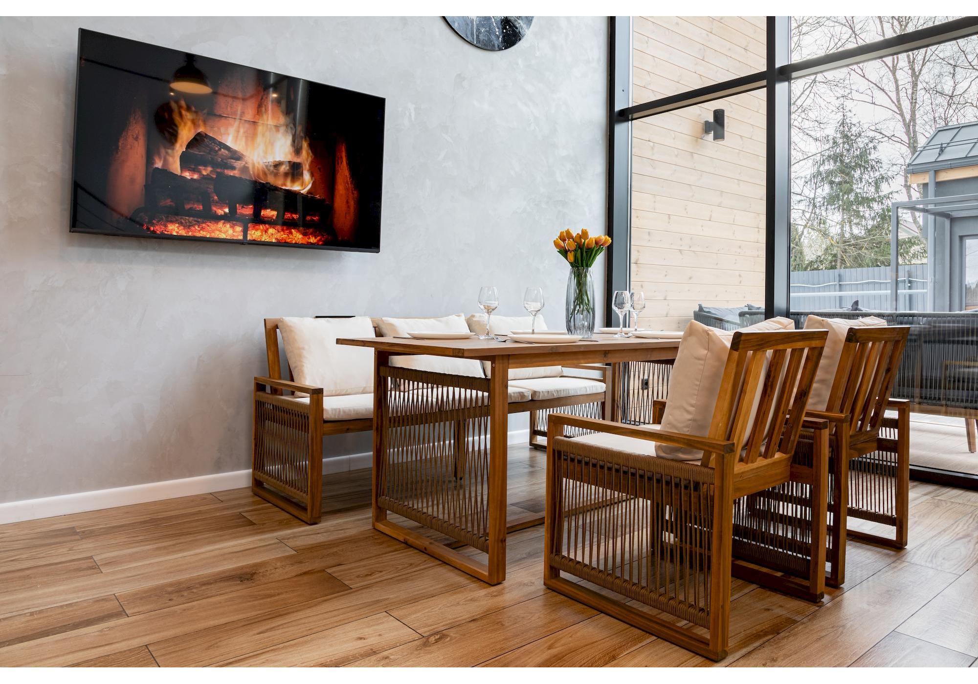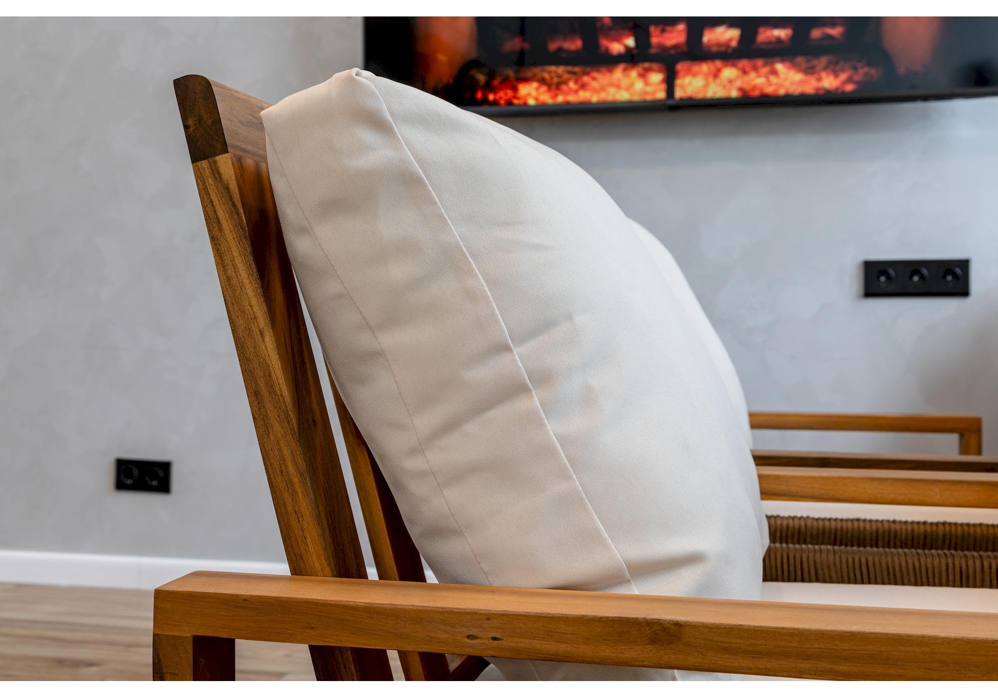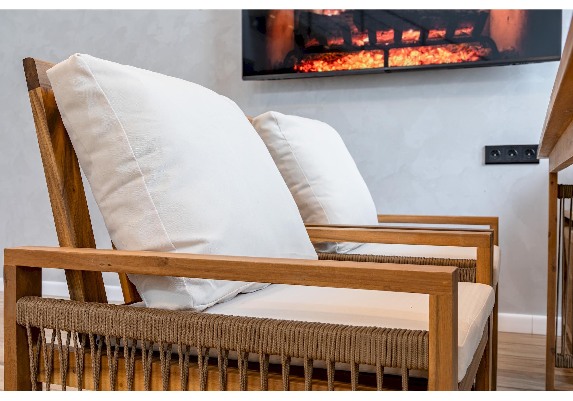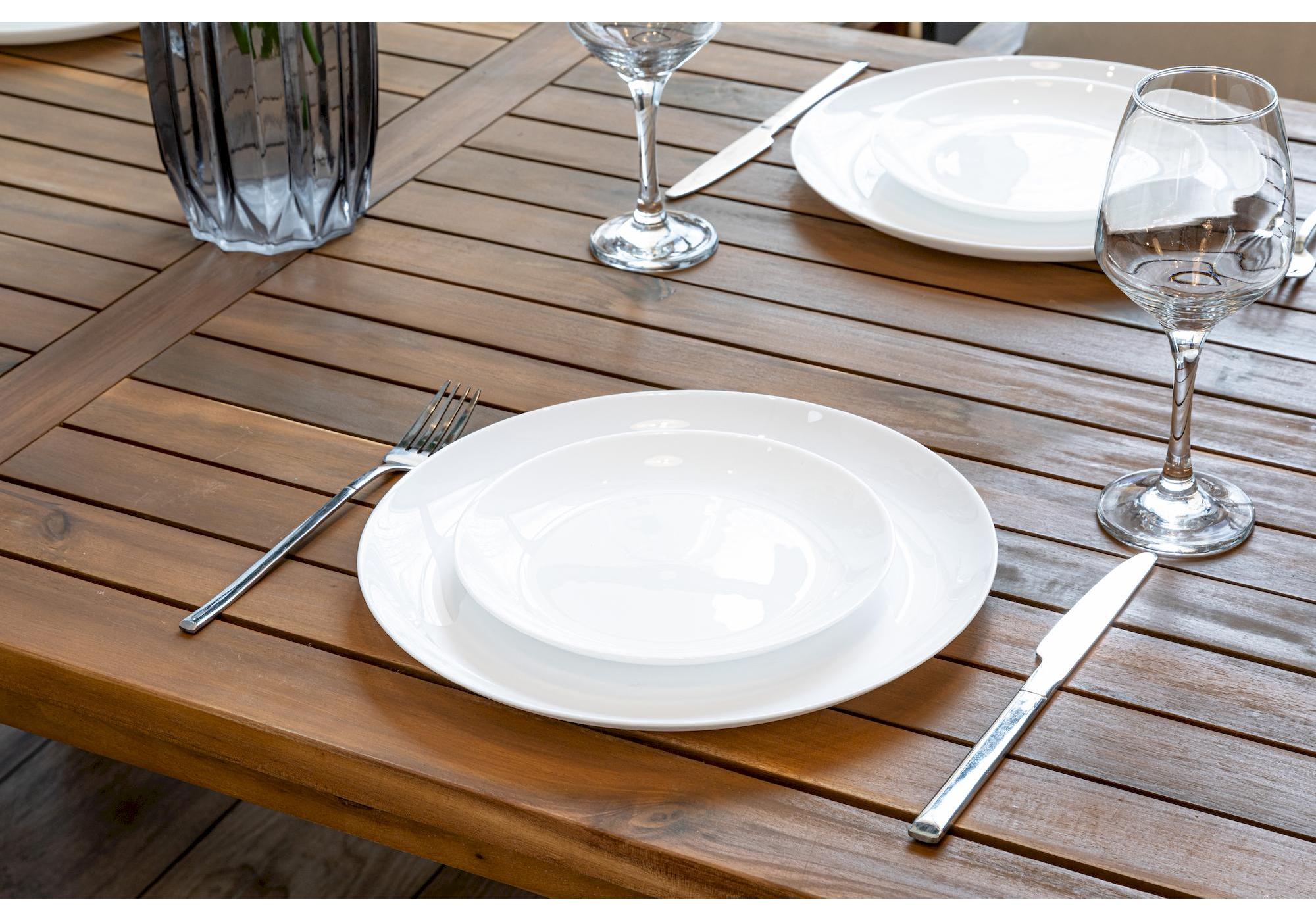 Комплект выполнен из обработанной под тик акации. Этот материал не только отличается премиальным внешним видом, но и обладает надежной защитой от влаги.