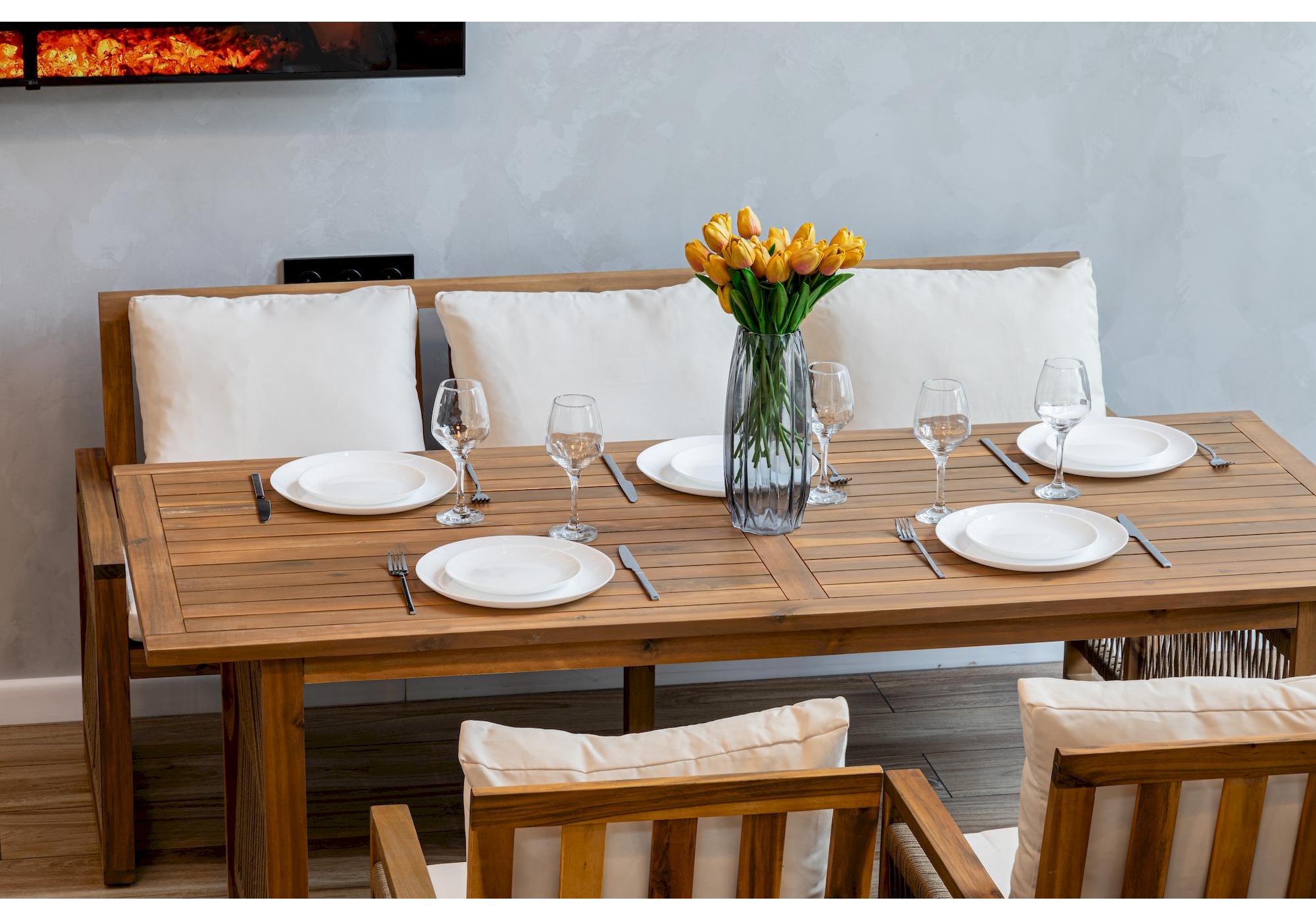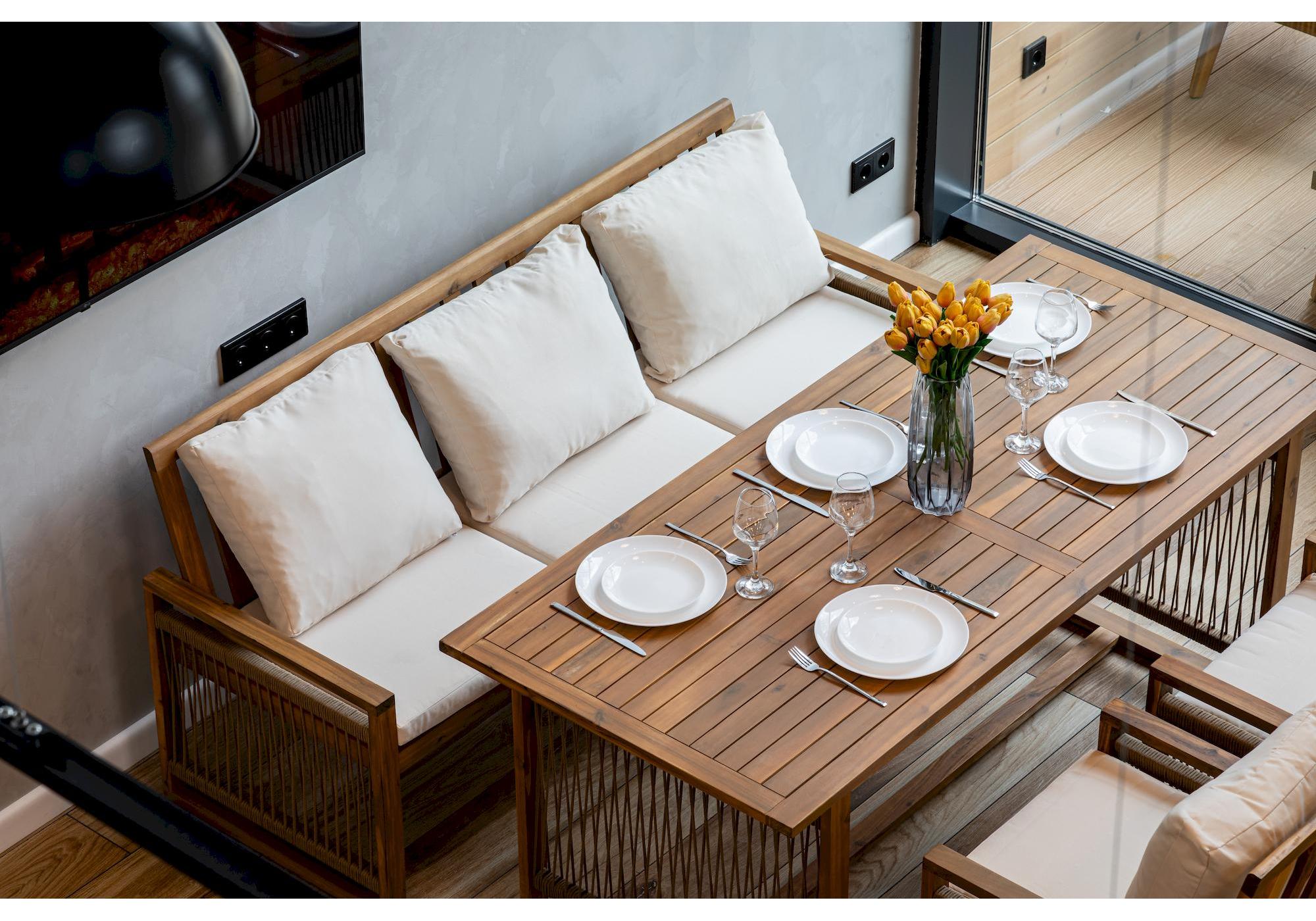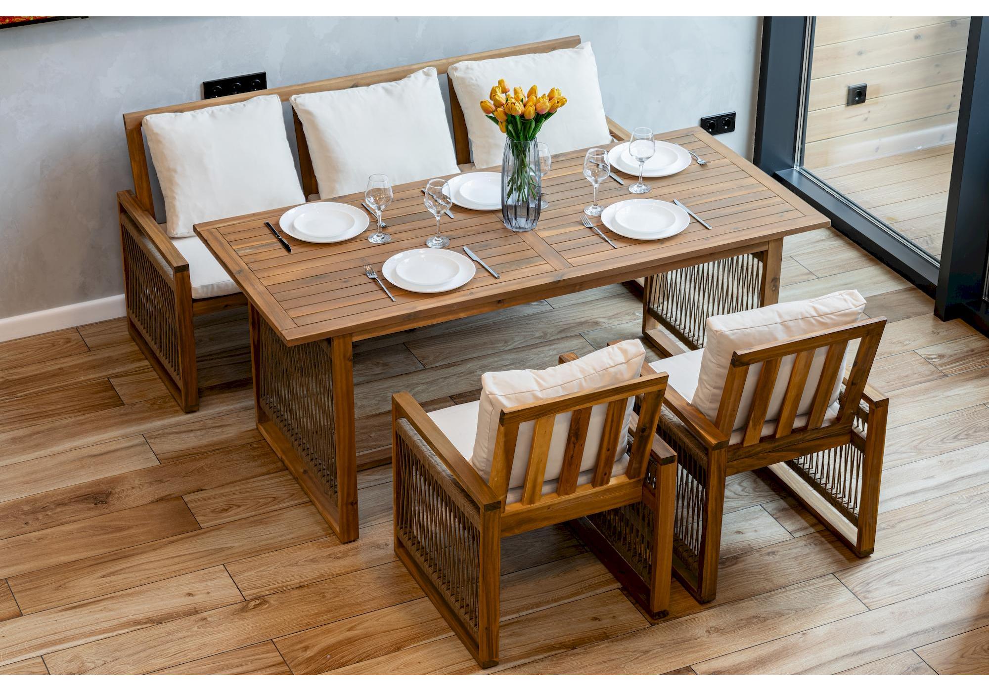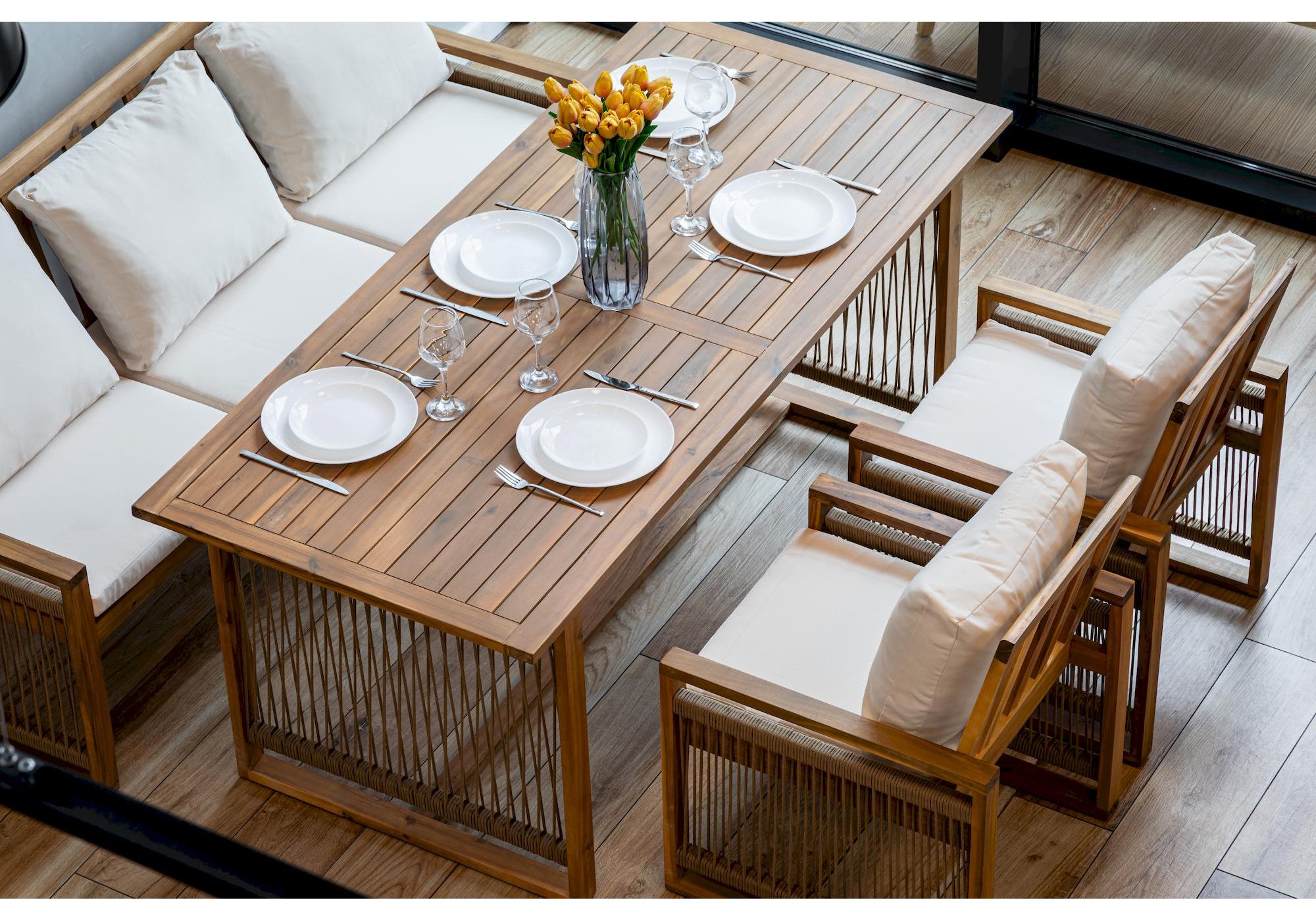 Обеденный комплект из акации GRAND MICHELLE с диваном в бежевом цвете представляет собой идеальное решение для создания уютной обеденной зоны на открытом воздухе.