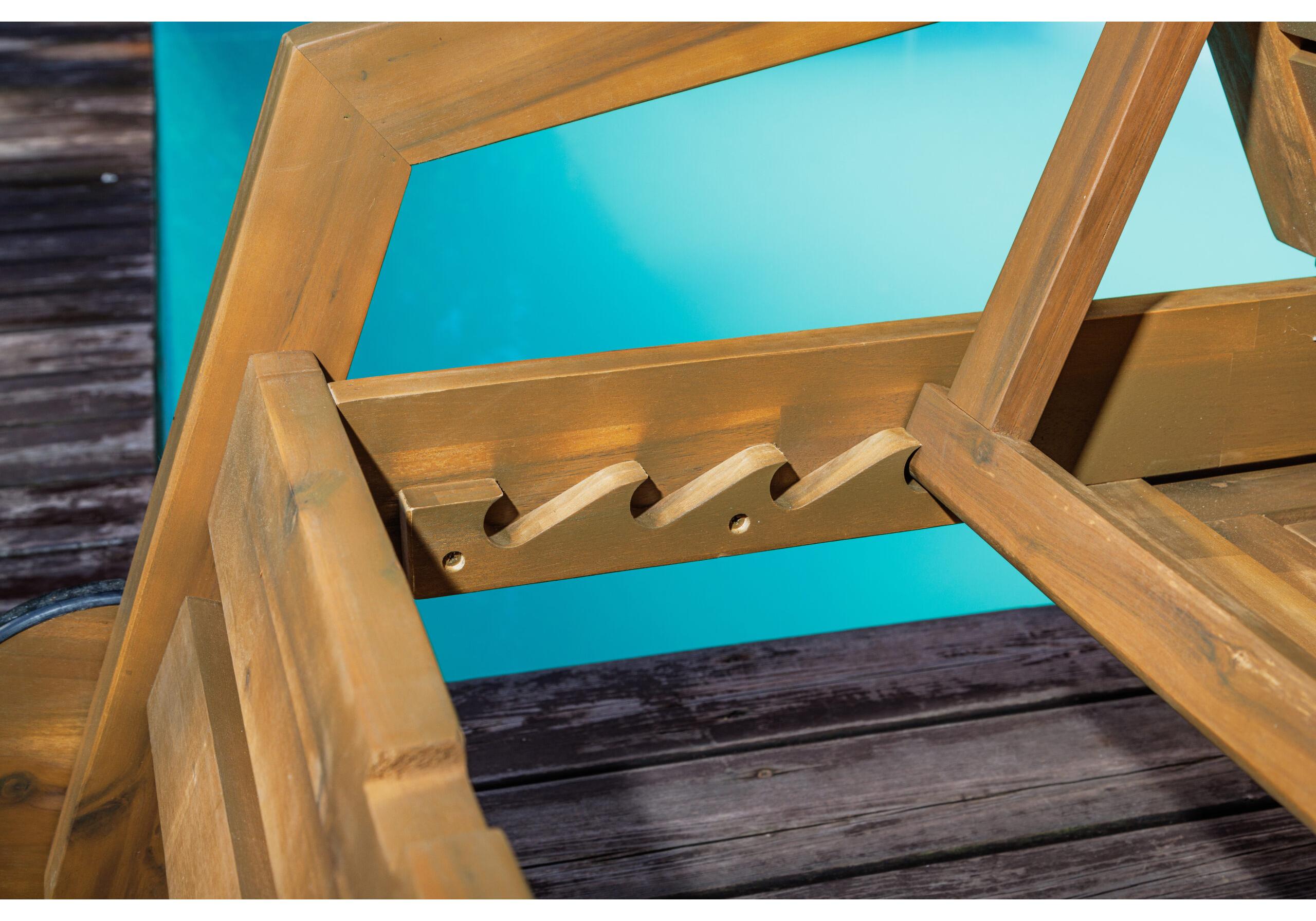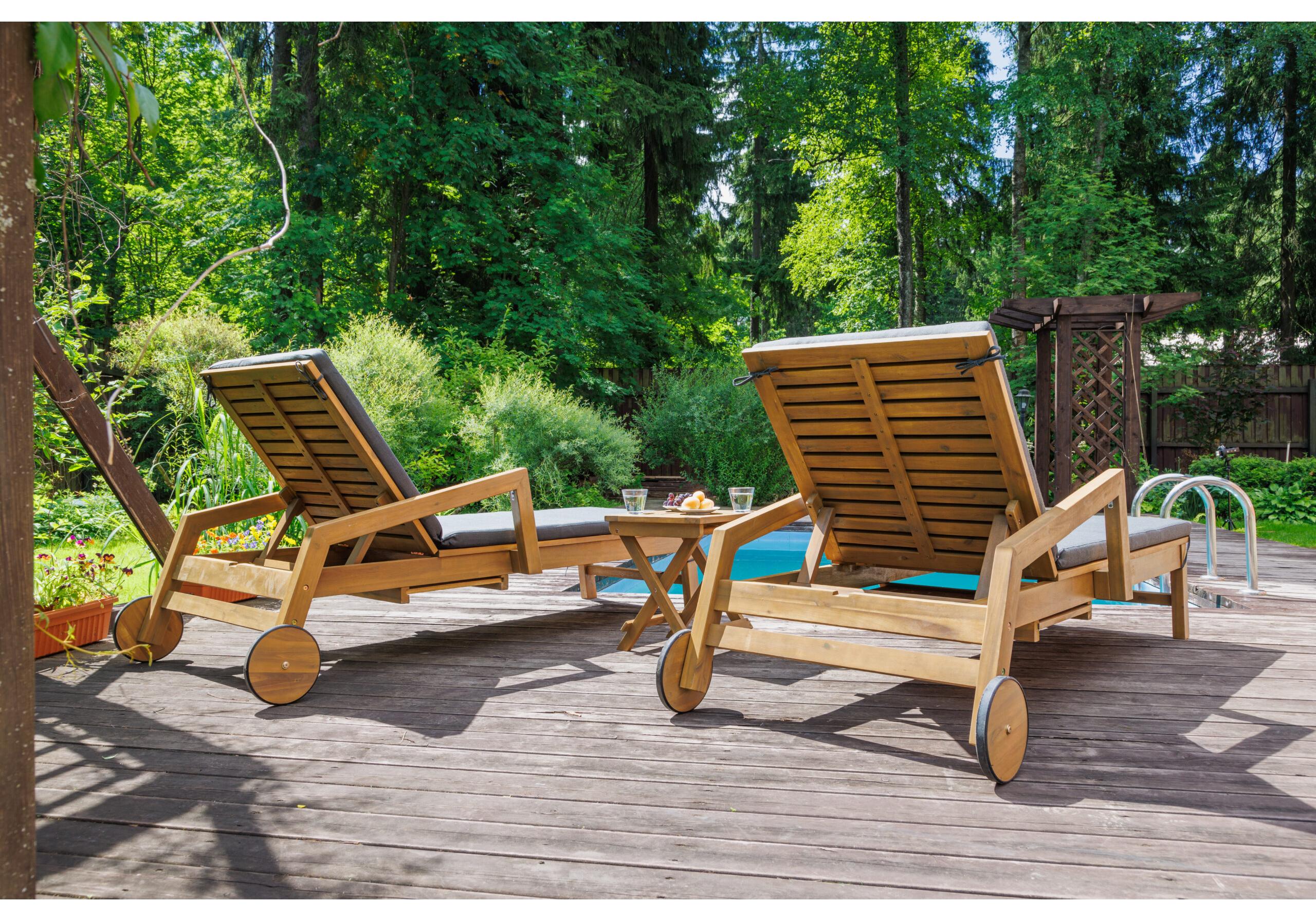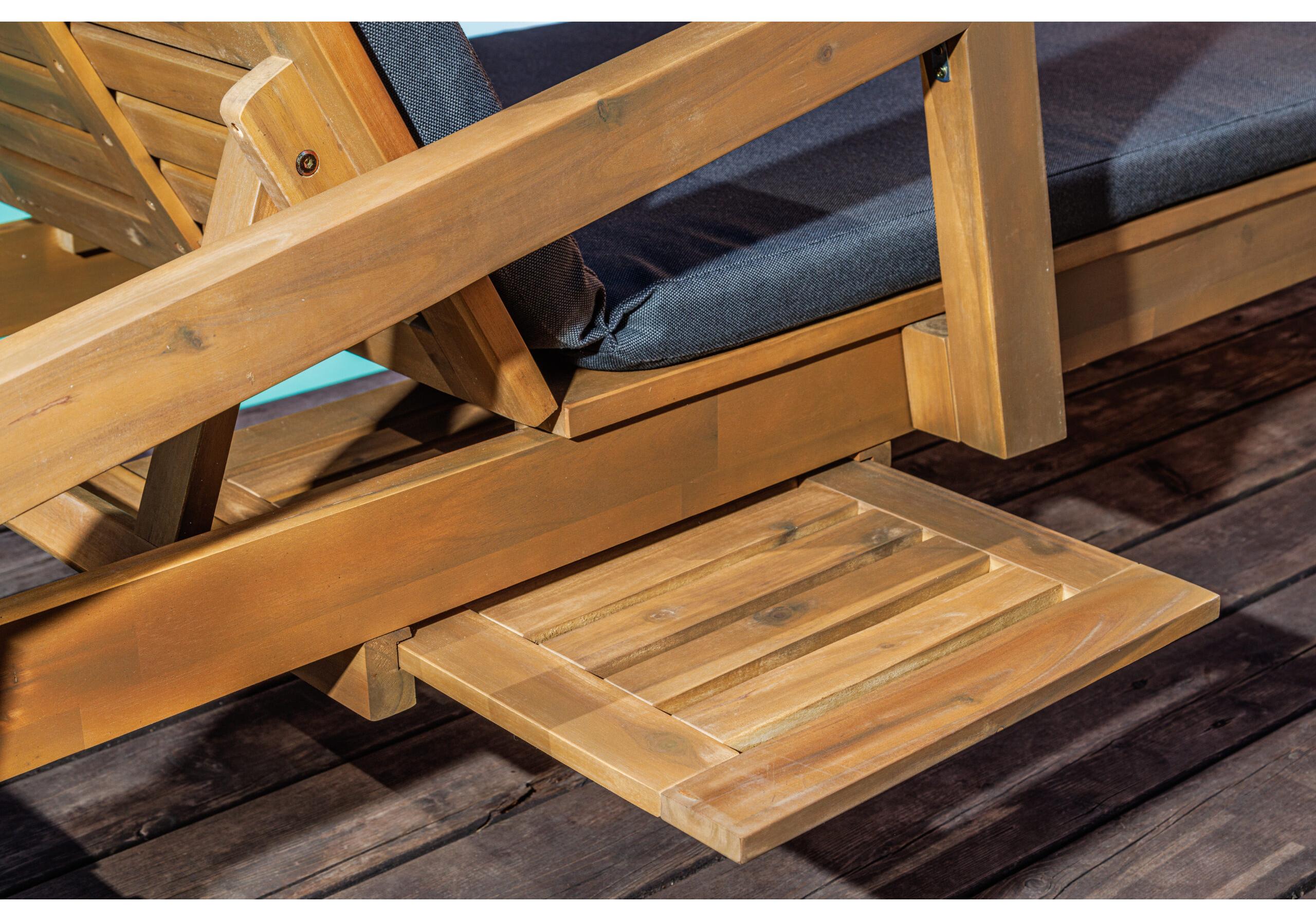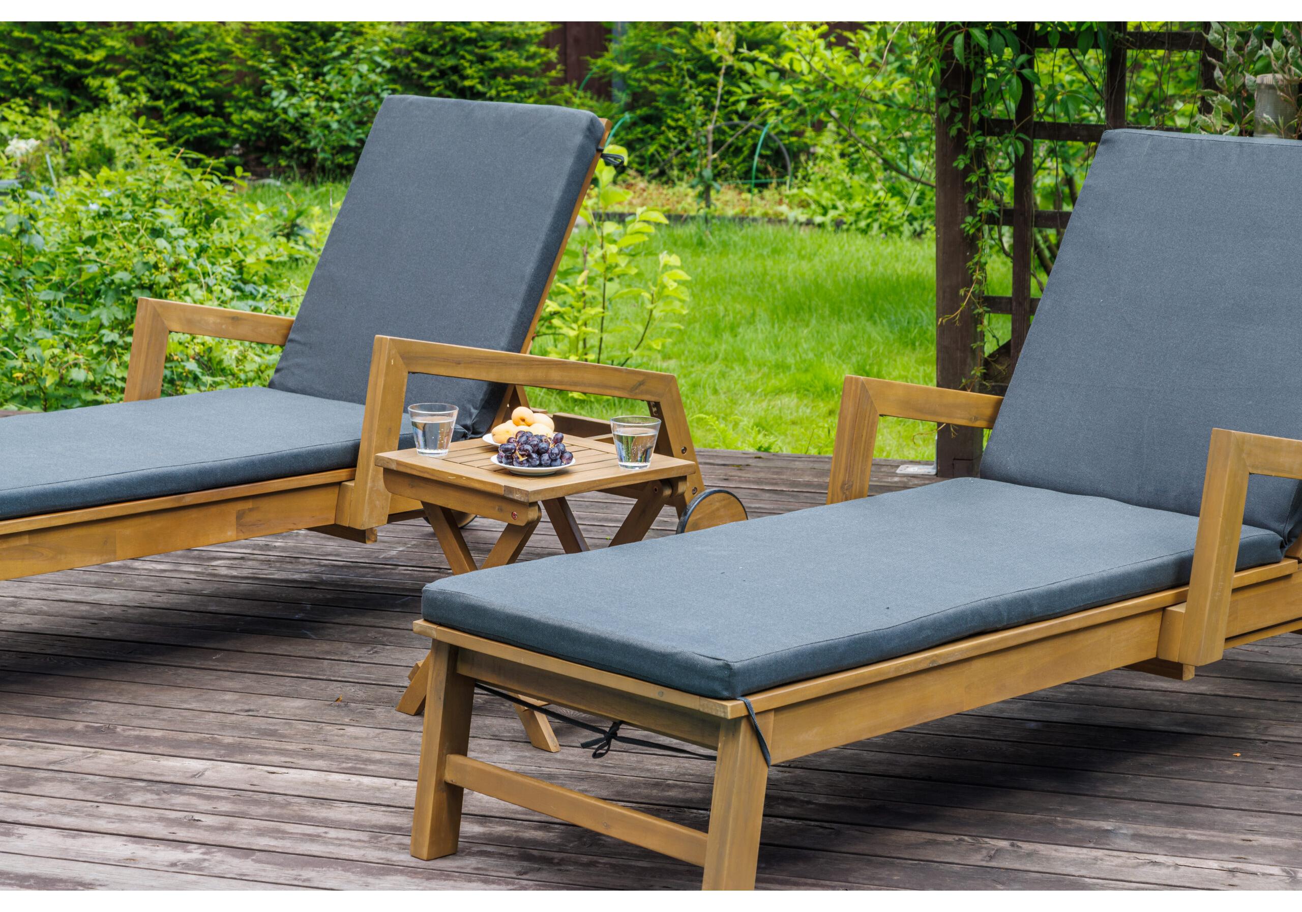 Шезлонги и столик выполнены из натурального дерева акации (teaklook), что придает комплекту единство стиля и практичности. Но и это еще не все плюсы нашего комплекта!