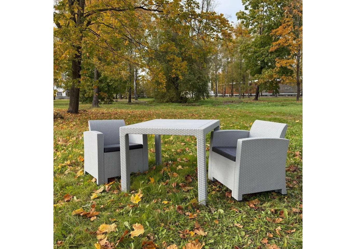 Создайте атмосферу уюта и гармонии с этим изысканным комплектом мебели, включающим квадратный обеденный стол 95х95х75 см и два удобных кресла 68х66х76 см. Выполненный из высокопрочного пластика светло-серого цвета, он сочетает в себе прочность, устойчивость к воздействию влаги и солнечному выгоранию.