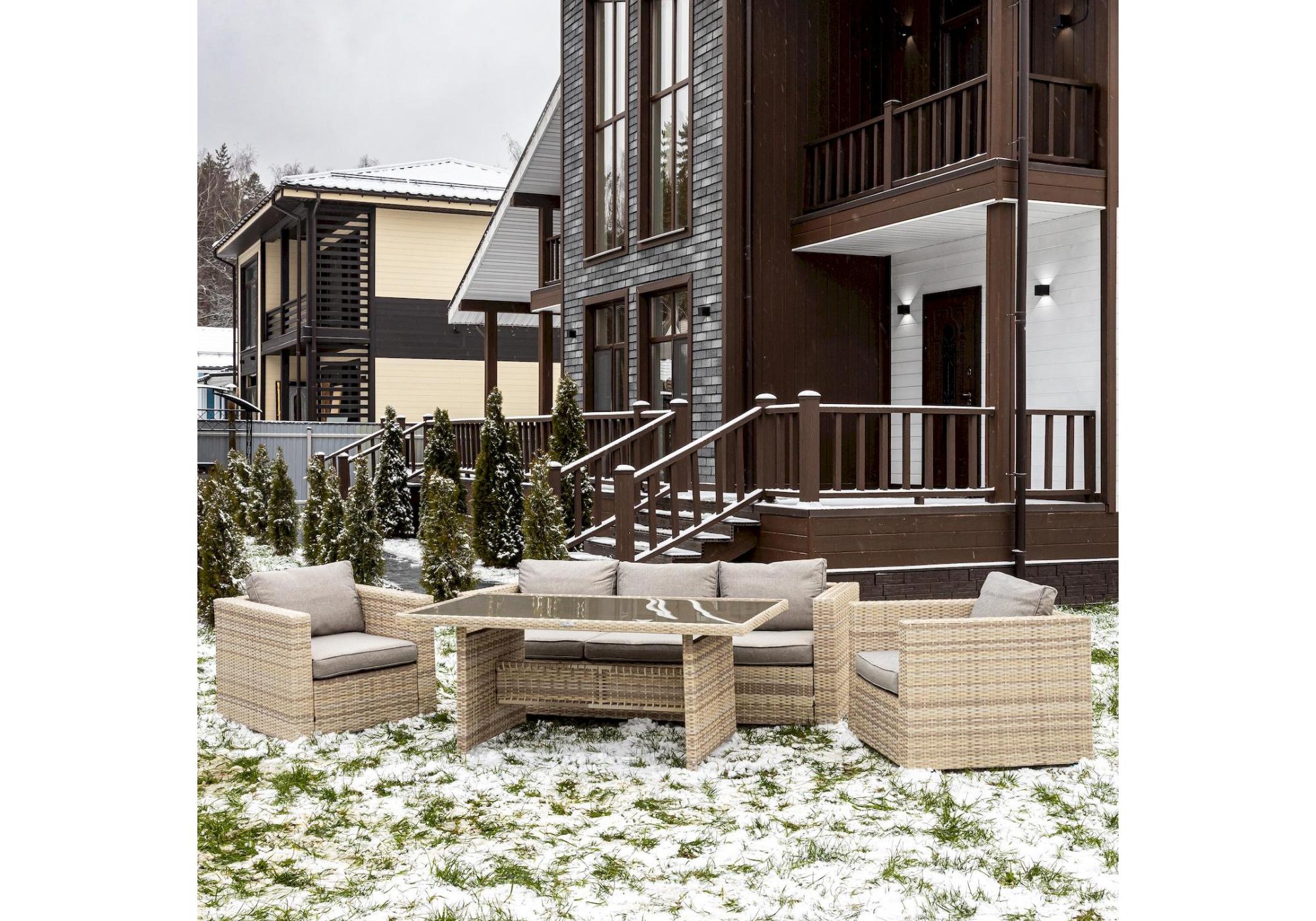 Все элементы мебели изготовлены из качественных материалов: металлокаркас и искусственный ротанг. Ротанг - это прочный и легкий материал, который не требует особого ухода и отлично переносит воздействие внешней среды. Металлокаркас обеспечивает прочность и стабильность всего конструкта.