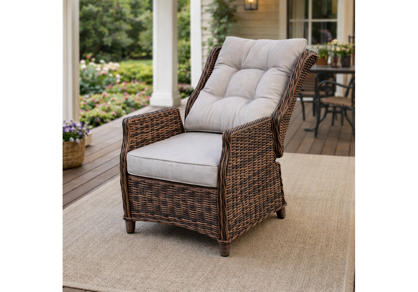 3. Ручное плетение из ротанга (сфера) - благородство коричневого Коричневый ротанг с текстурой «сфера» создаёт эффект объёмного, живого полотна. Это не просто плетение - это ручная работа, которая придаёт креслу характер. Материал не выцветает, не расслаивается, не боится дождя и снега. Он просто остаётся красивым всегда.