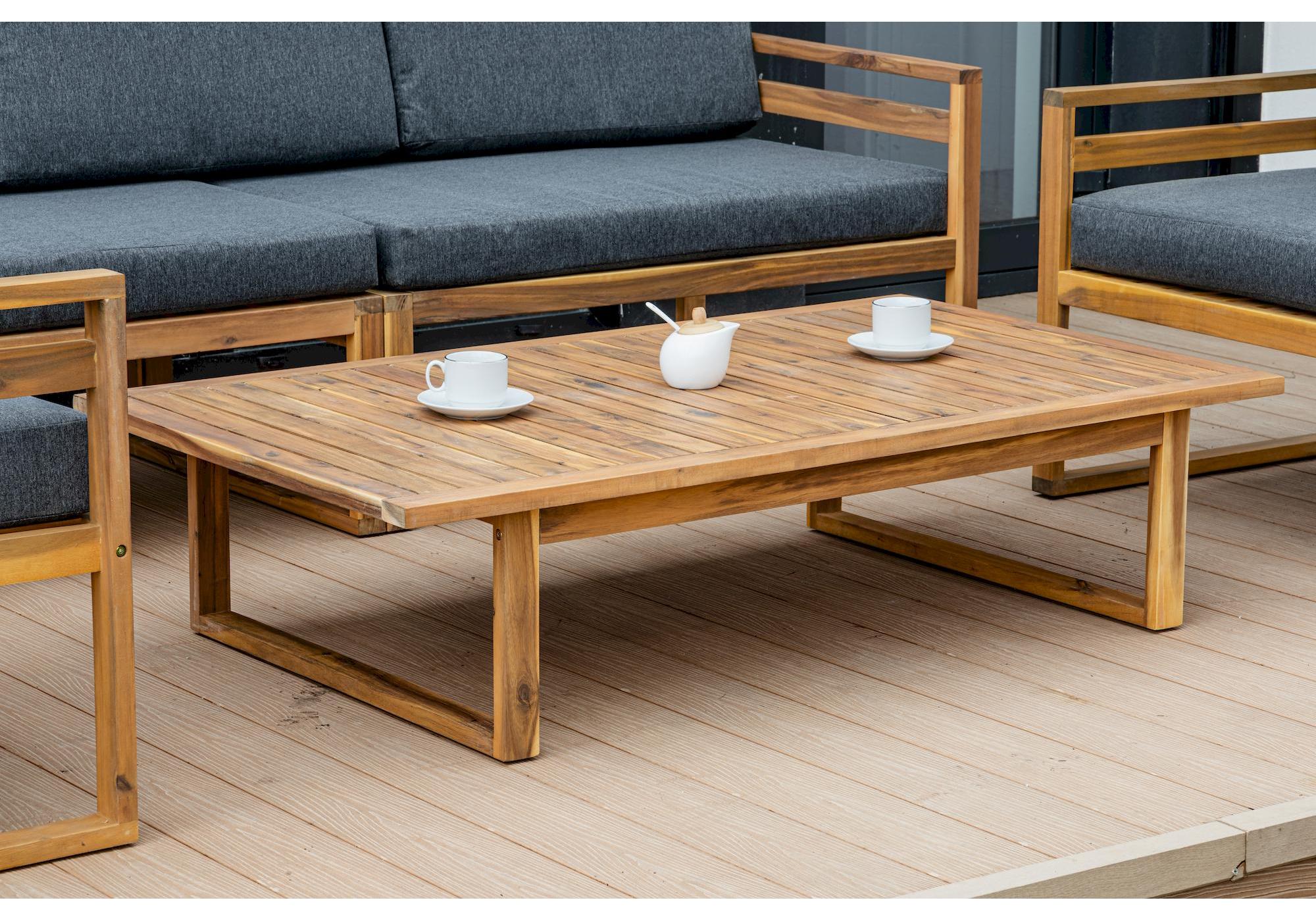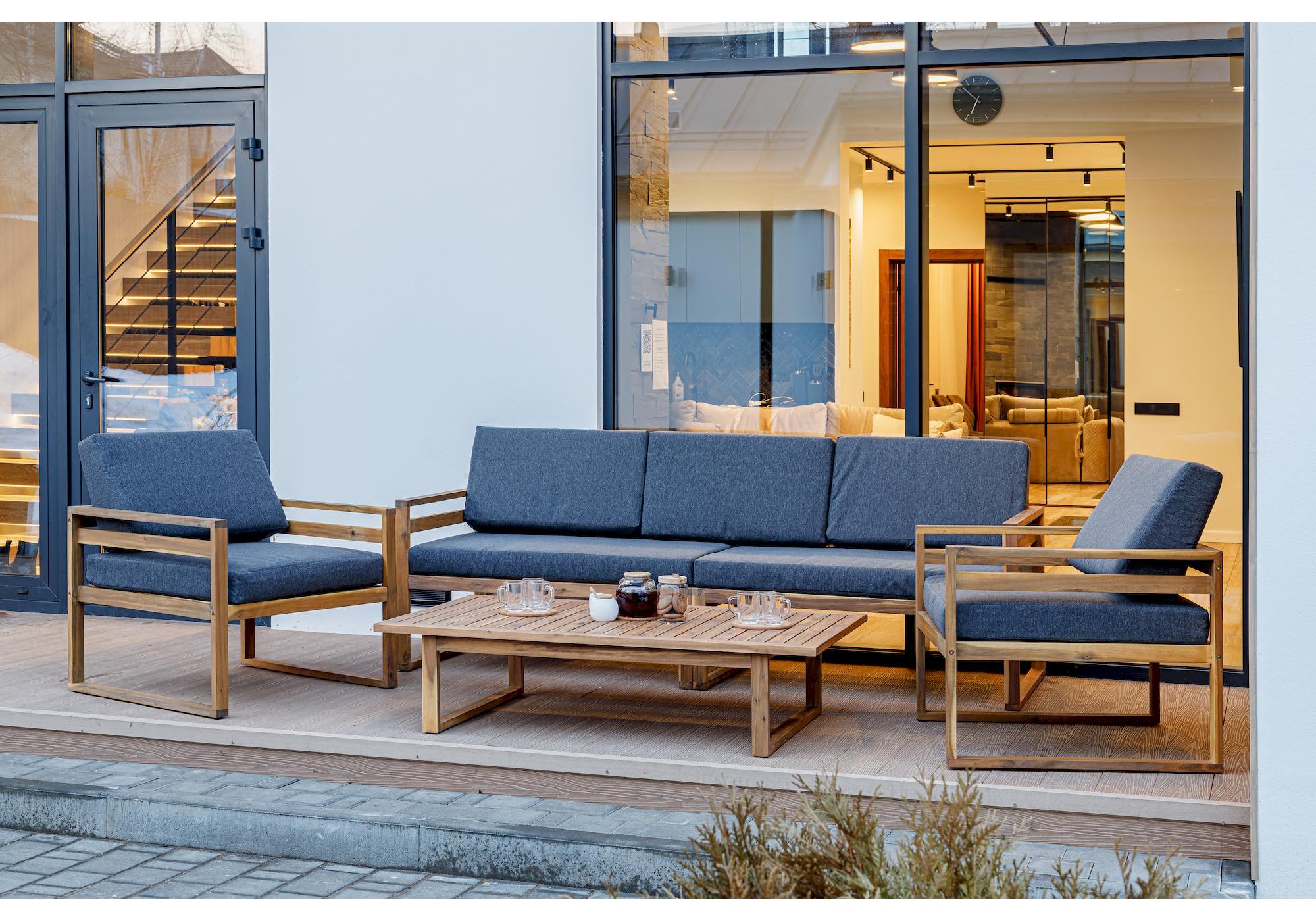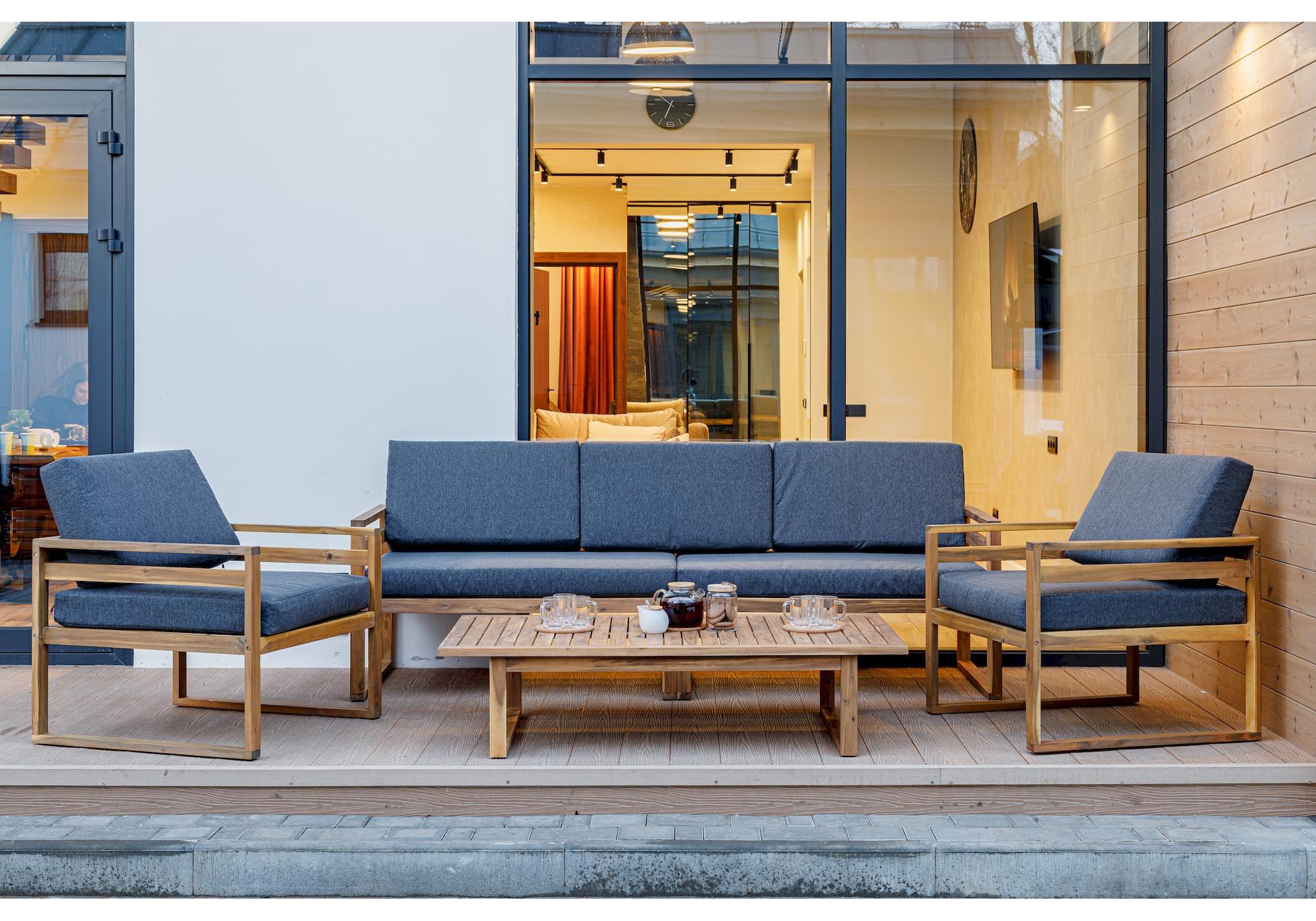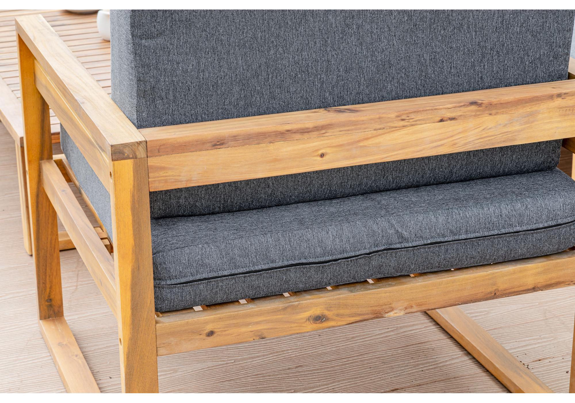 Комплект выполнен из прочной и красивой акации, что делает его идеальным выбором для любого экстерьера. Каркас и столешница изготовлены из того же материала, обеспечивая единство стиля.