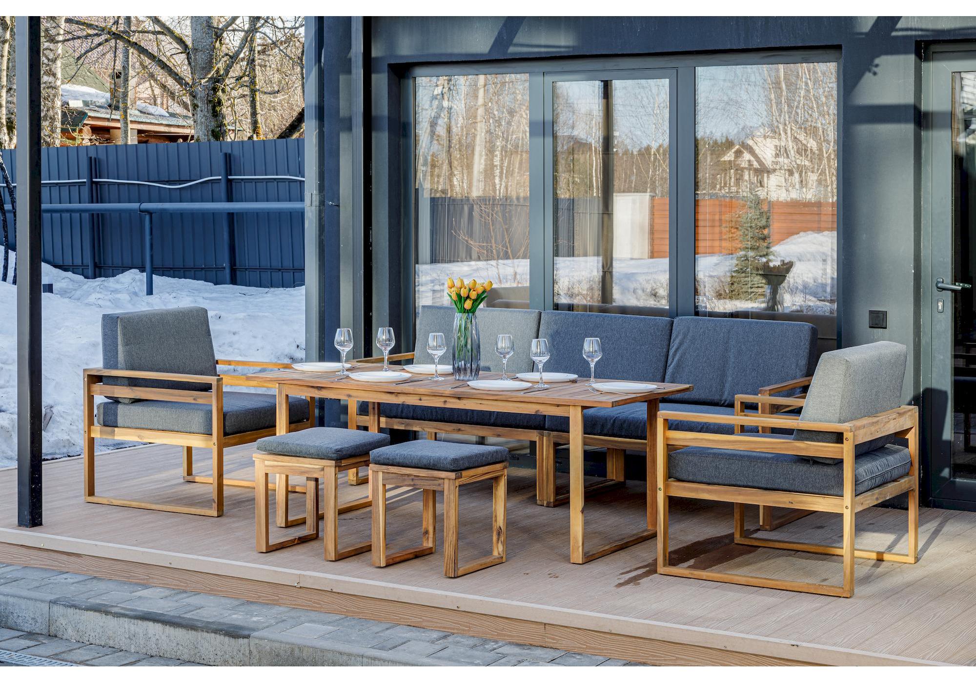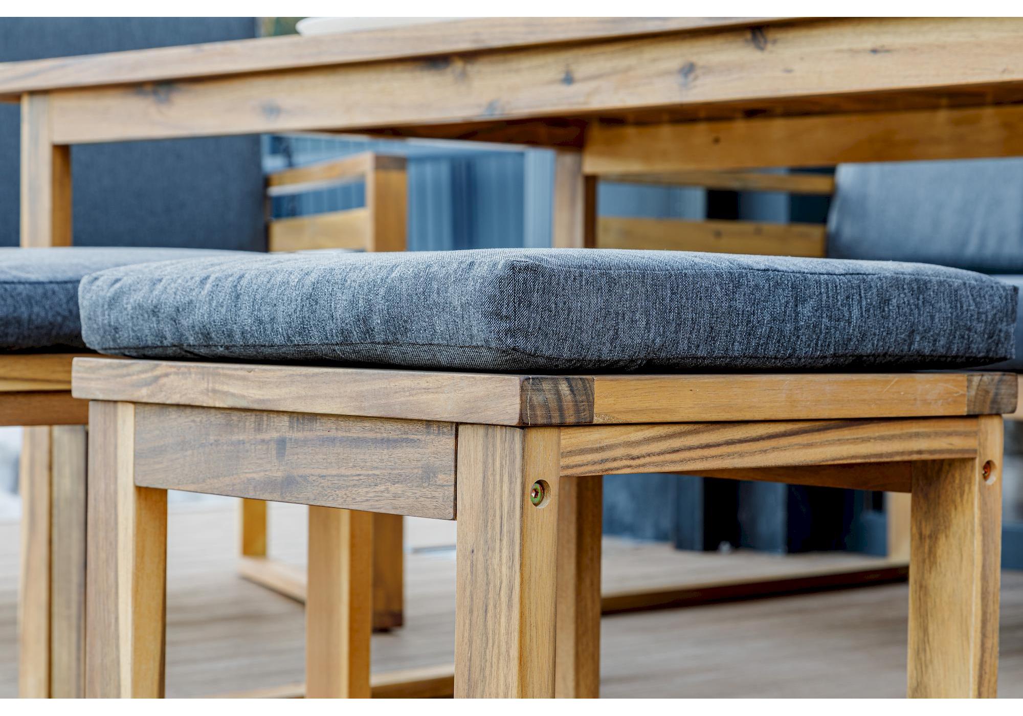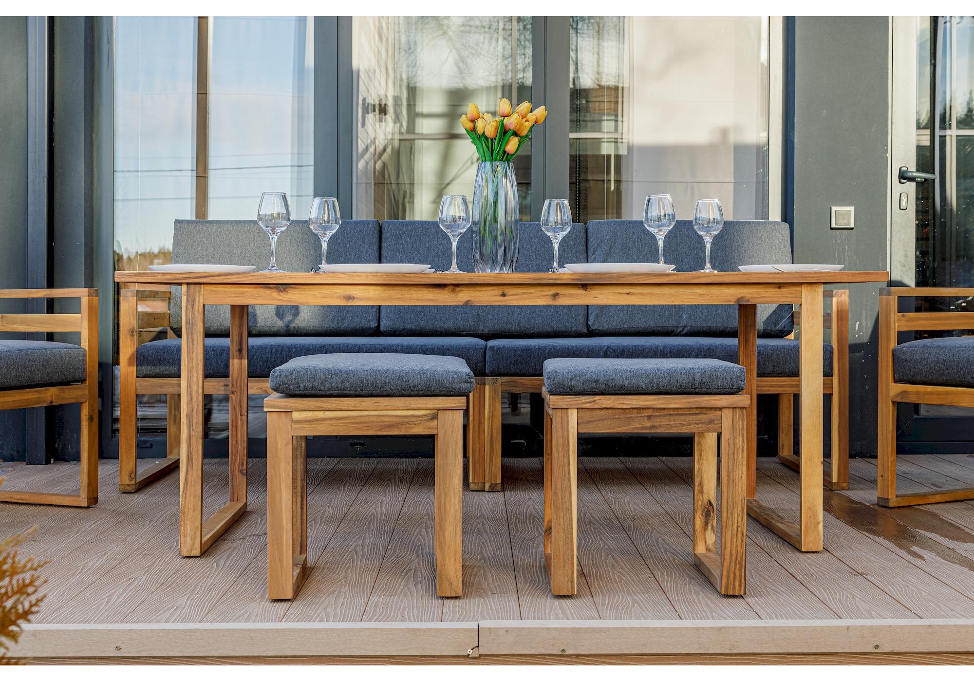 Представляем вам обеденный комплект BROOKLYN с уютным диваном, выполненный из прочной и красивой акации. Каркас и столешница изготовлены из того же материала, обеспечивая единый стиль и прочность.