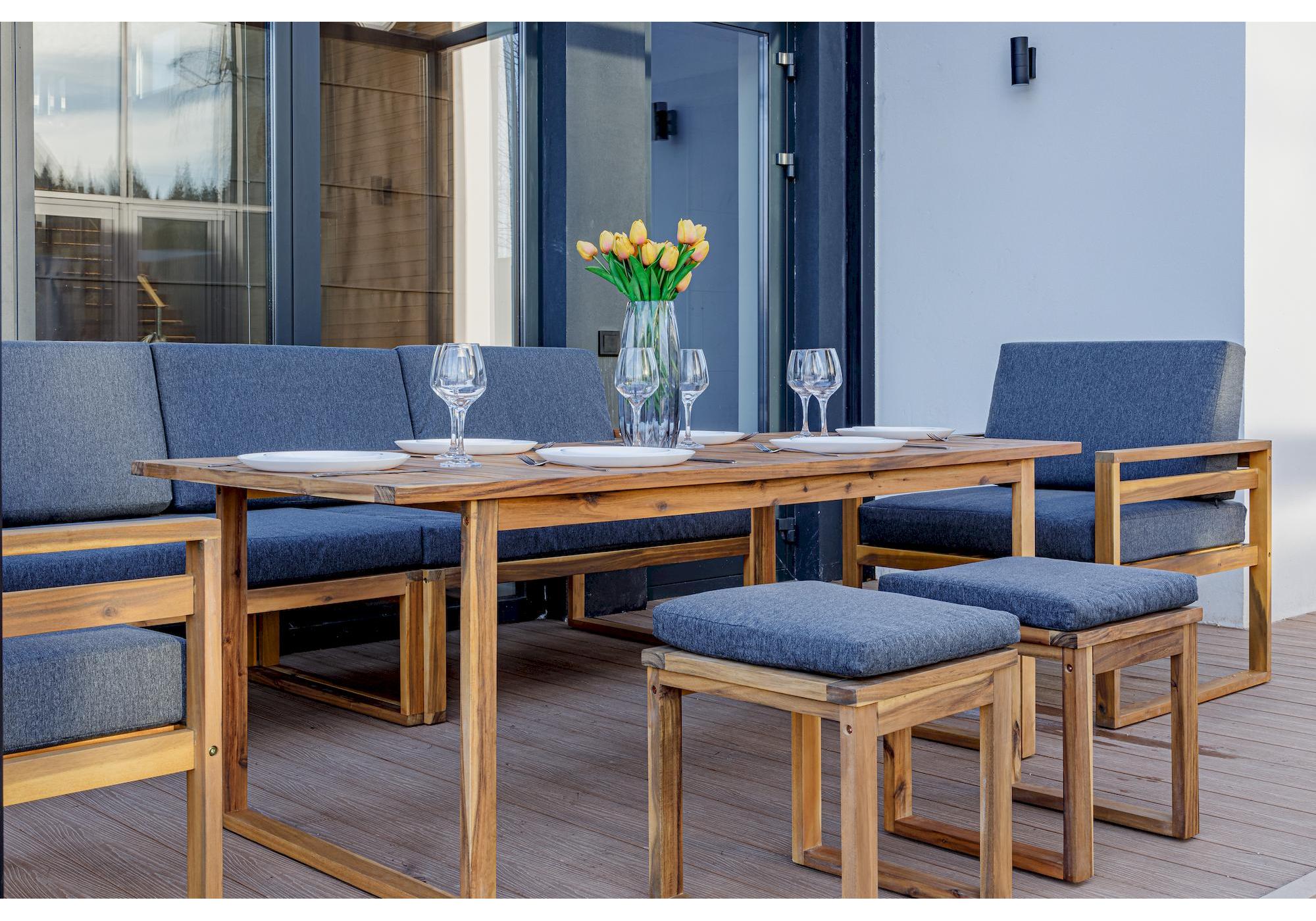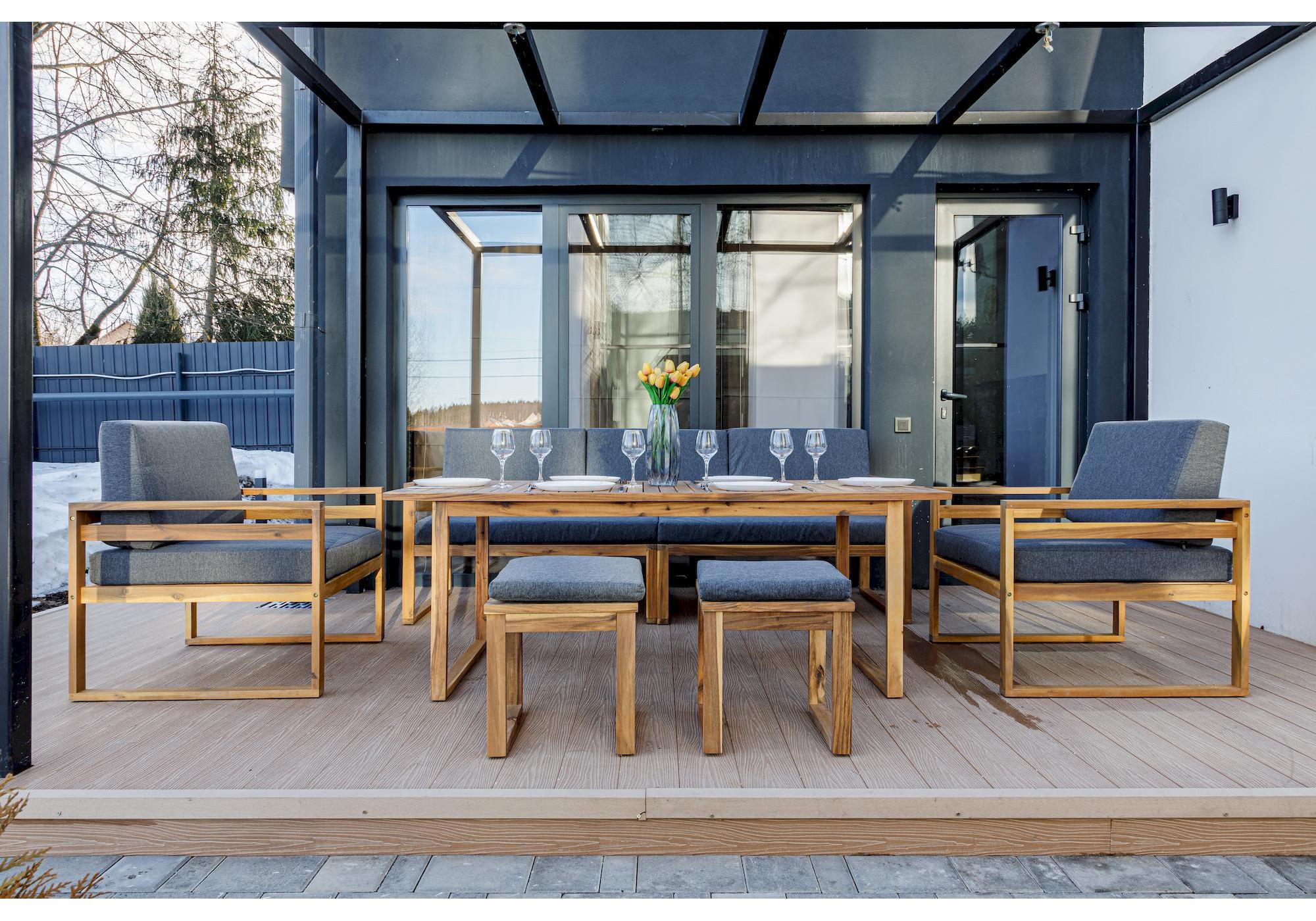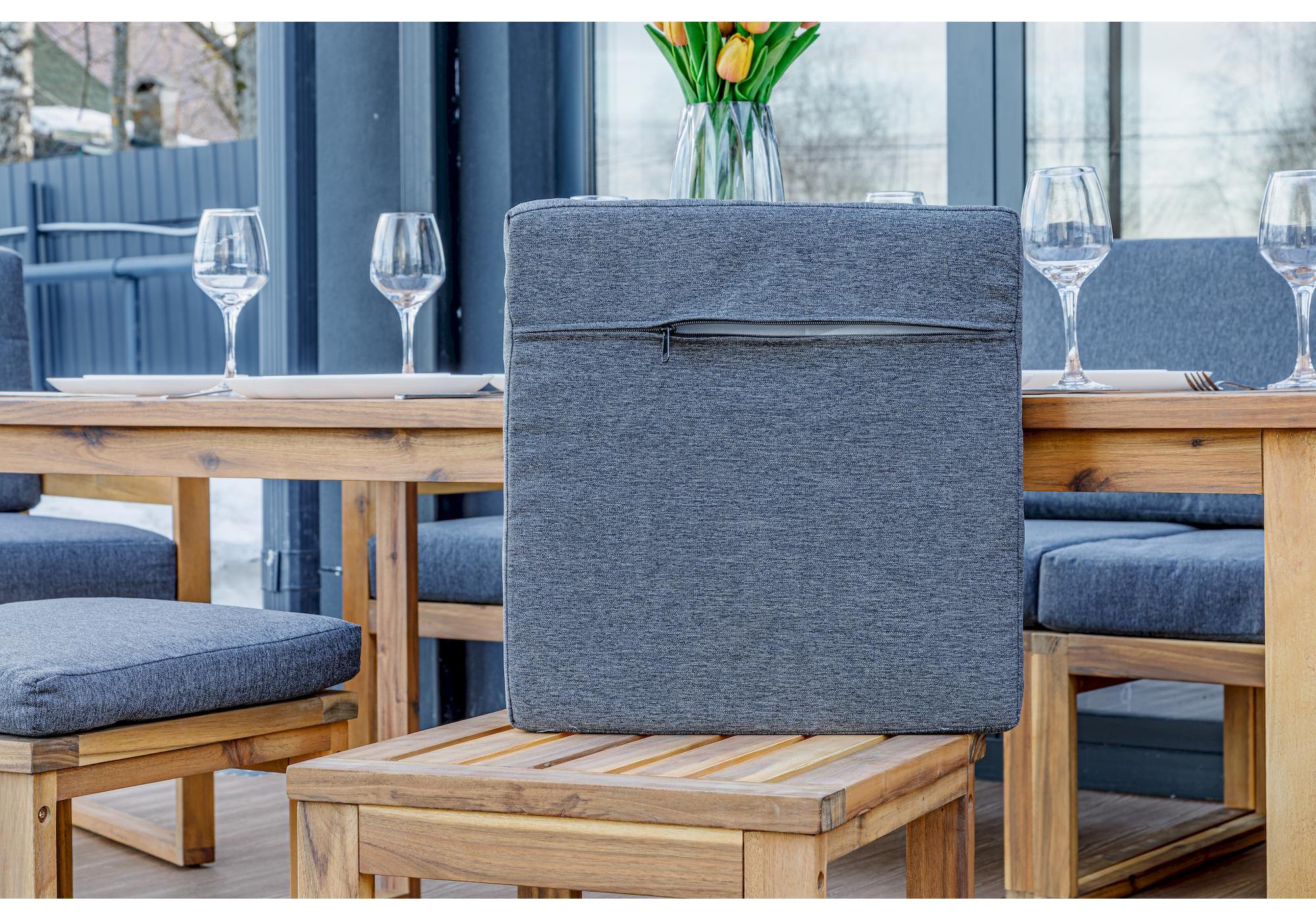 Представляем вам обеденный комплект BROOKLYN с уютным диваном, выполненный из прочной и красивой акации. Каркас и столешница изготовлены из того же материала, обеспечивая единый стиль и прочность.