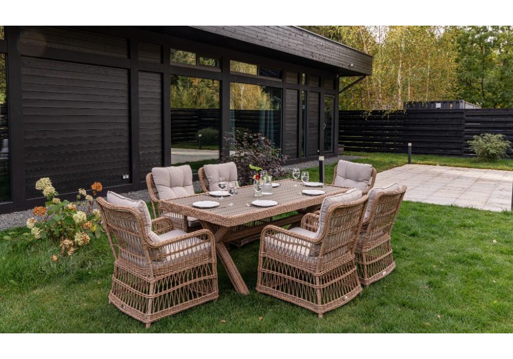 Комплект садовой мебели Isabella станет удачным решением для обустройства придомовой террасы или летней беседки, а также просторной гостиной комнаты или столовой. Его габаритов вполне достаточно не только для ежедневных семейных трапез, но и праздничных застолий с самыми близкими друзьями. Обеденный гарнитур выполнен в легком традиционном дизайне с использованием естественных оттенков, что позволяет ему гармонично вписываться любое окружение.