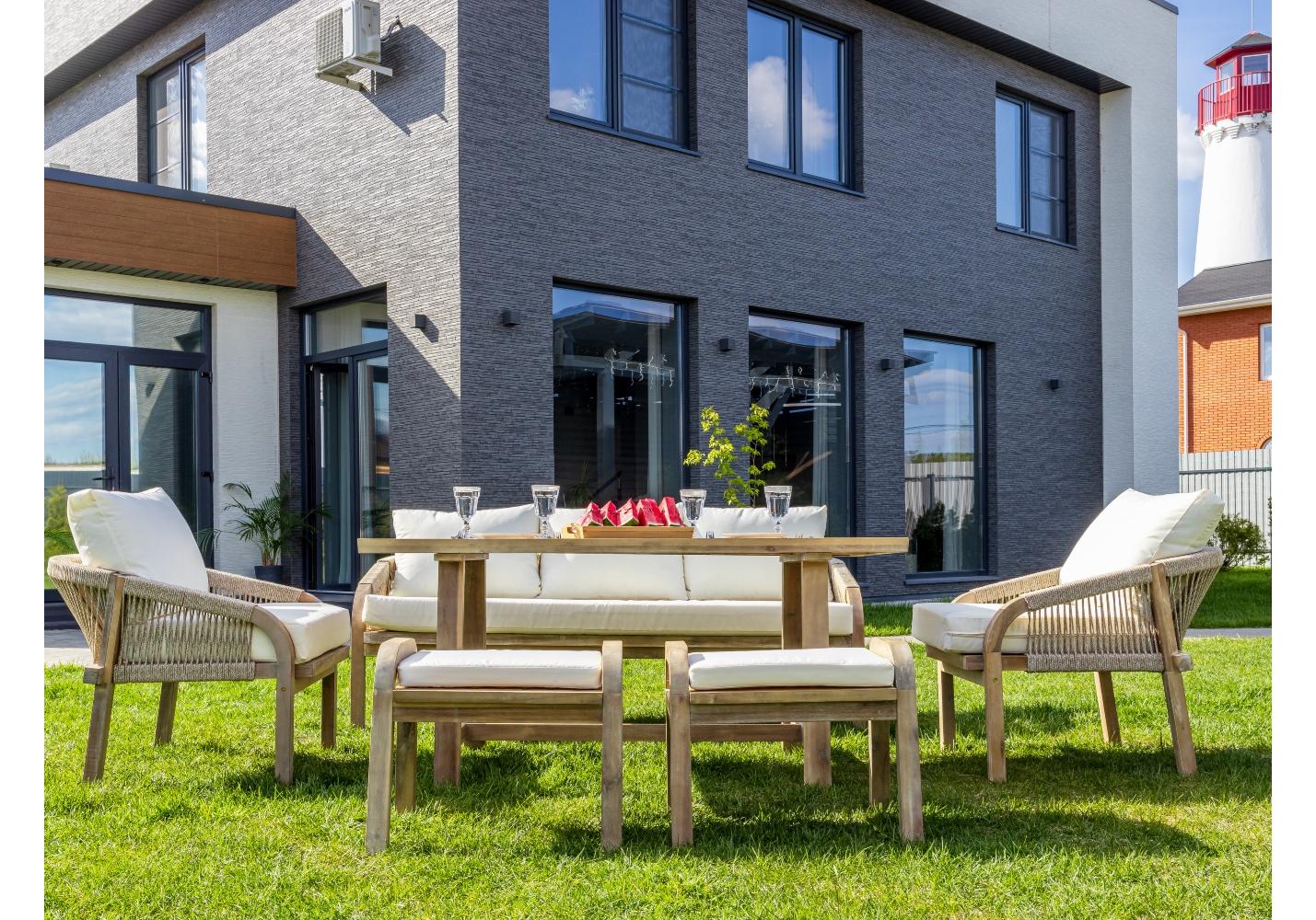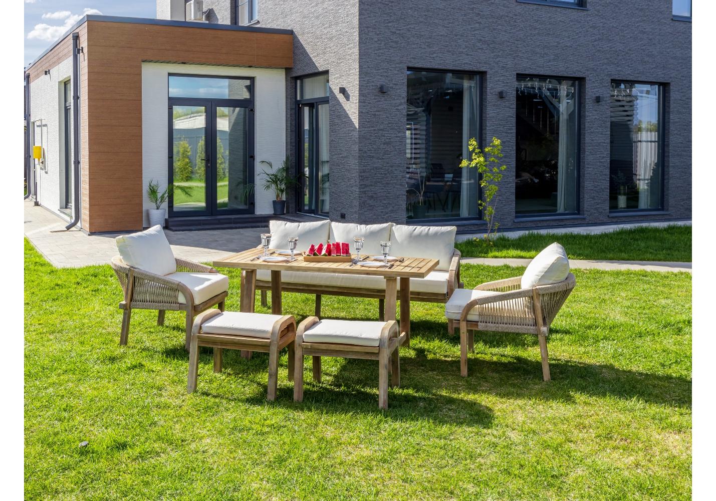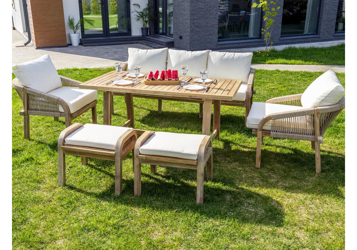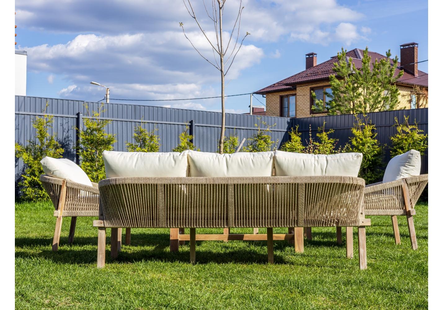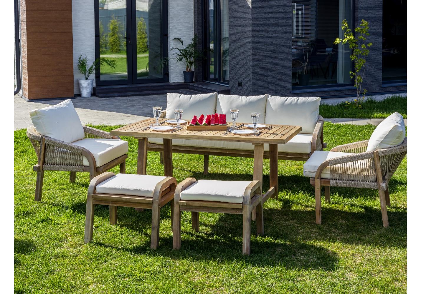 Обивка изготовлена из уличной веревки, а подушки имеют съемные чехлы из водоотталкивающей ткани. Наполнитель подушек для спины - синтетический пух, а для сидения - поролон. Цвет комплекта и подушек - стильный бежевый.