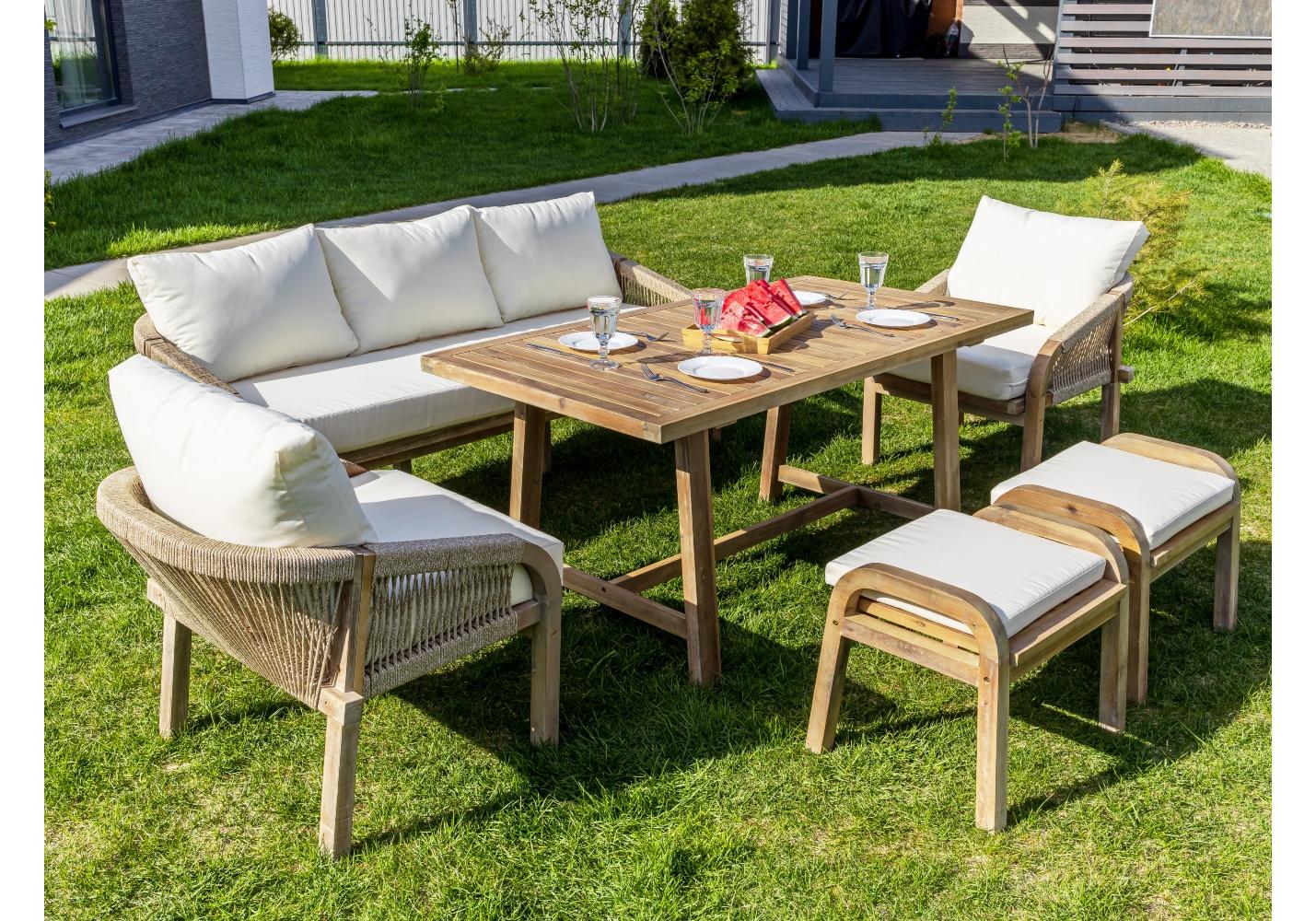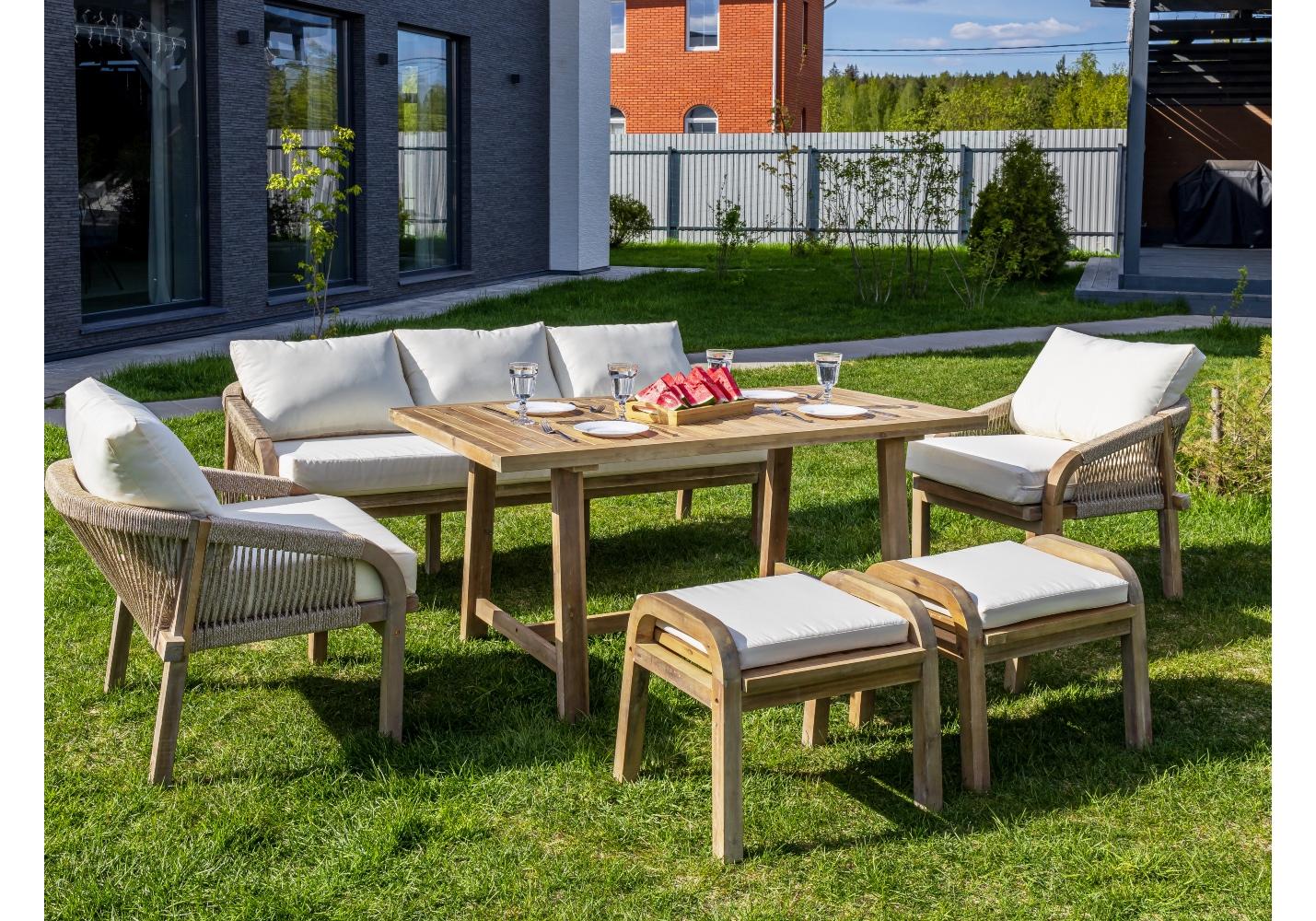 Этот комплект включает в себя стол, диван, два кресла и два пуфа, обеспечивая комфортное размещение до 7 человек.