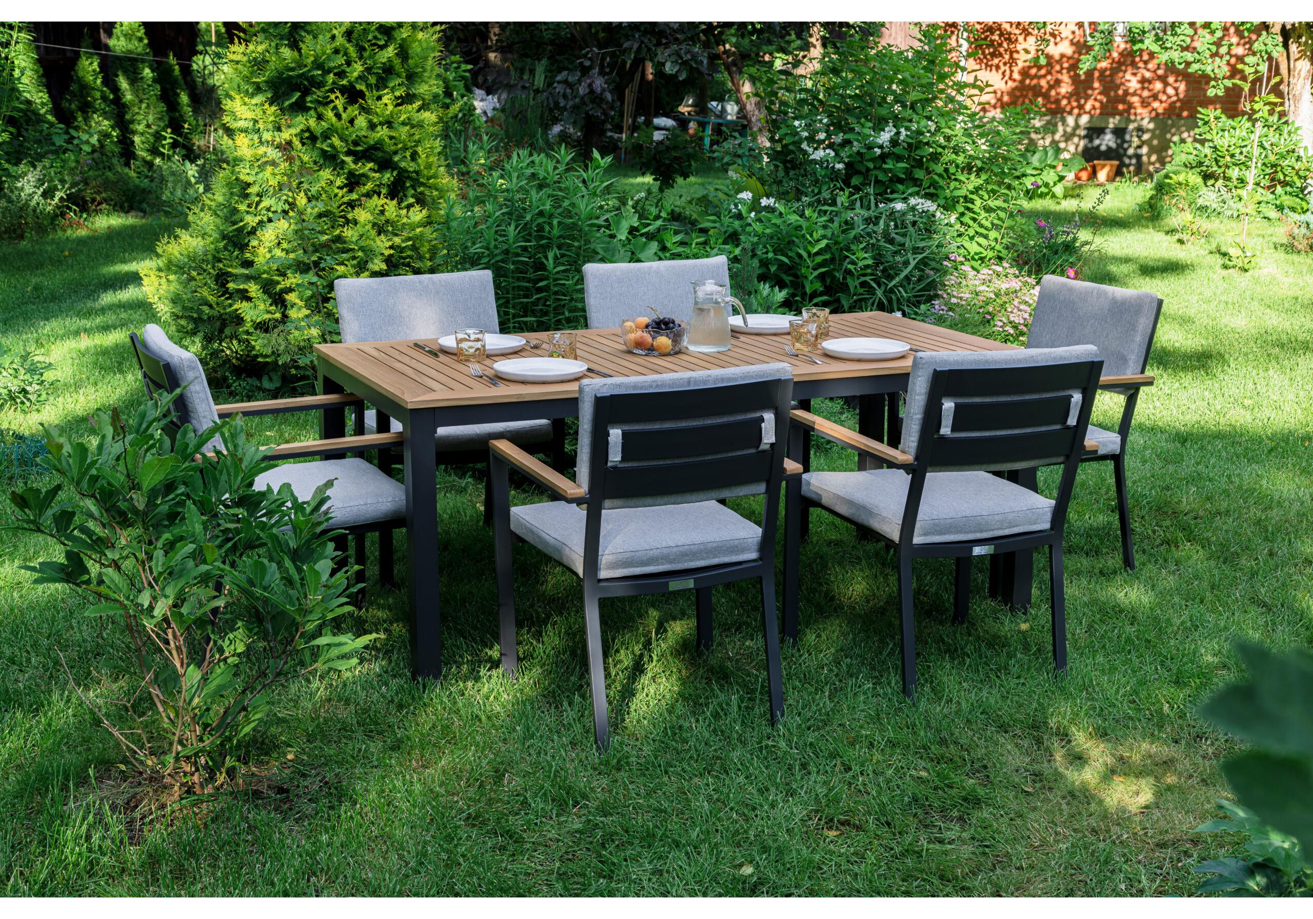 Столешница и подлокотники: Столешница выполнена из тика, что придает обеденному столу натуральный и изысканный вид. Тик также известен своей высокой стойкостью к влаге и ультрафиолетовому излучению, делая его идеальным для использования на открытом воздухе. Подлокотники кресел также выполнены из тика.