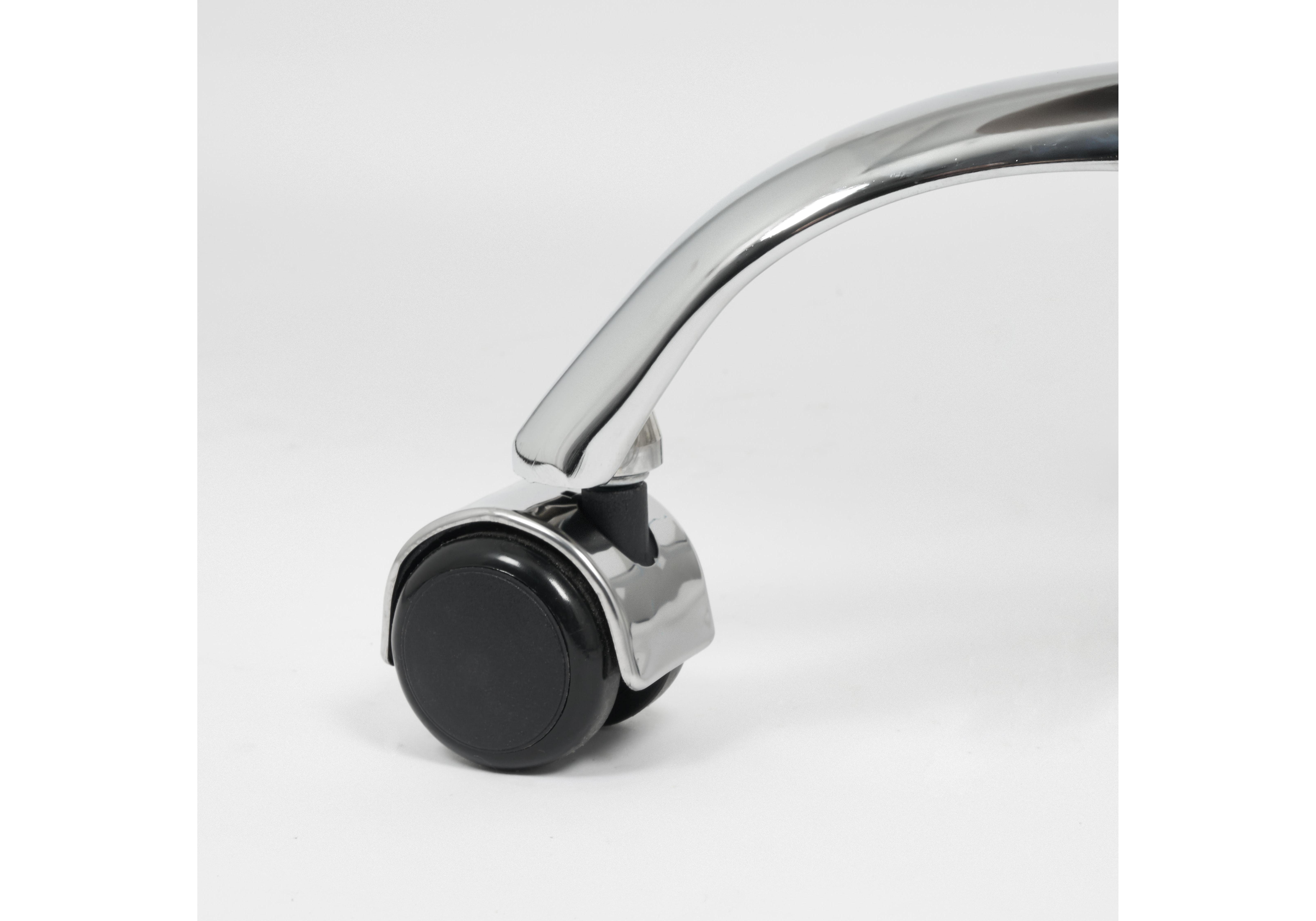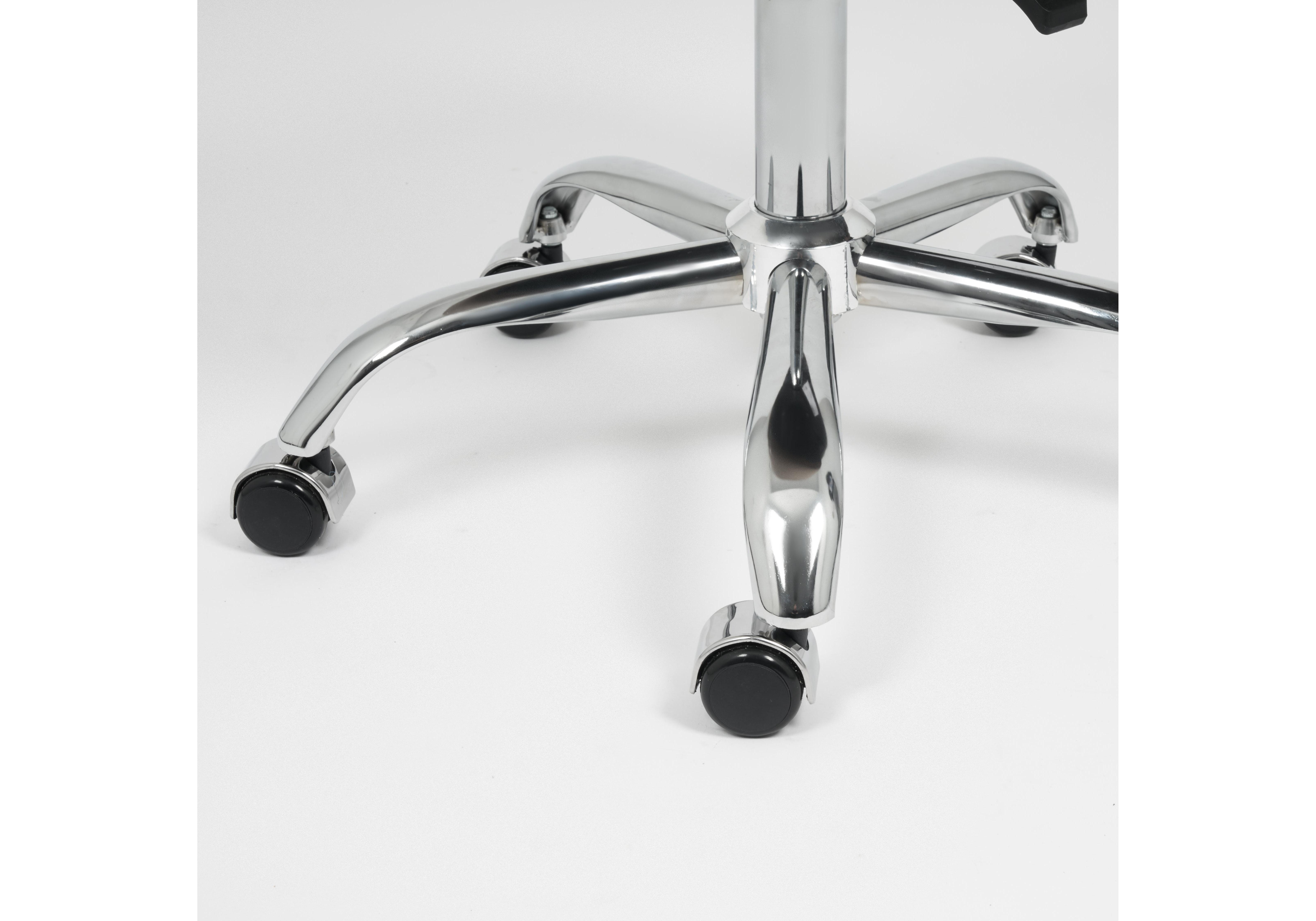 Механизм подъёма без функции качания. Без подлокотников. Крестовина хромированная. Ролики -прорезиненные с хромированной накладкой. Максимальная нагрузка 90 кг.